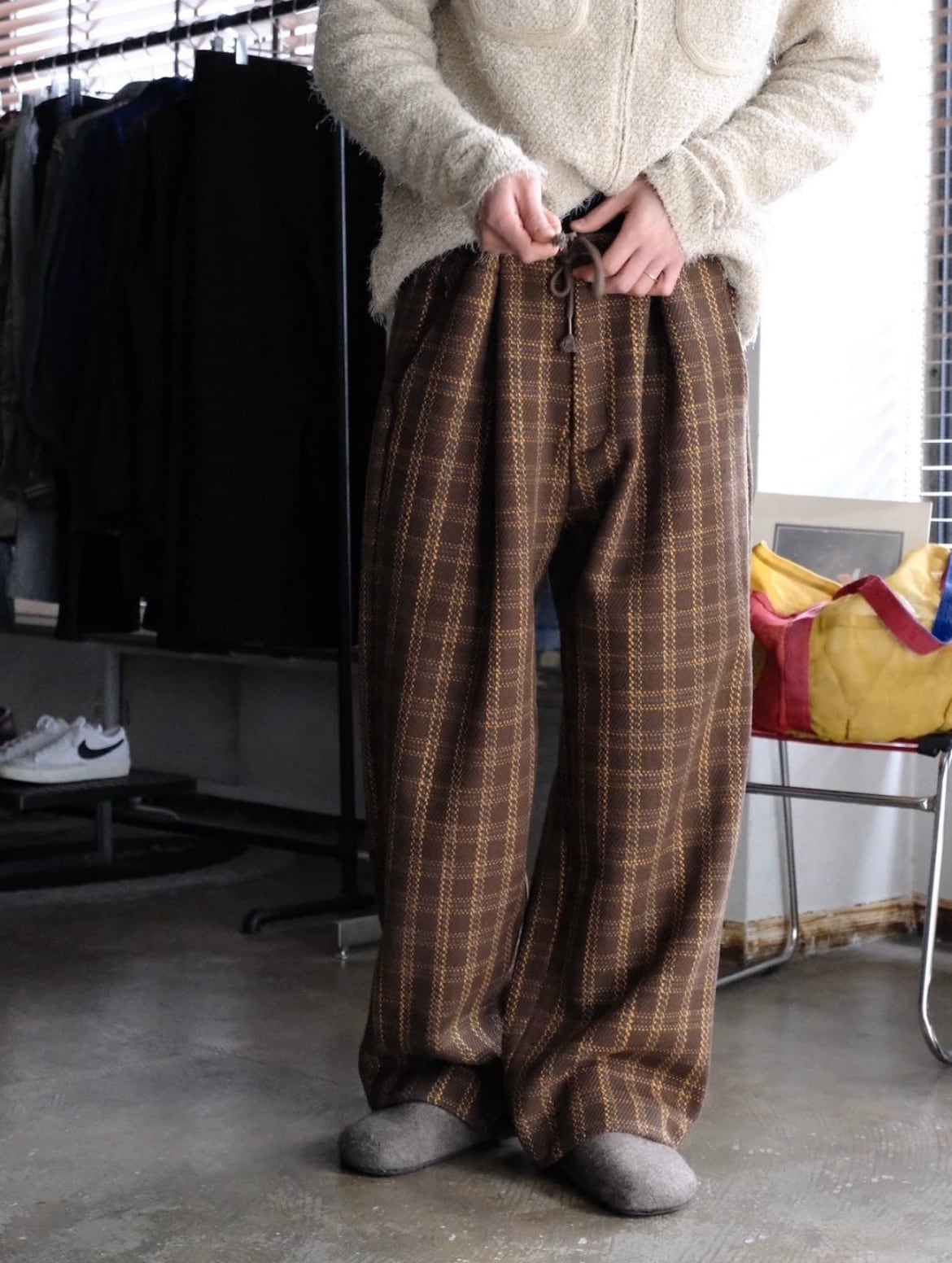 今シーズンのテーマにリンクしたナスカ文化のスプリング技法による斜経綾織をイメージして織ったオリジナルのツイード生地を使用し仕立てたパンツ。 1/10を4本撚る事でボリュームを出しながら表面が綺麗に見えるように丁寧に職人が織っている。 ハイウエスト部分で紐を締めて履く仕様になっており激しい動きでもパンツのズレが出ないように工夫されたパターンになっている。 シルエットは、少し過度な太さの綺麗なストレートシルエット。