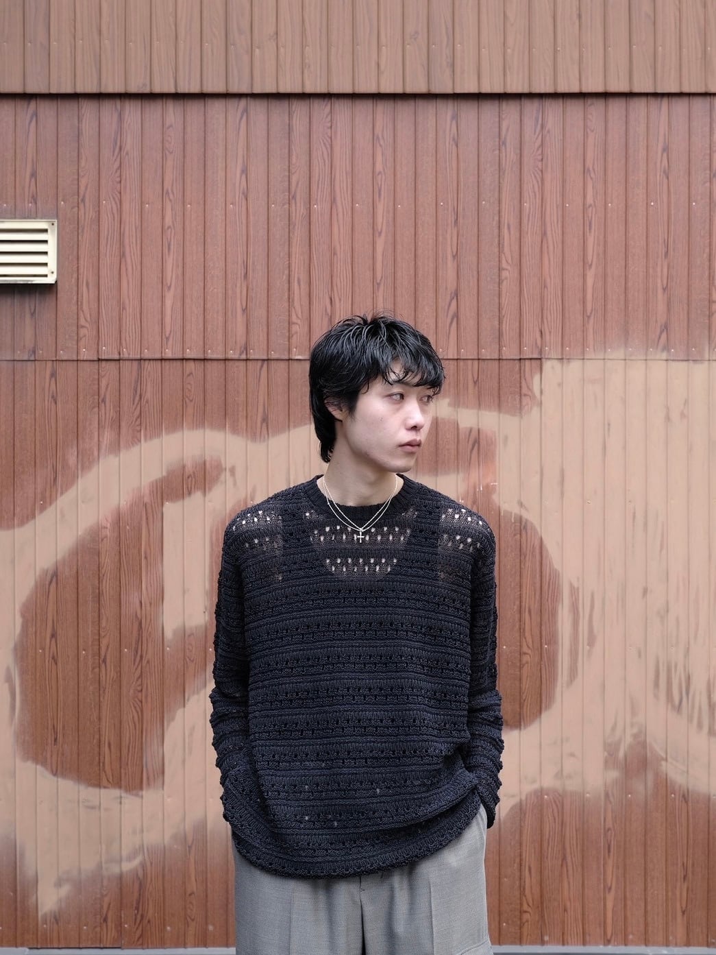 麻の様なドライタッチを再現したポリエステルと和紙のオリジナルの柄のメッシュクルーネックニット。 清涼感に優れている糸の肌触りと凹凸感のある表情が特徴的です。 一見シンプルに見えるぱたーんも全ての線を人体に馴染むように立体的に曲線で数mm単位で調整し縫製されています。 優れた給水速乾の機能性と防シワ性など利便性がありとても使いやすい1枚です。