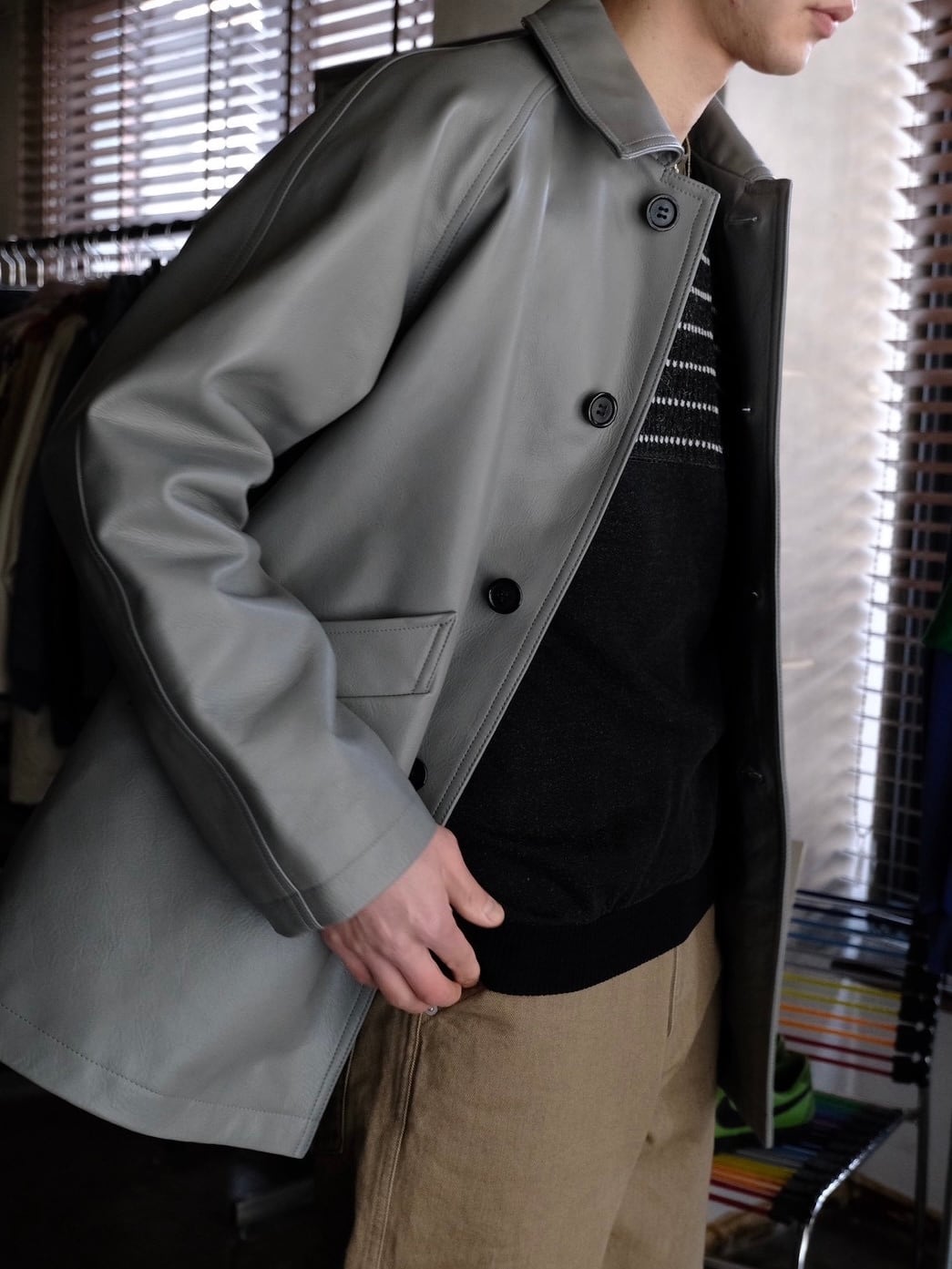 ステアハイドレザーを使用したレザージャケットです。 上質な国産カウレザーを使用したレザーブルゾン。 表面には灰色のセミアニリン塗装を施してあります。 厚塗りではなくすっきりと仕上げているため、経年と共に徐々にベースのグレー色が出てきて変化を楽しめます。 鞣しは植物タンニン多めのコンビネーション鞣しを採用しており、さらにワックスを多めに含浸させているため使用と共に身体になじんでいく仕様です。 バックにはプリーツが入っており上品かつ少しボリュームのあるシルエットを楽しんでいただけます。 着込むほどに内側の色味とのコントラストと風合いが増し、 より深く経年変化を楽しめる1着です。