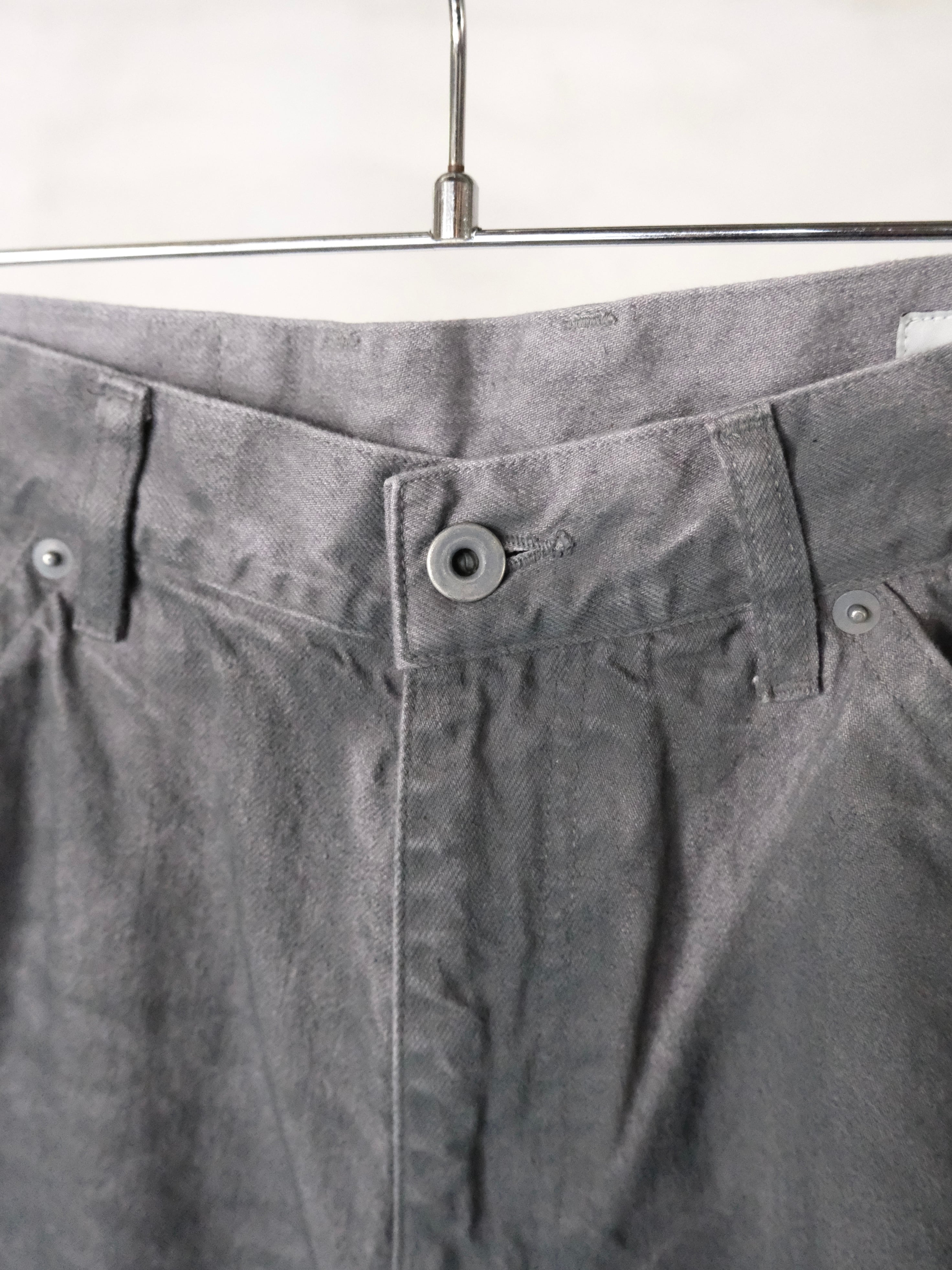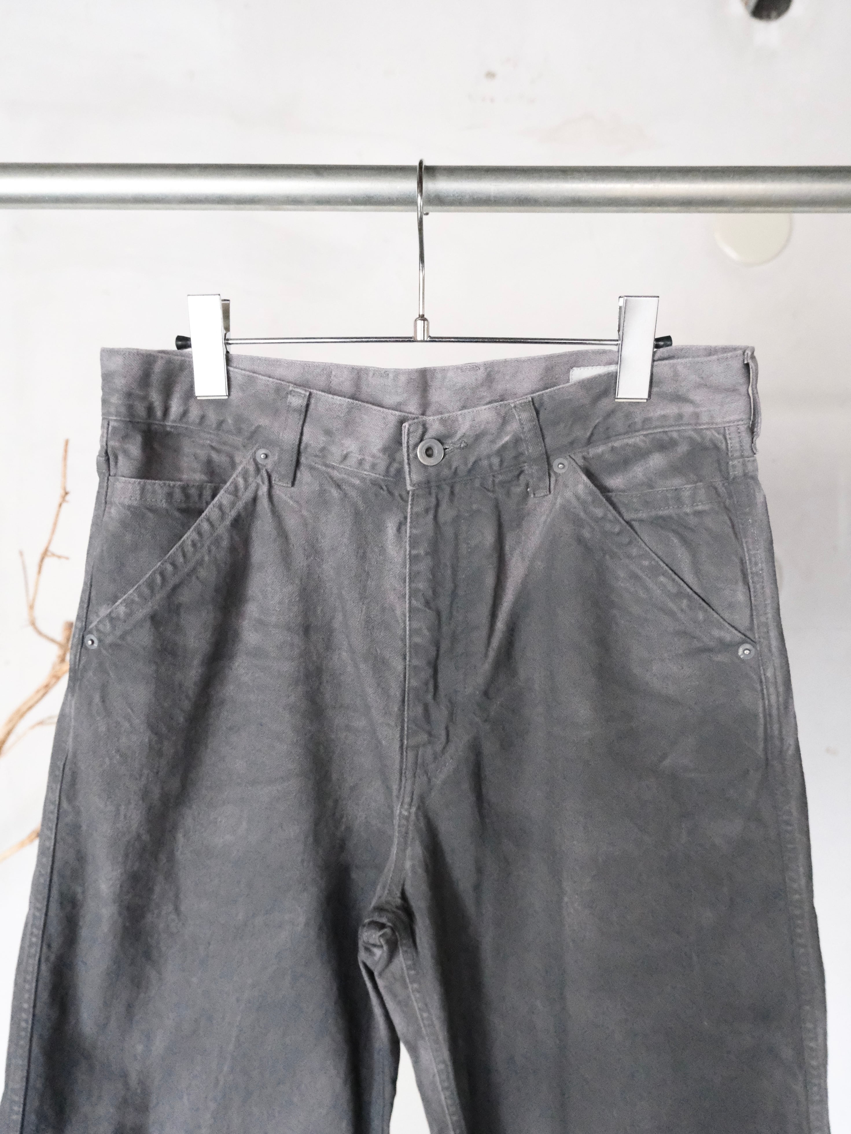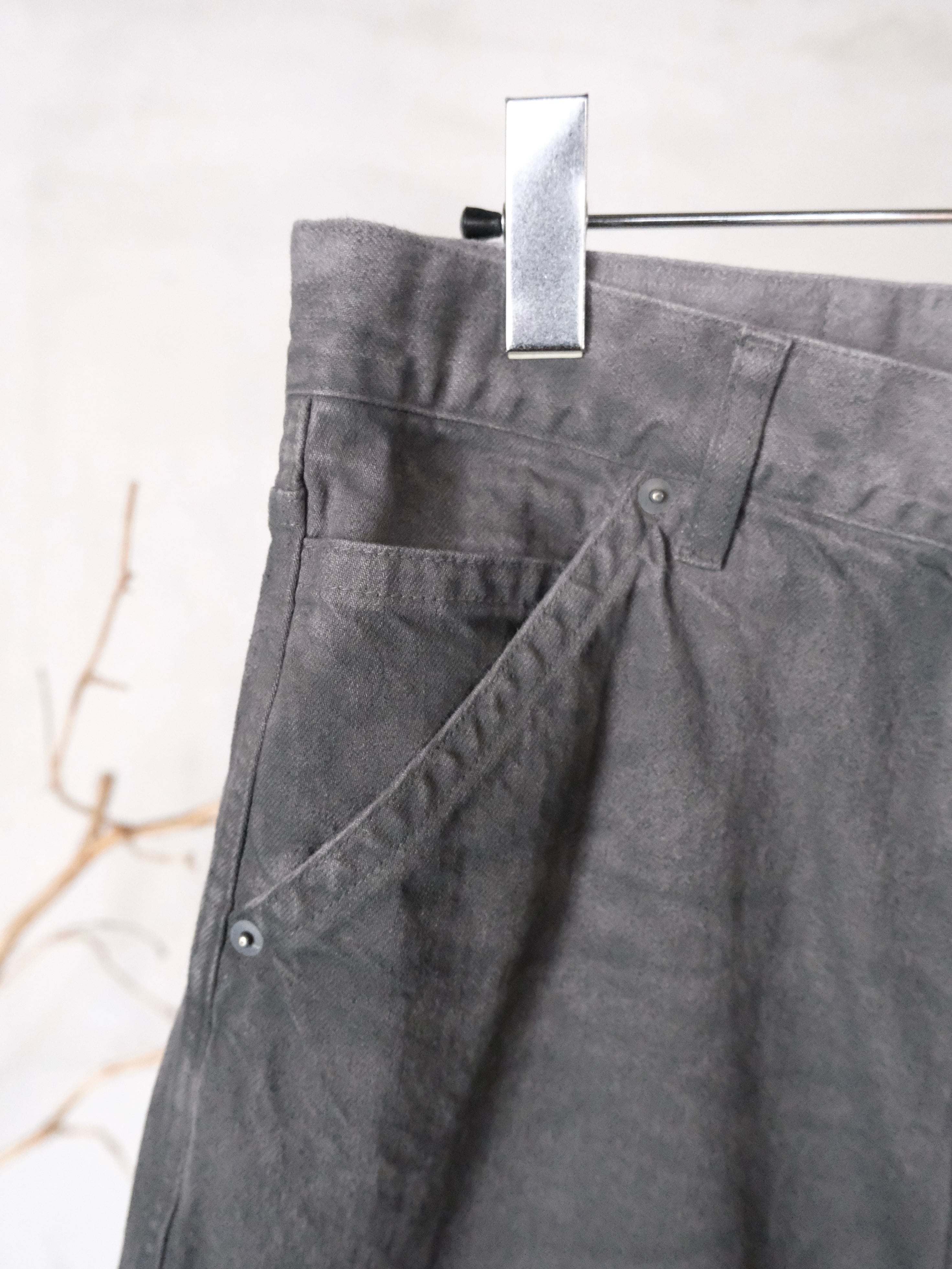 ボディの素材はデニム生地になっており,グレー色のデニム生地で縫い立てた後、ワンウォッシュを施し生地の陰影を際だて、上から顔料を吹きつけて染色しております。