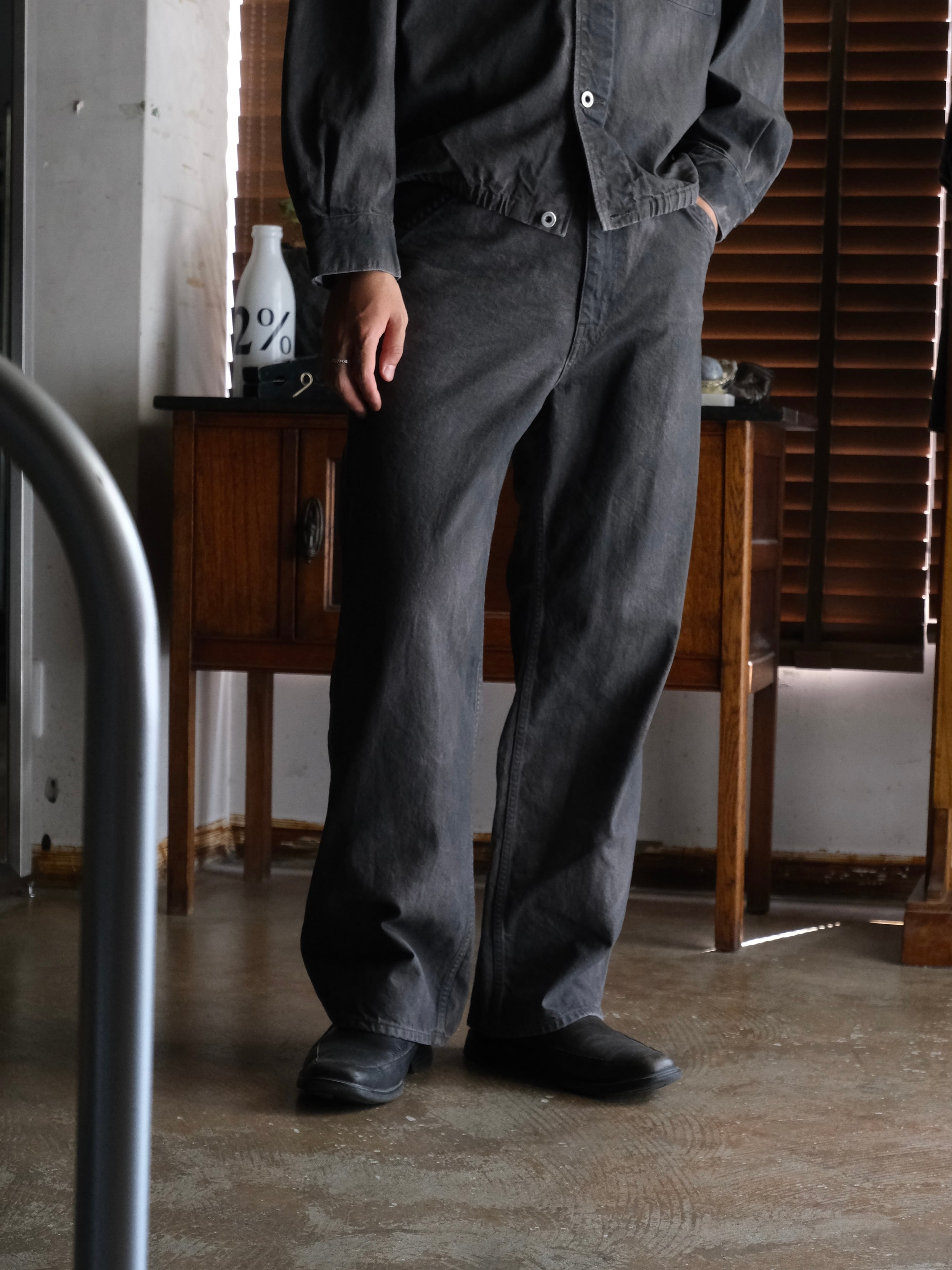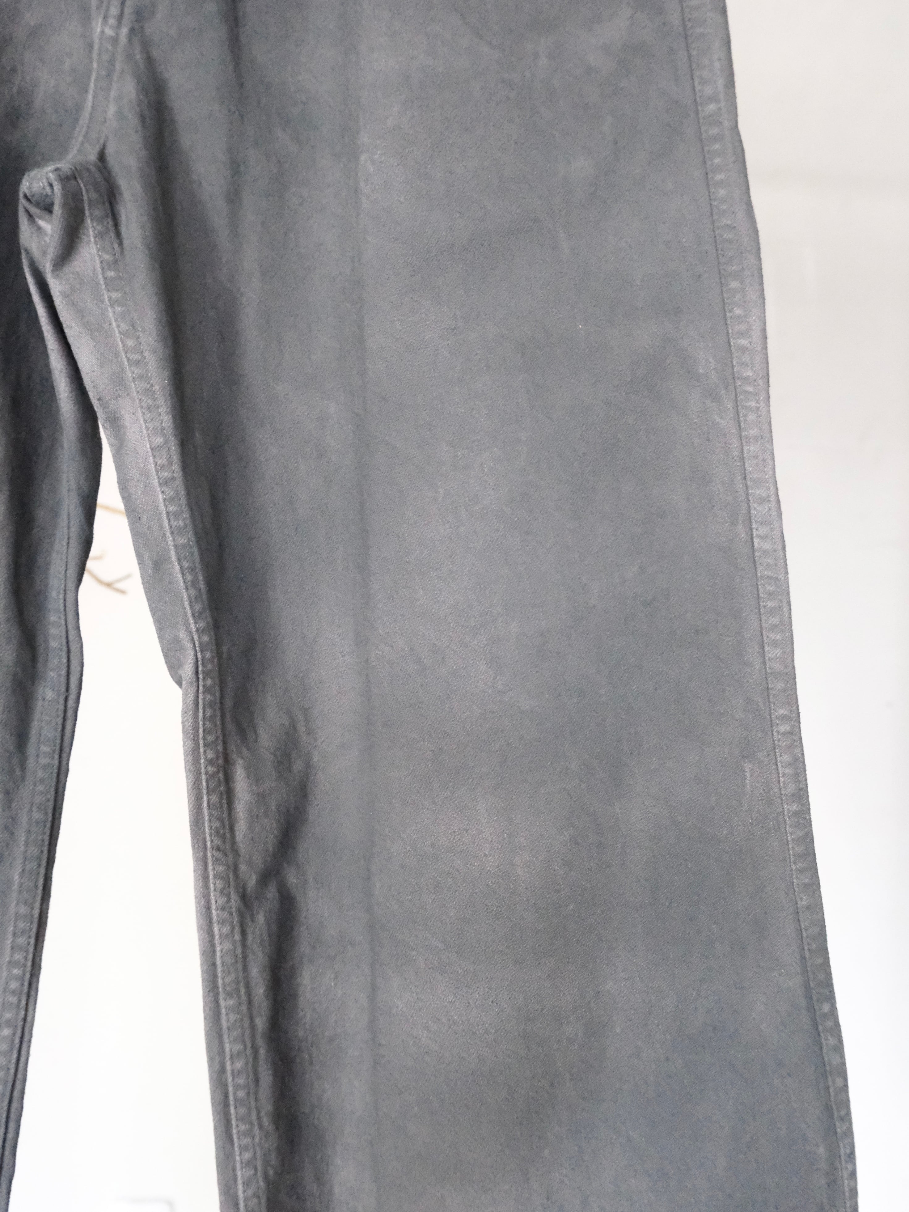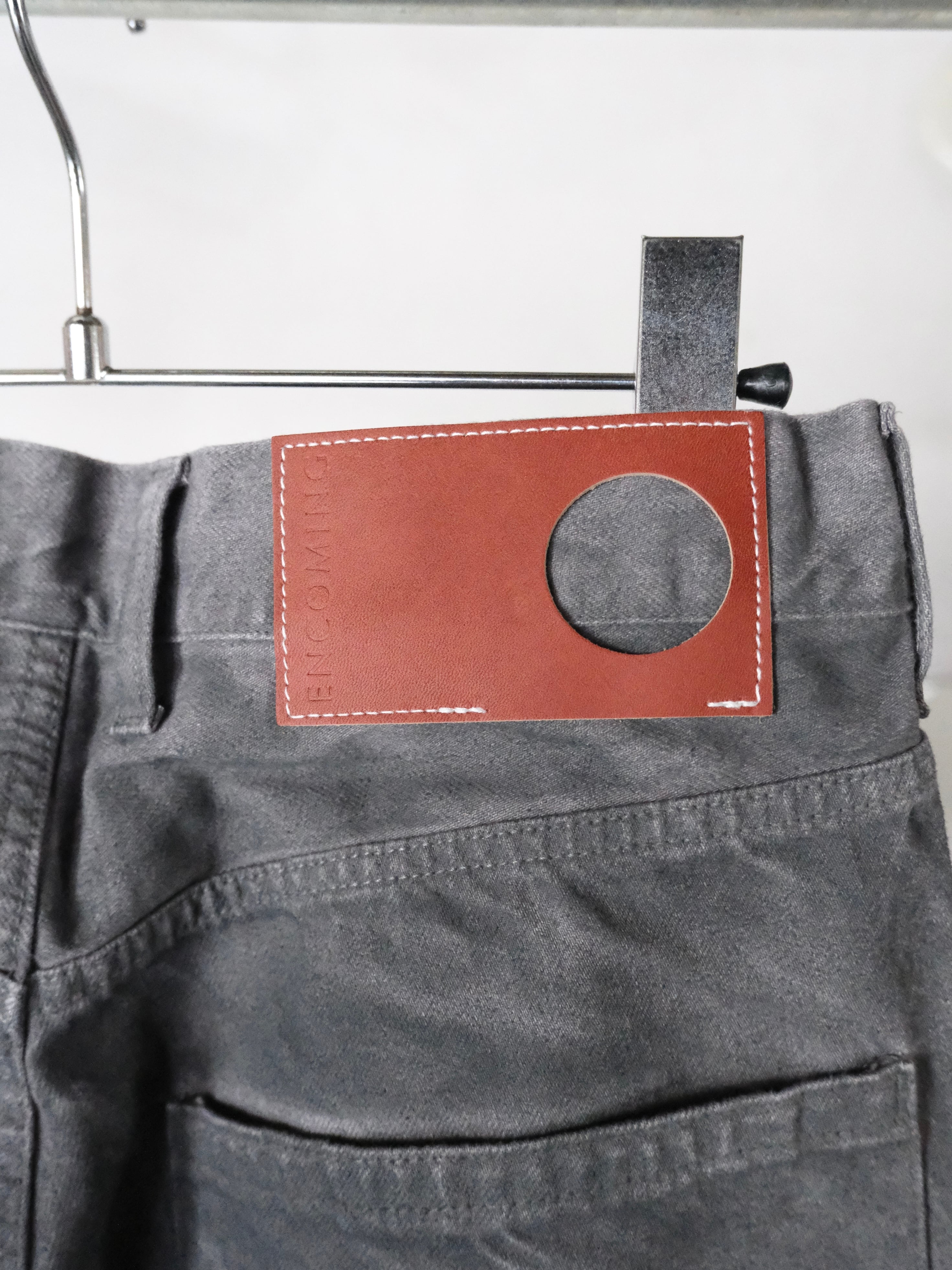 ボディの素材はデニム生地になっており,グレー色のデニム生地で縫い立てた後、ワンウォッシュを施し生地の陰影を際だて、上から顔料を吹きつけて染色しております。