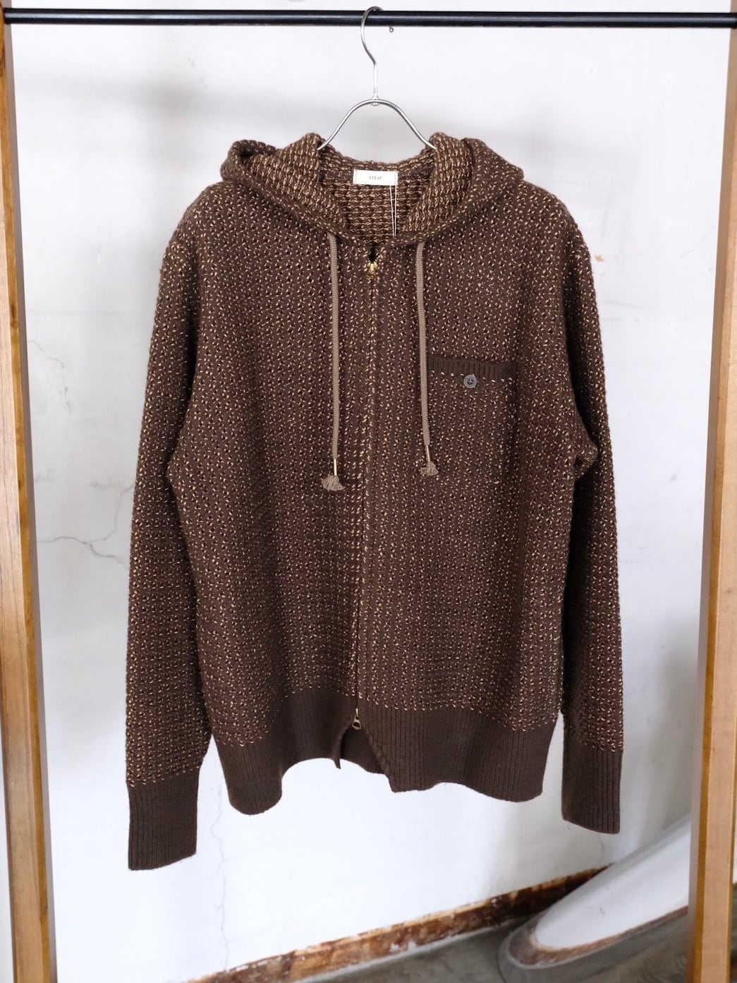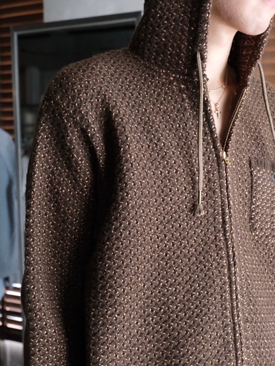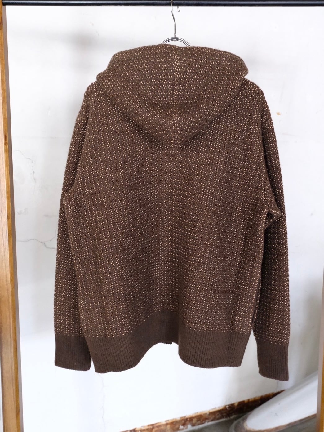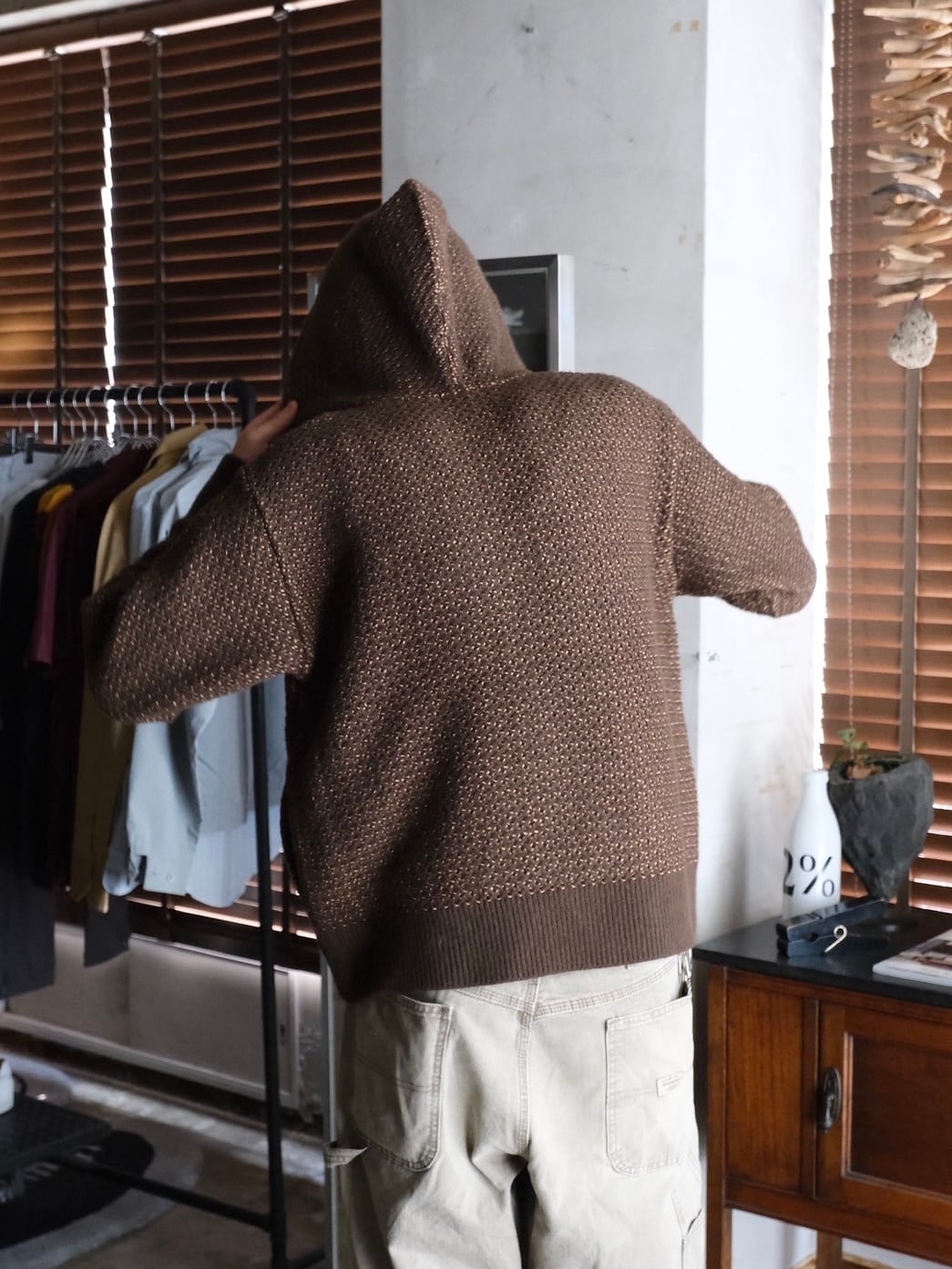 今期をイメージさせる5Gの2色のジャガード柄の交差編みのニットパーカー。