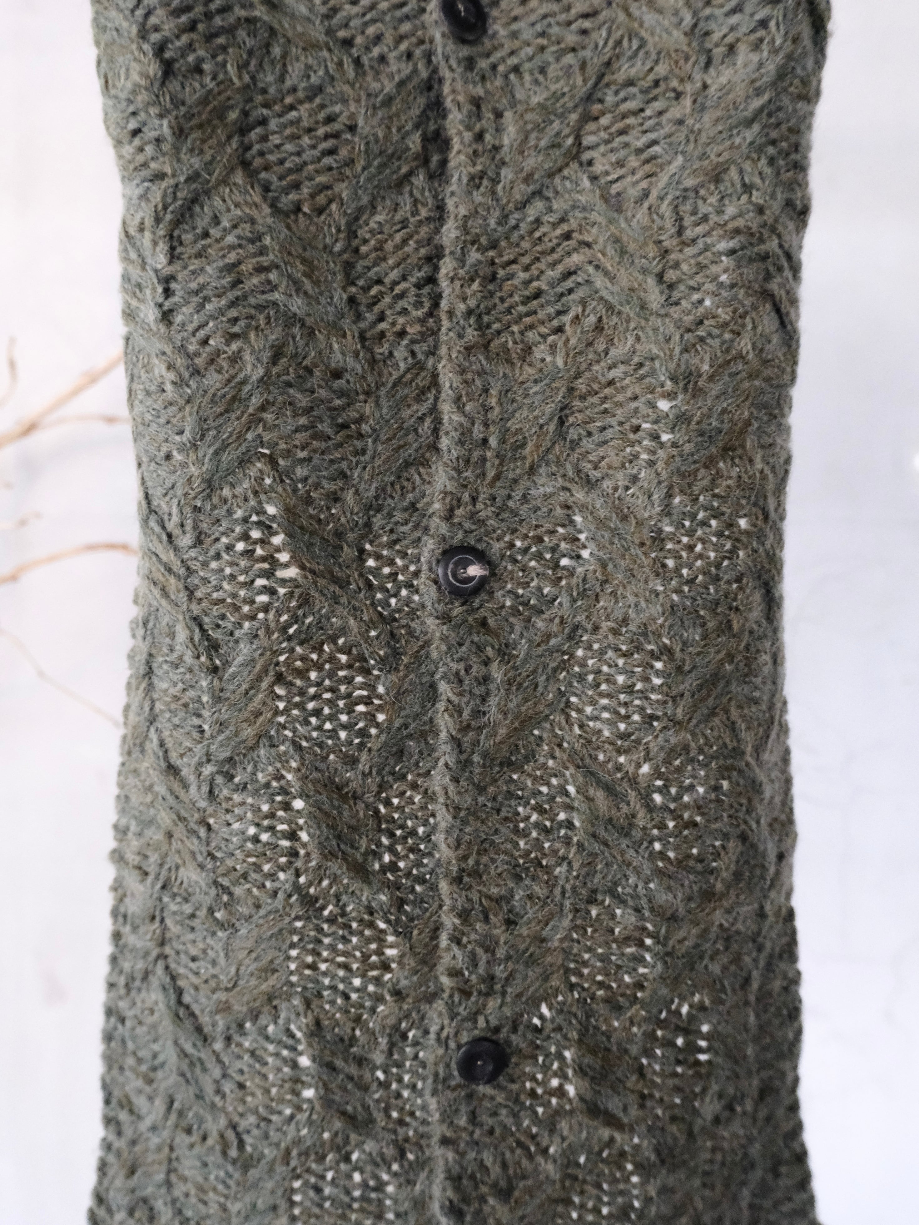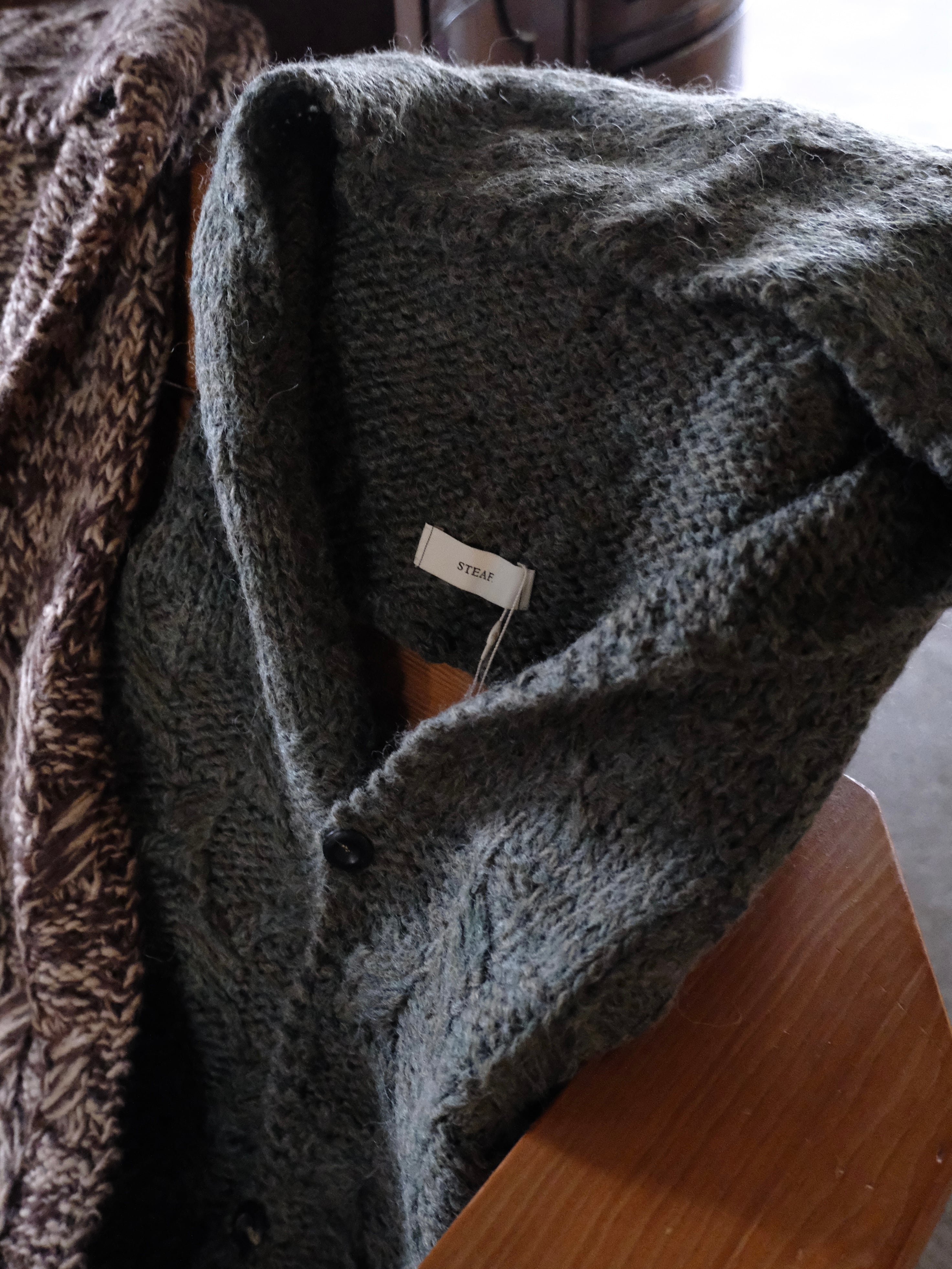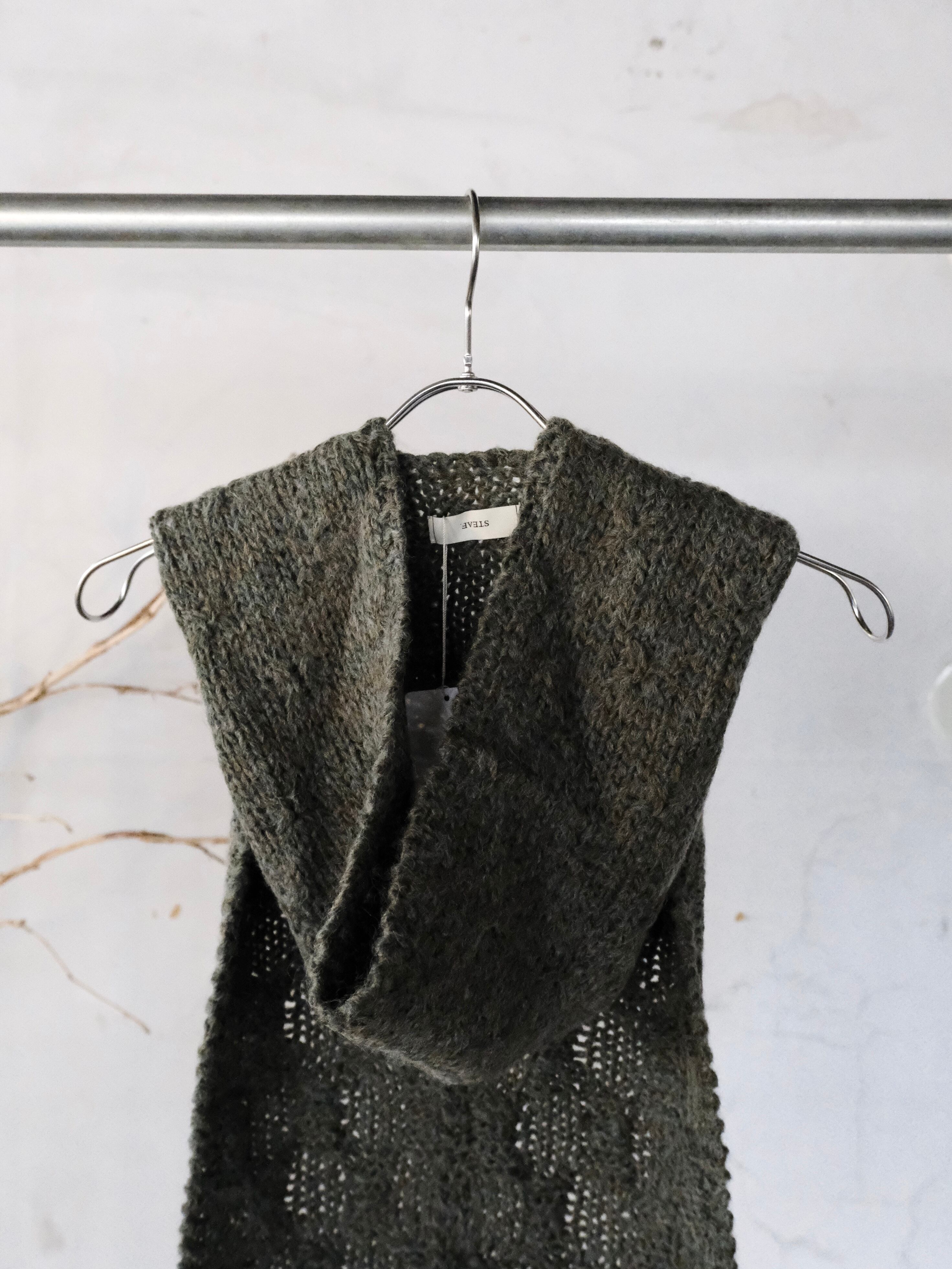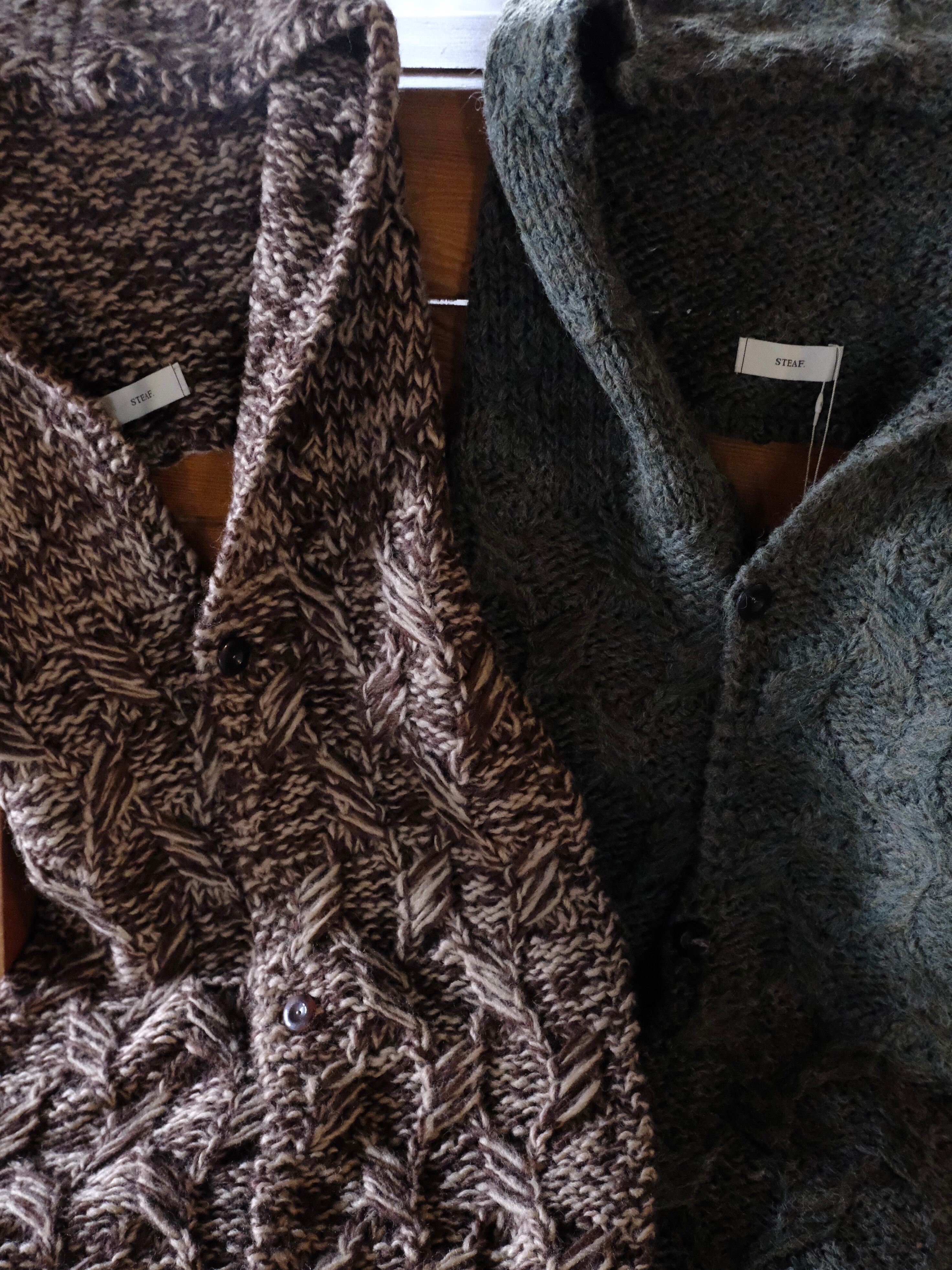 STEAFらしくフロントにはボタンが付いており、ボタンを閉めてアウターの下に着用するとフード付きのニットをレイヤードしているかのように見えるデザイン。
