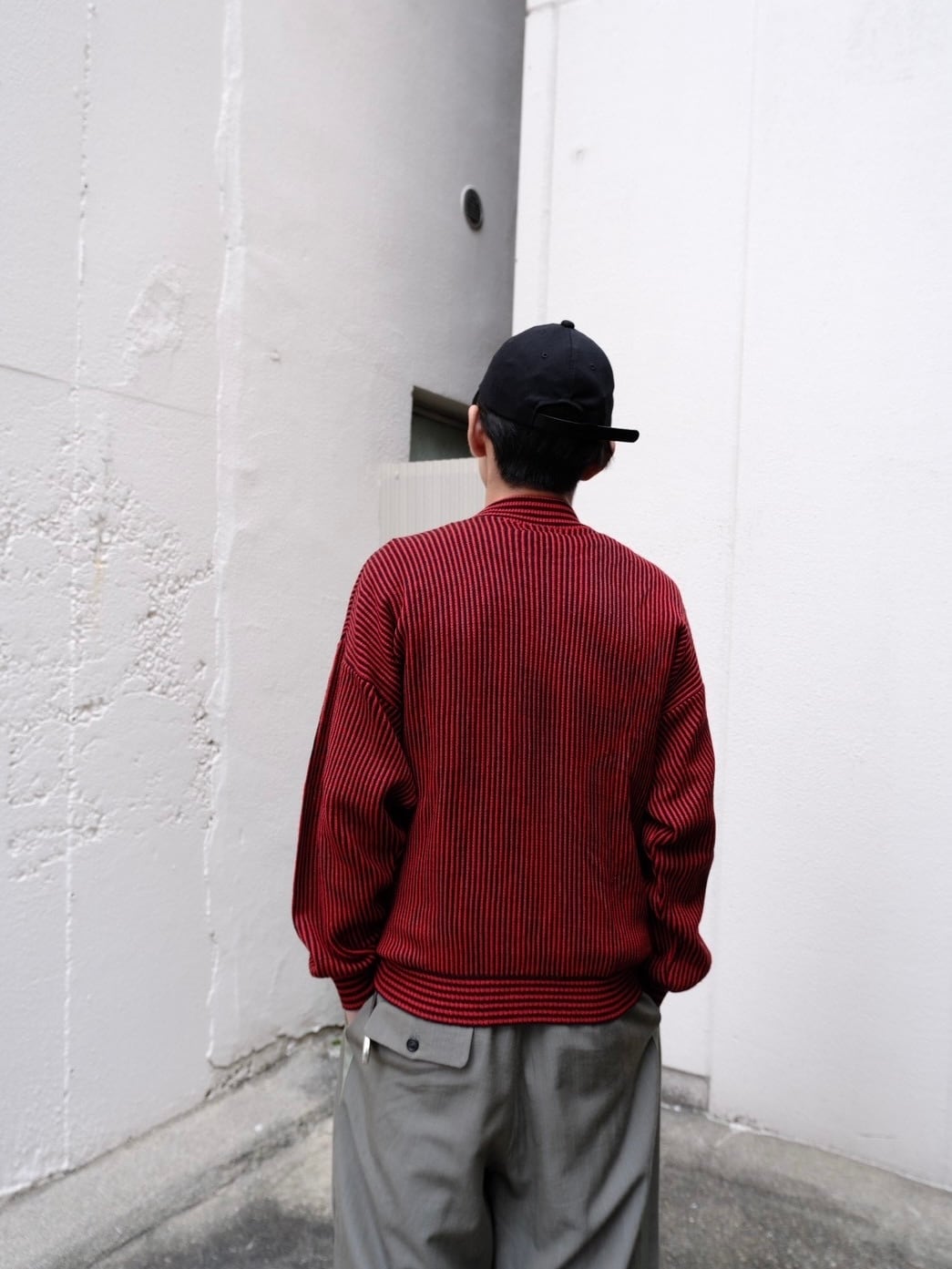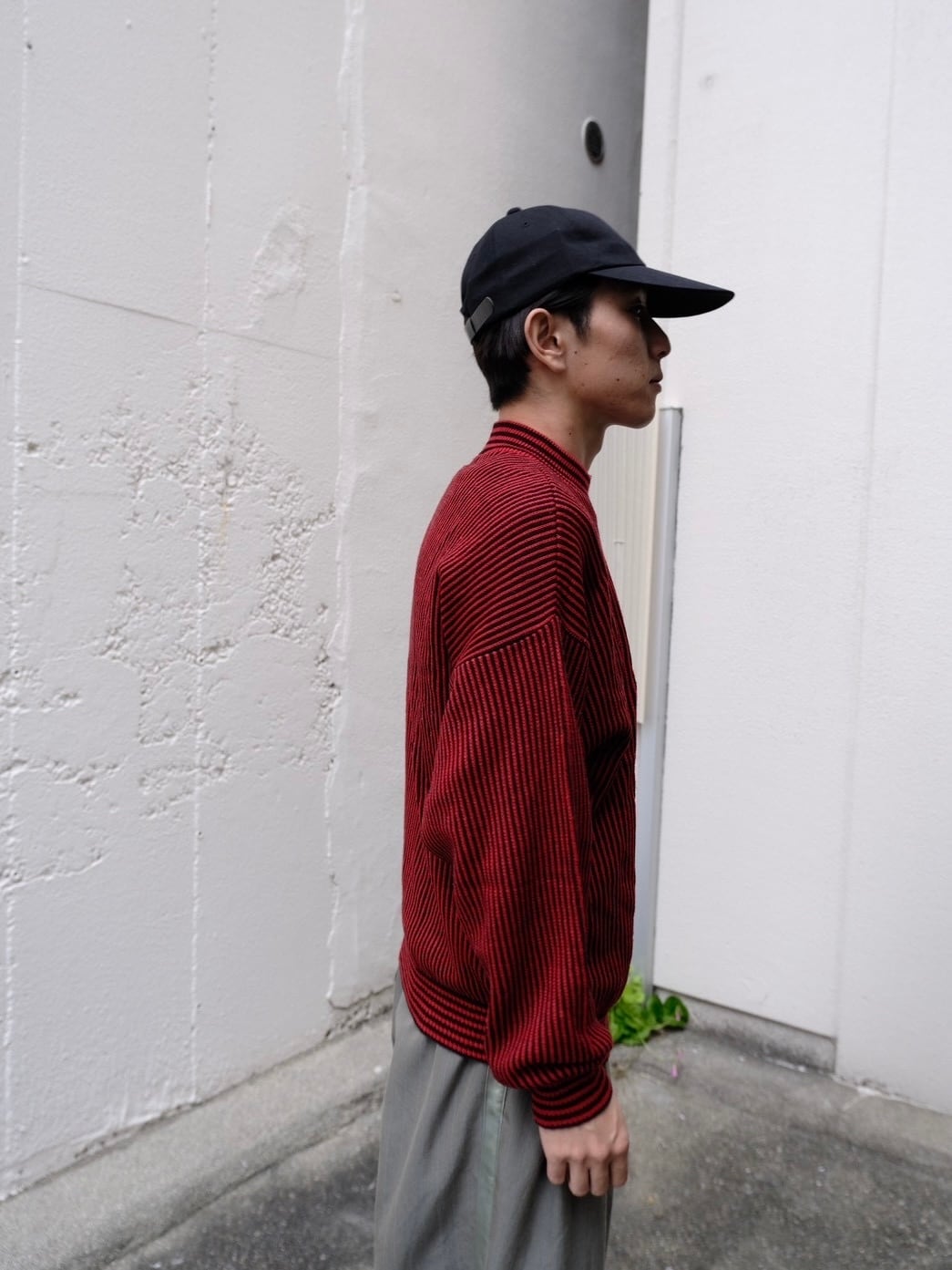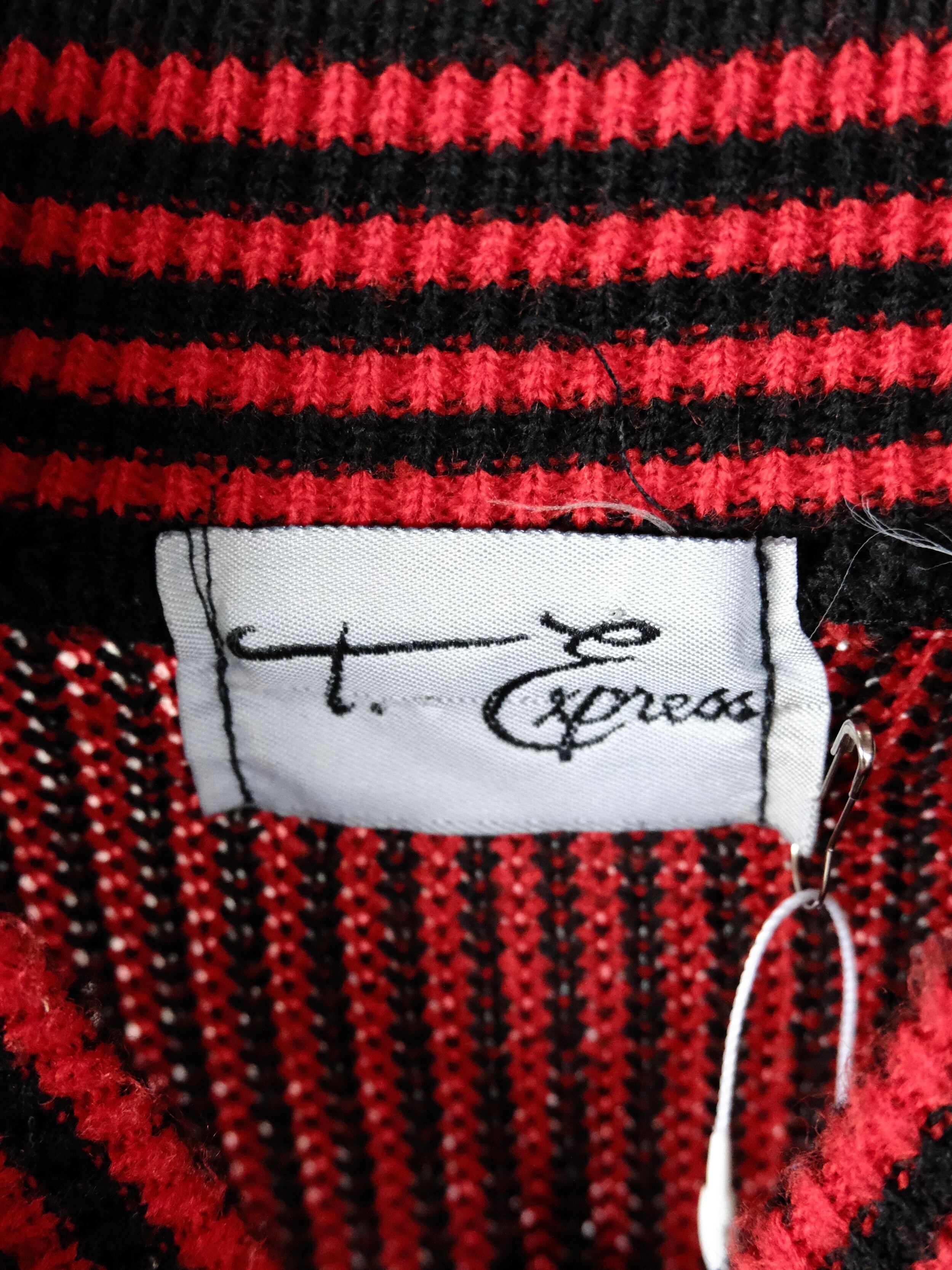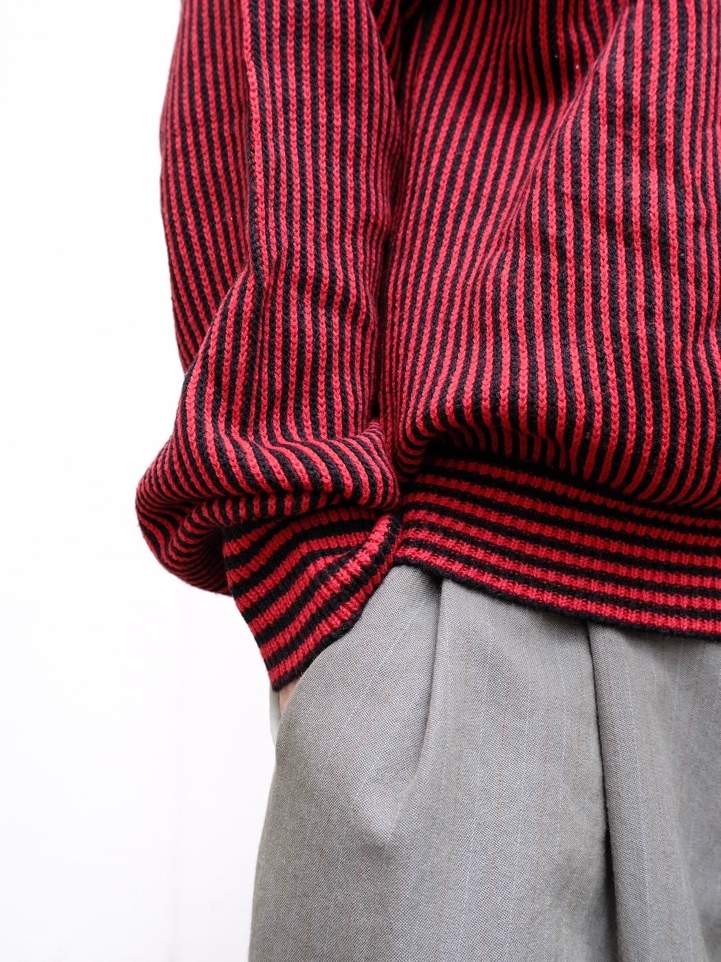 レッド×ブラックのストライプ柄ニット