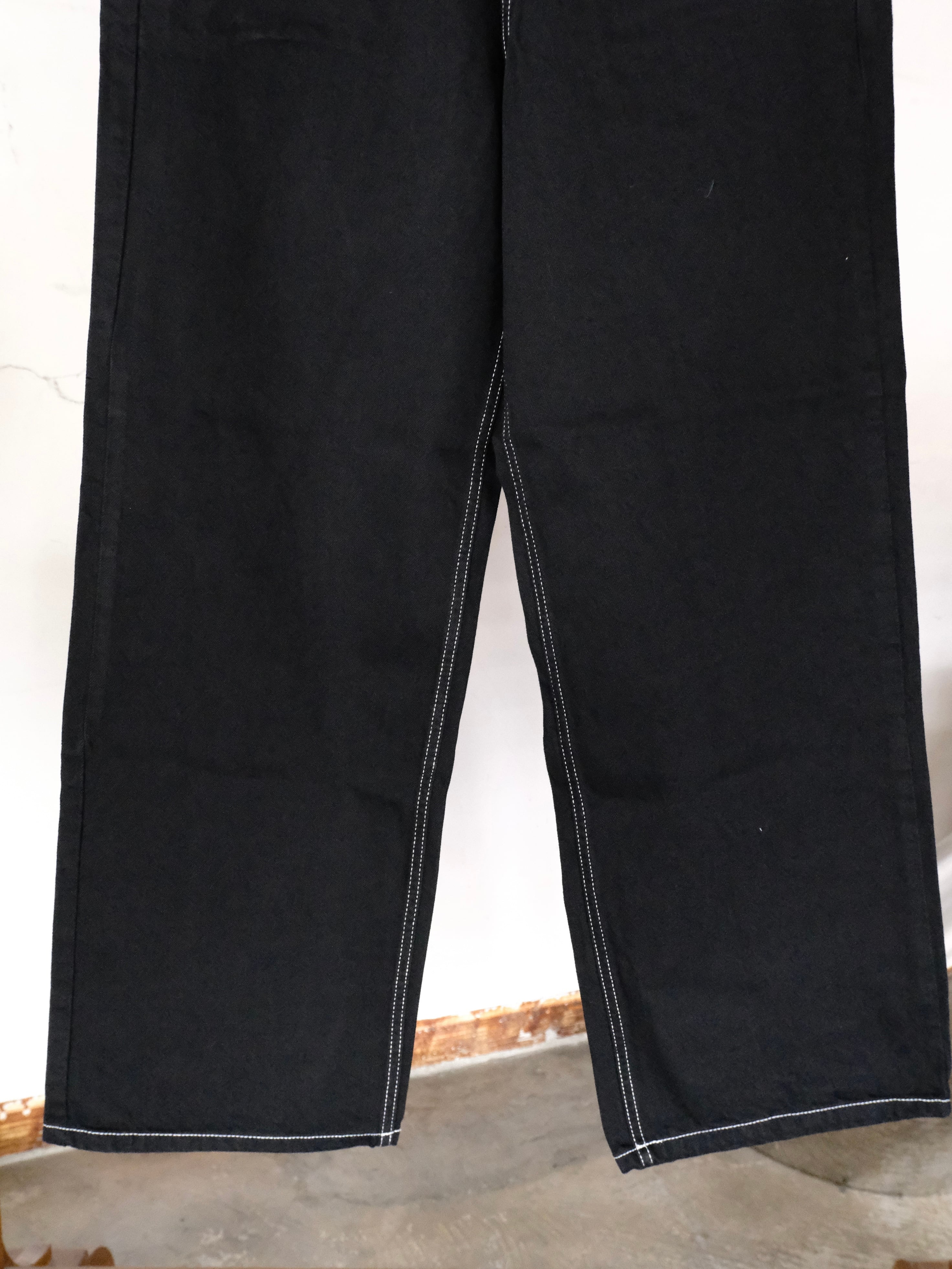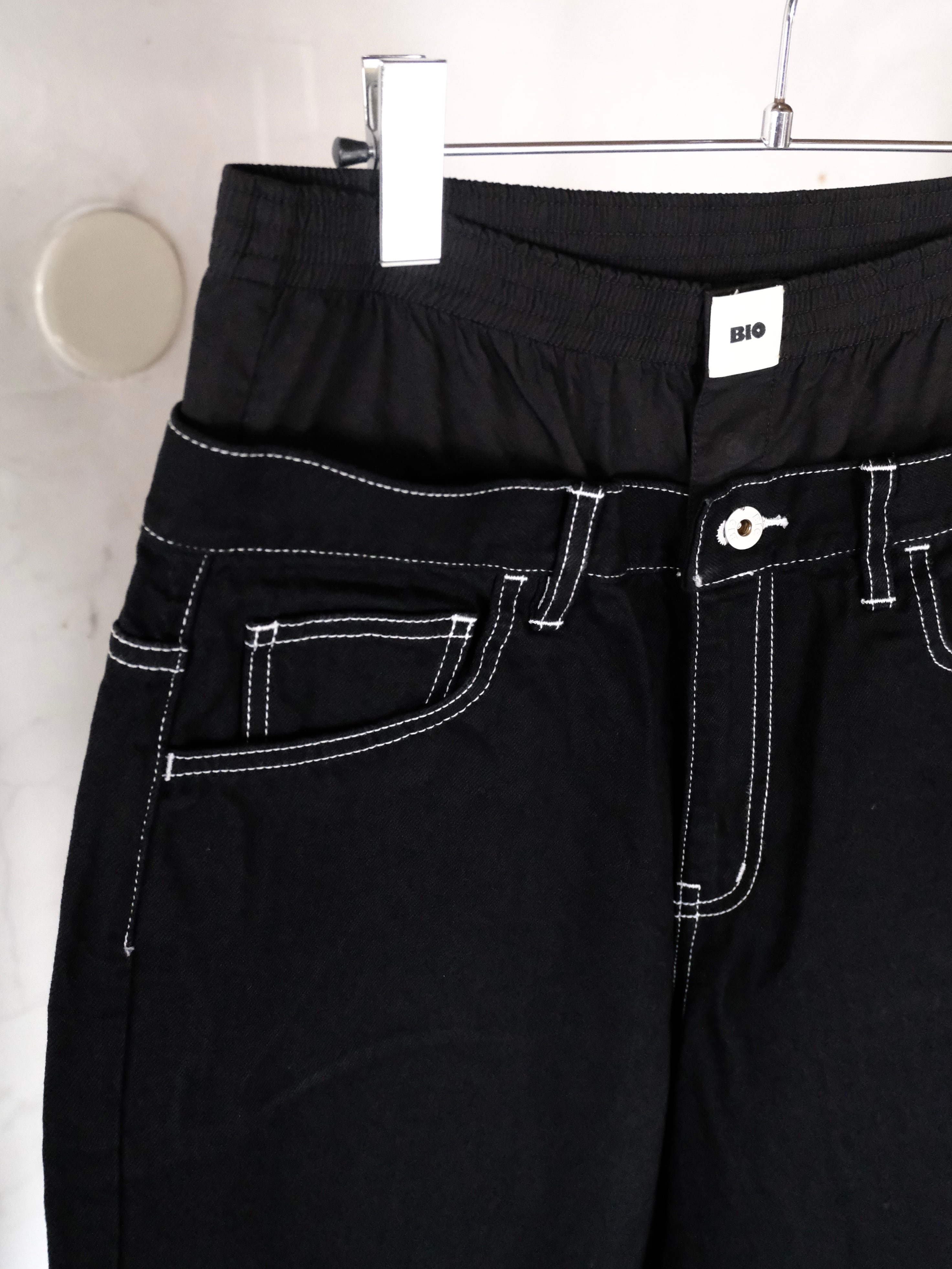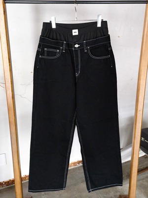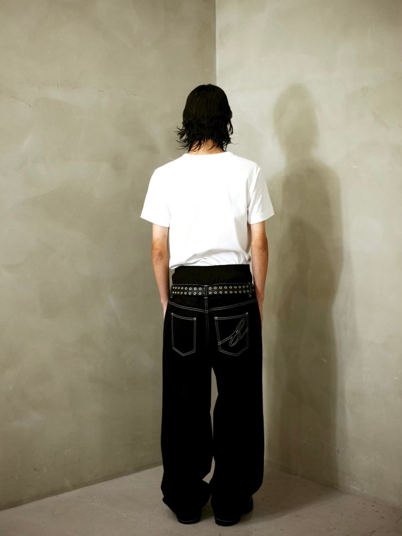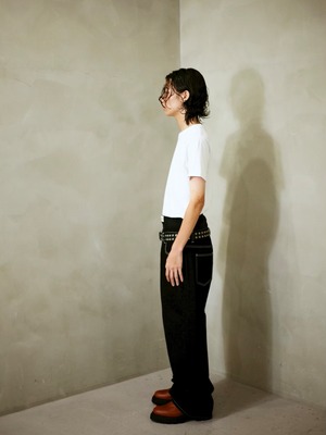 SERIES1で初登場し、定番化したアンダーウェアドッキングジーンズ。いつものウエスト位置で着用して頂くと腰履きしているようなルックスのワイドジーンズ。定番色のインディゴに加えて、ブラックにホワイトステッチからお選びください。
