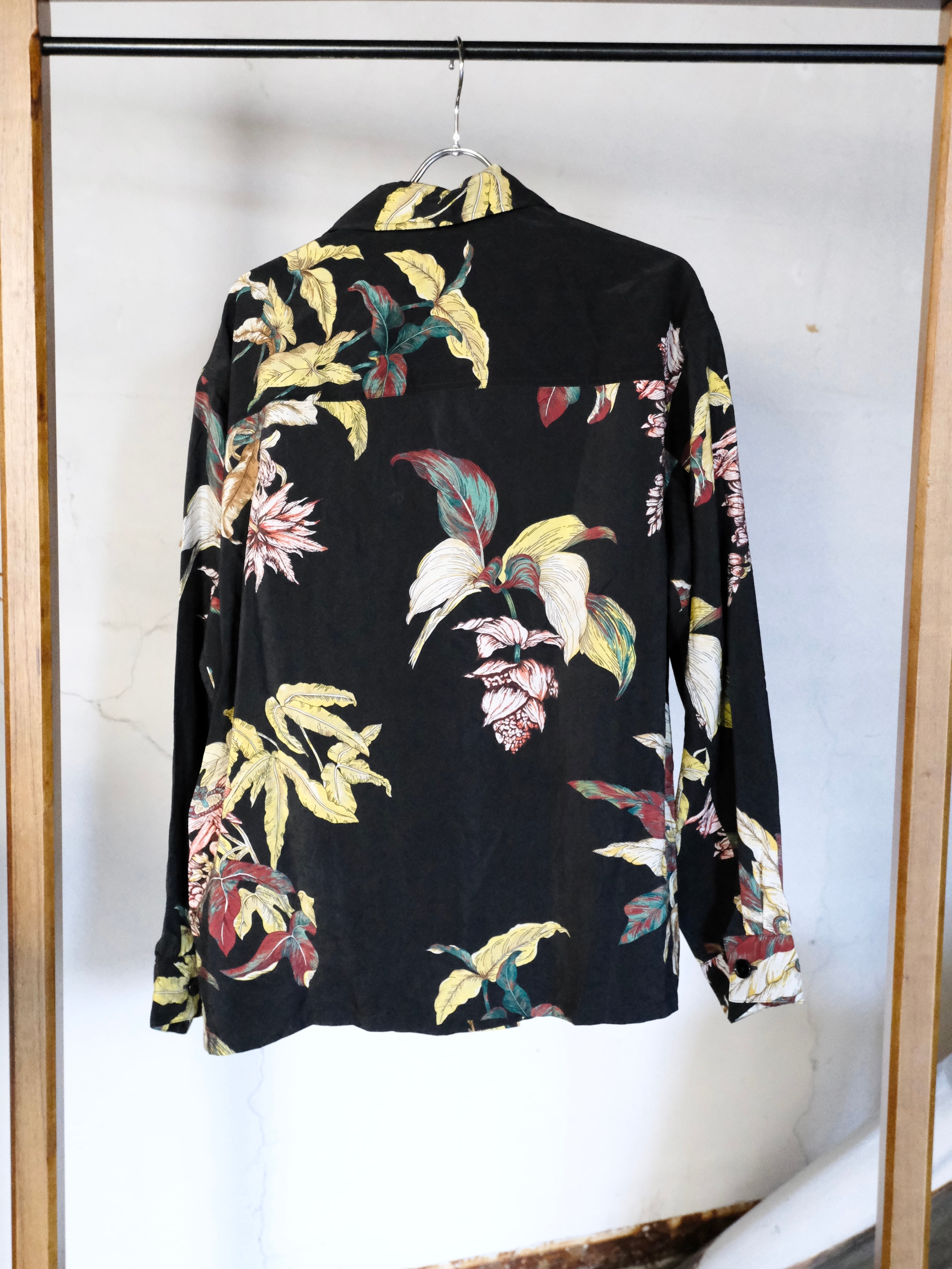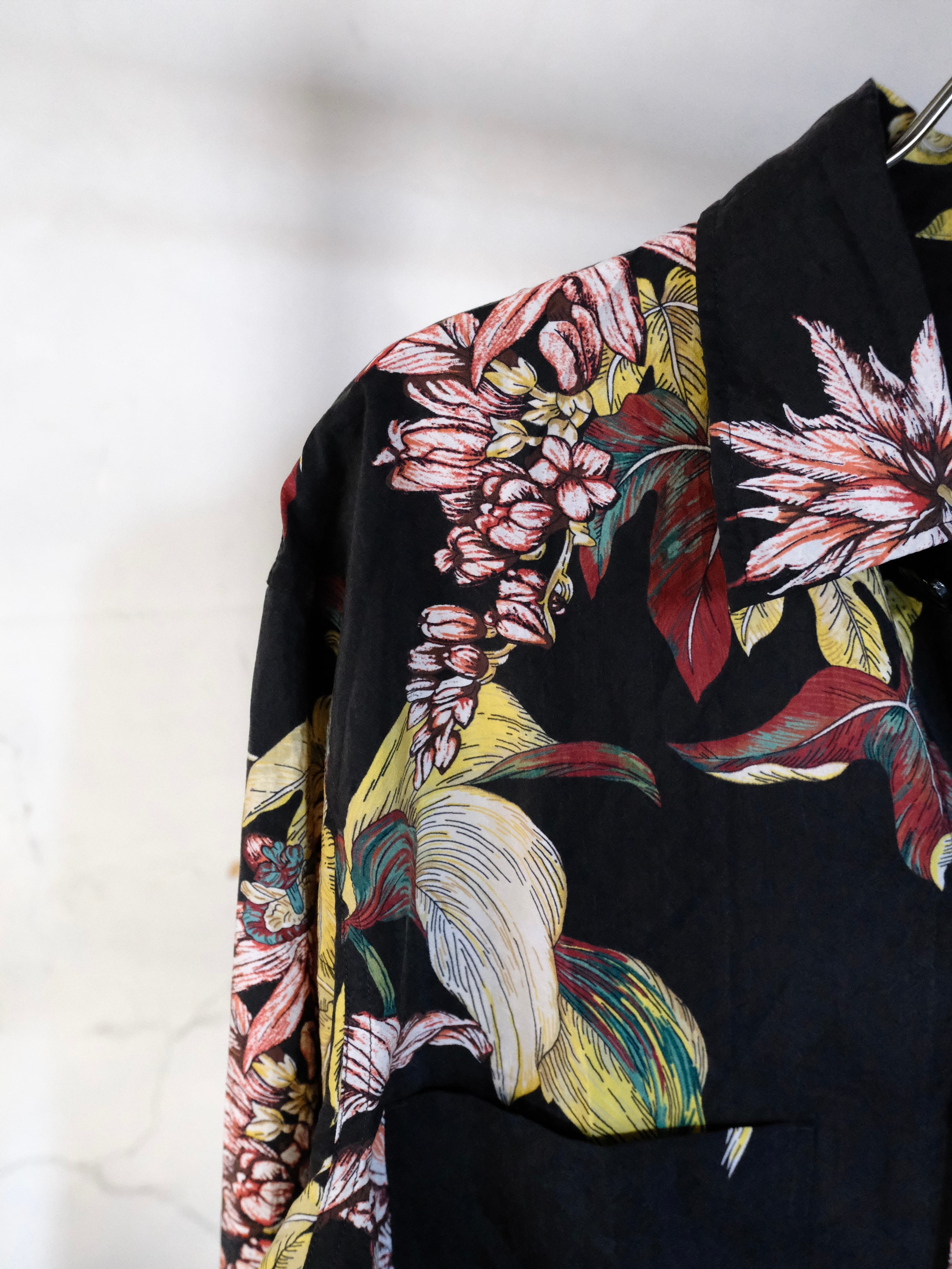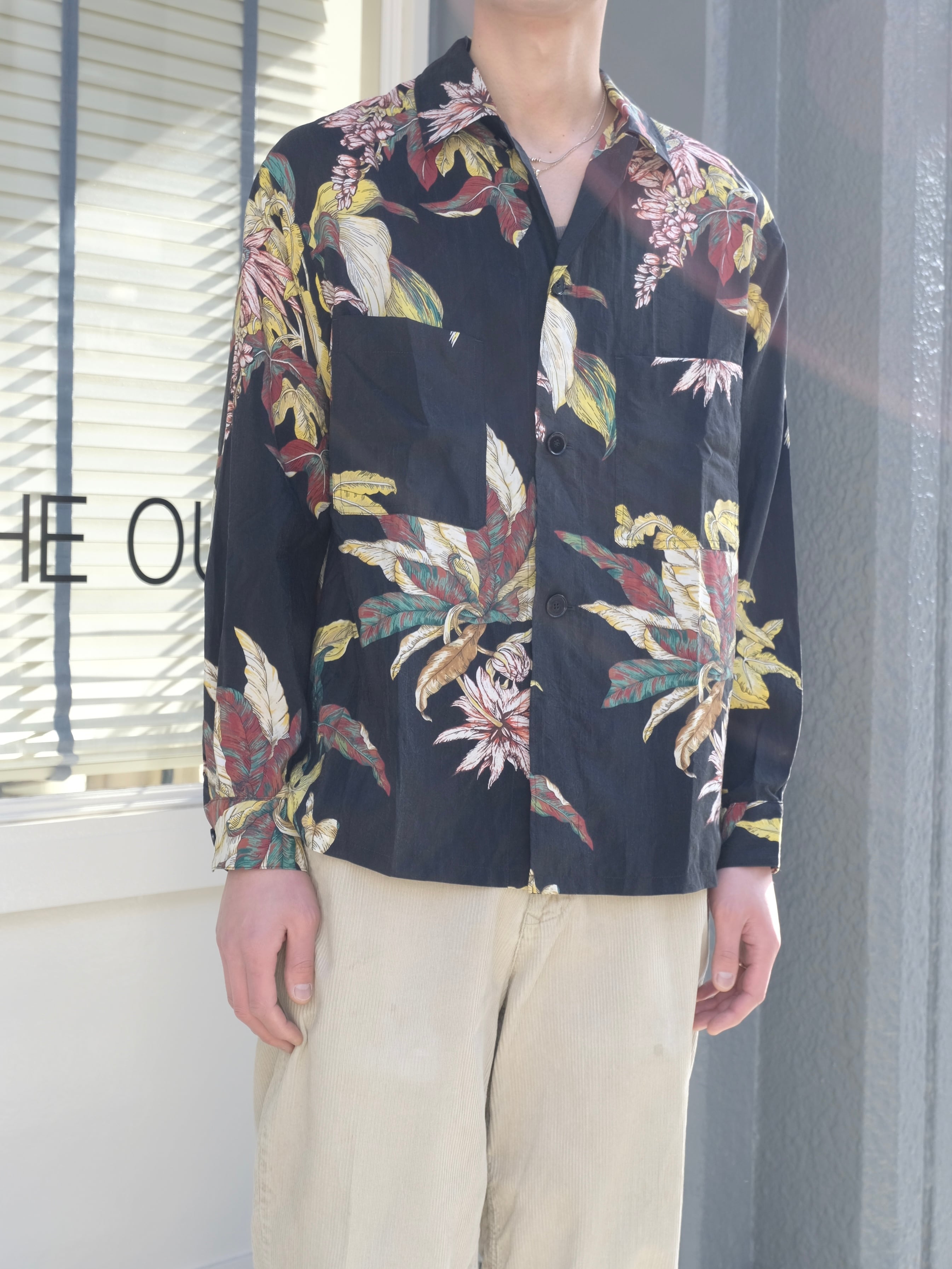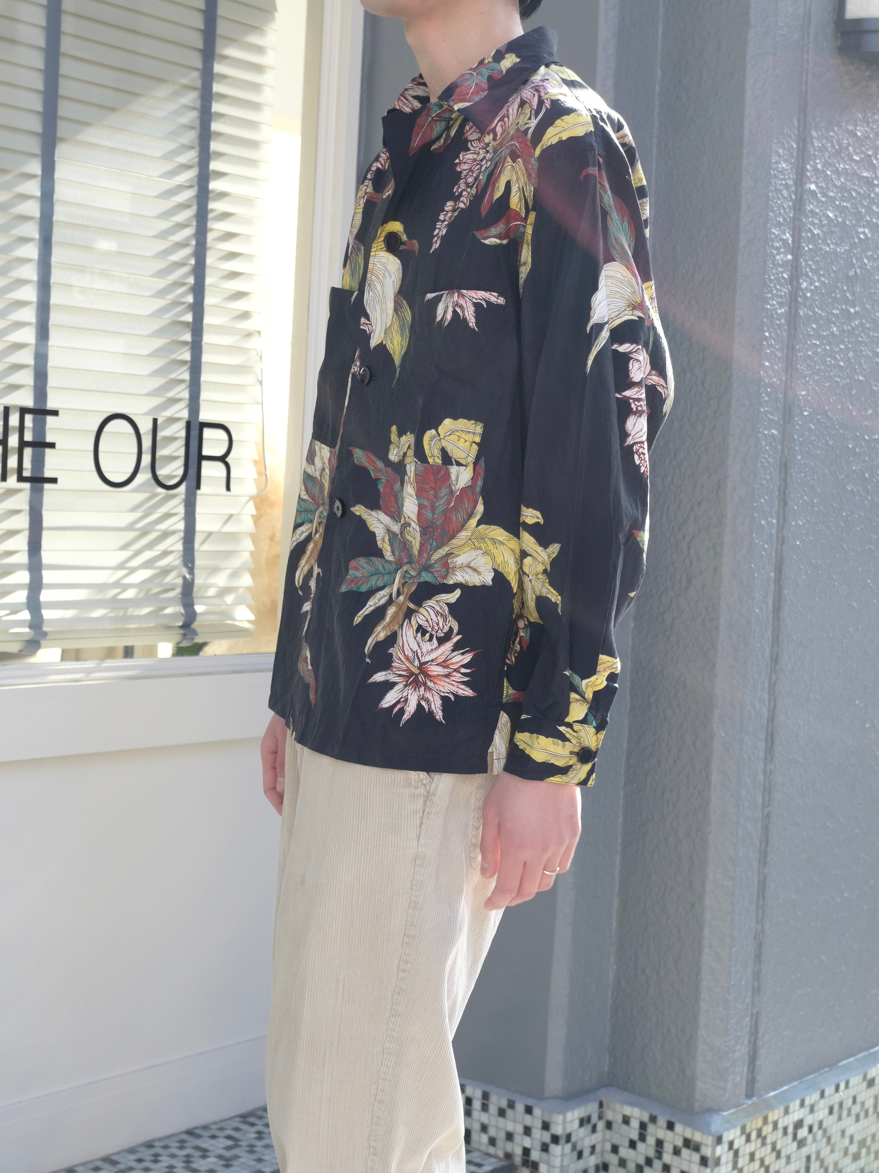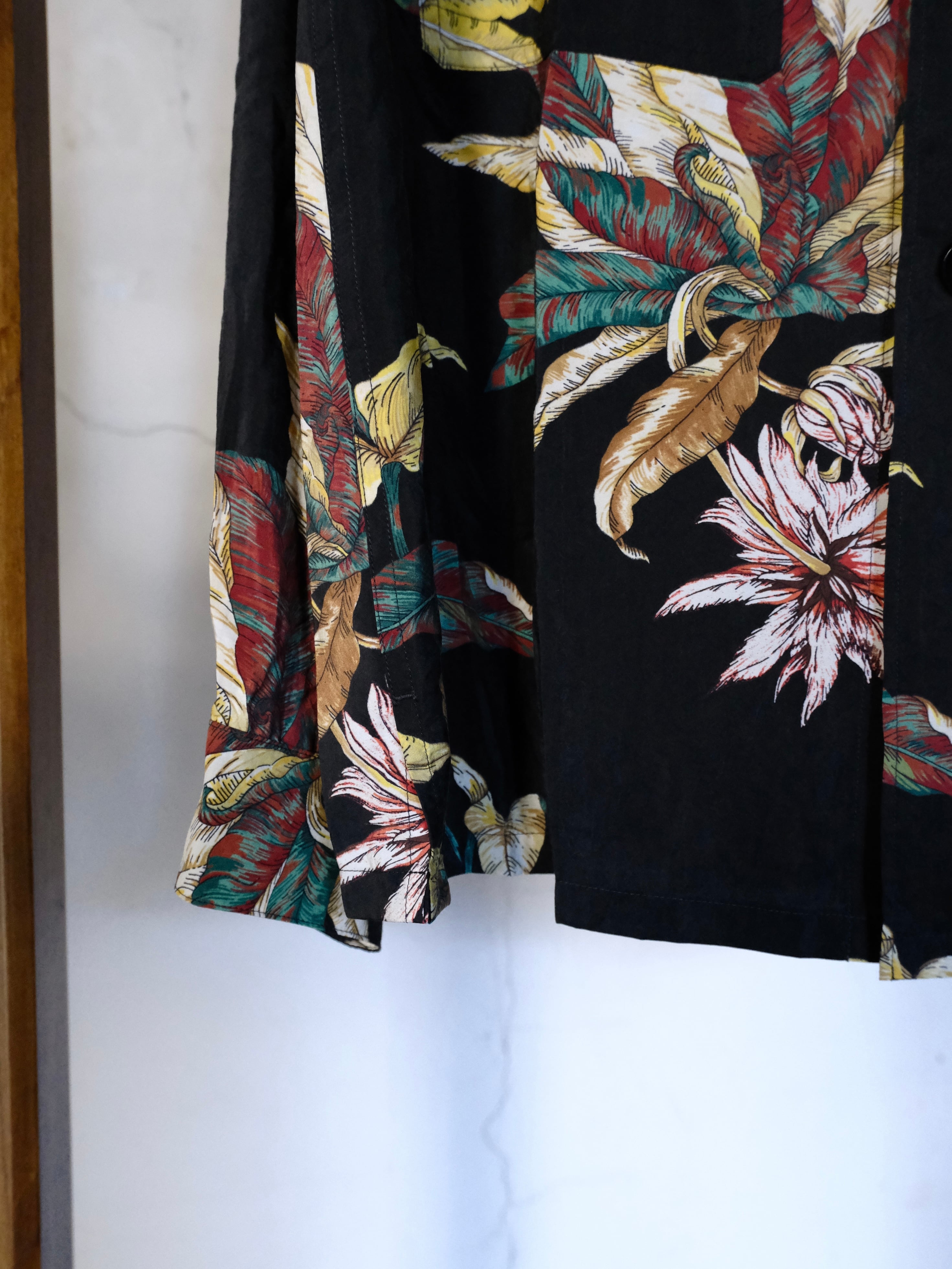 アロハシャツの様な花柄のプリントが特徴的。