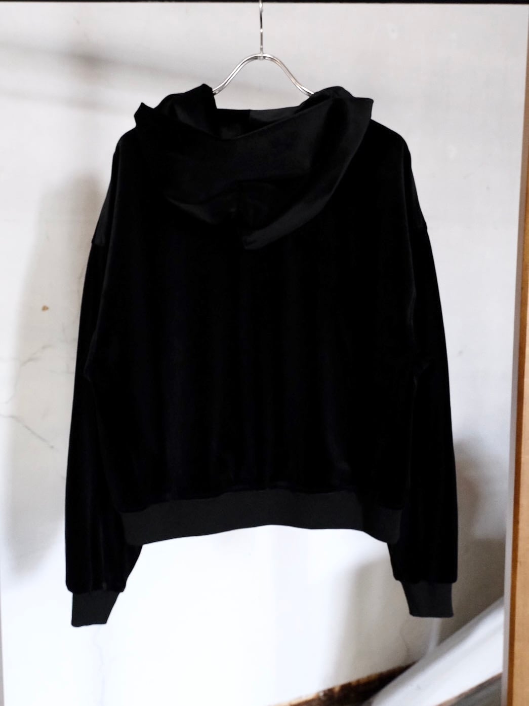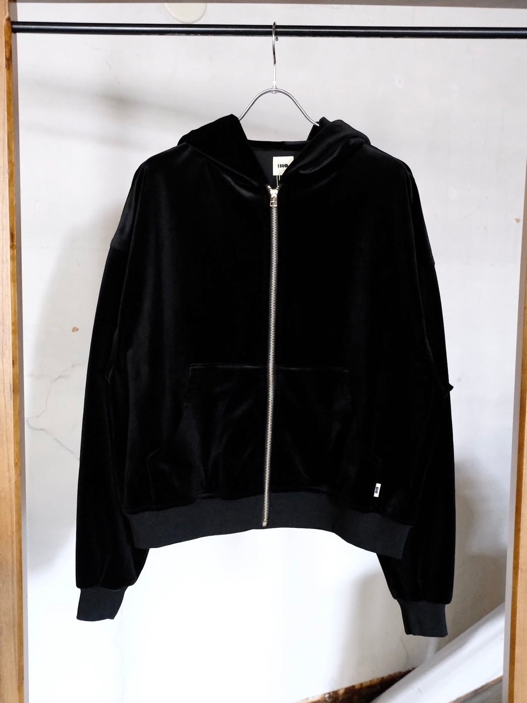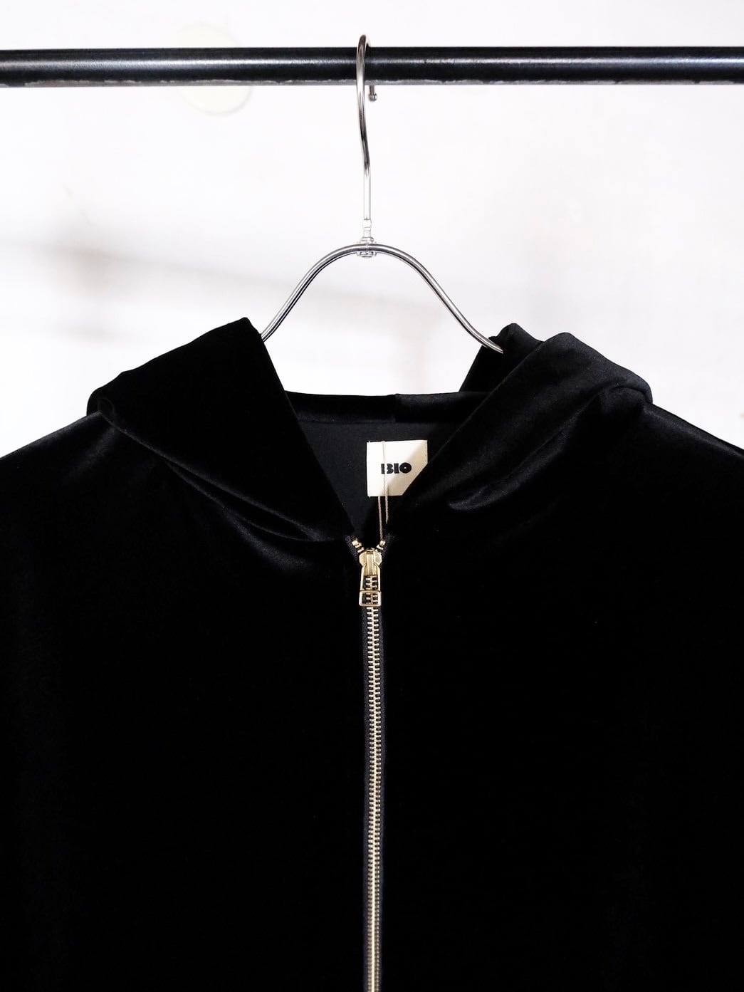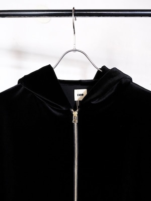 ジップカラーがゴールドになったベロア調のジップフーディー。