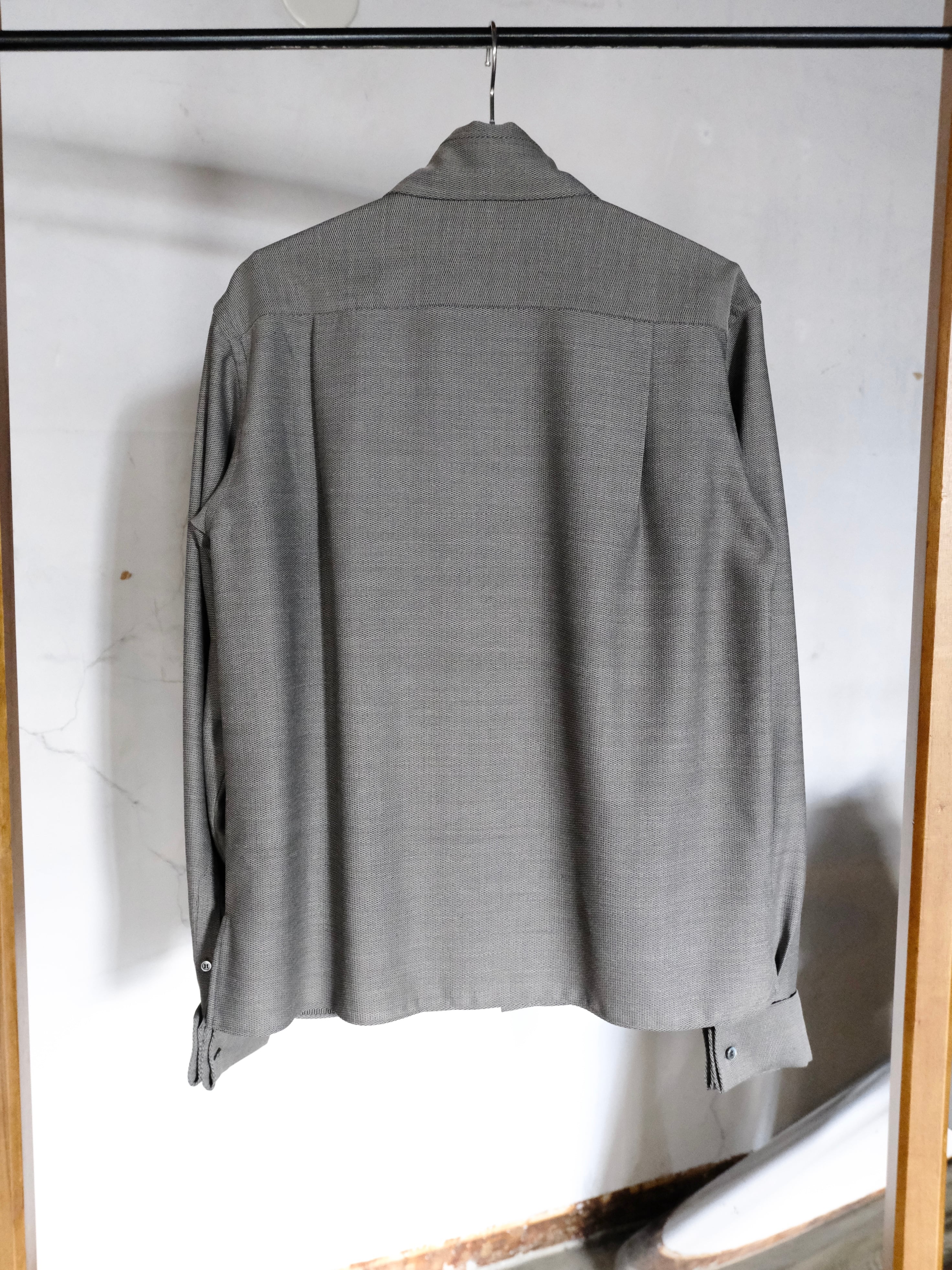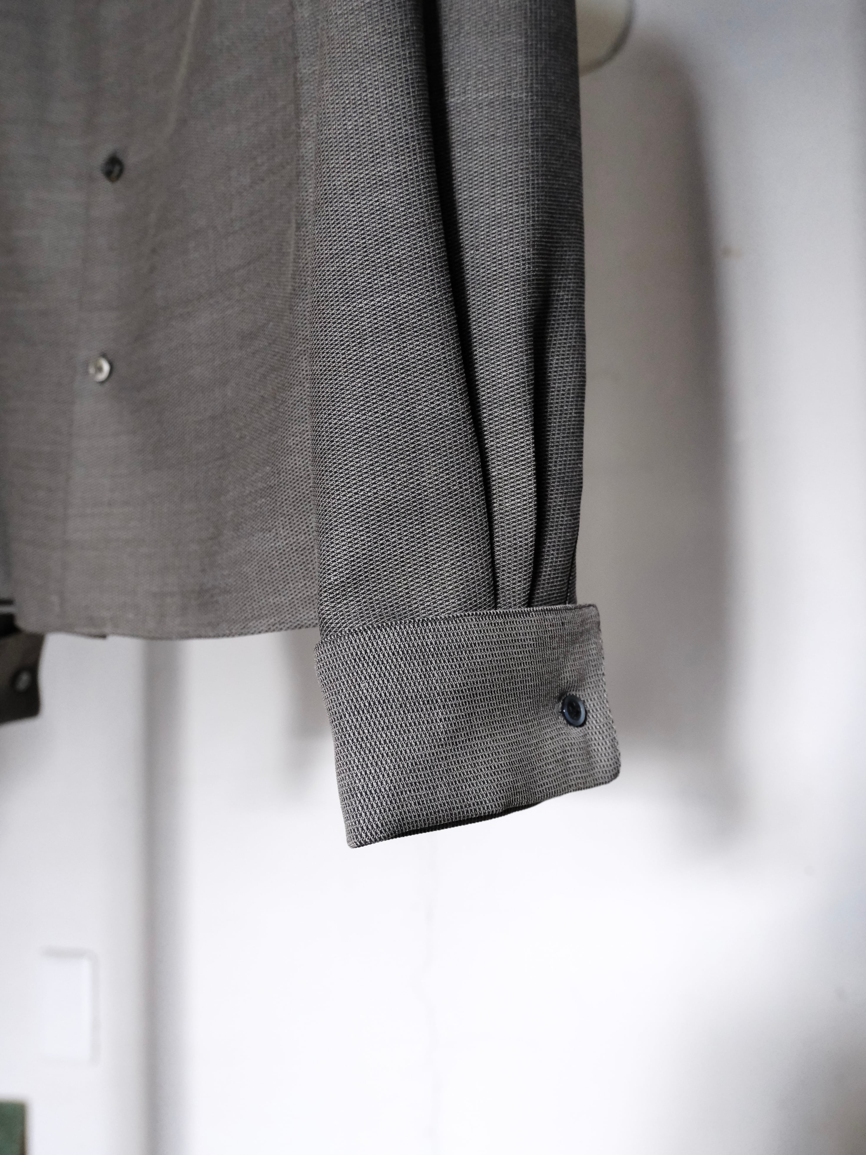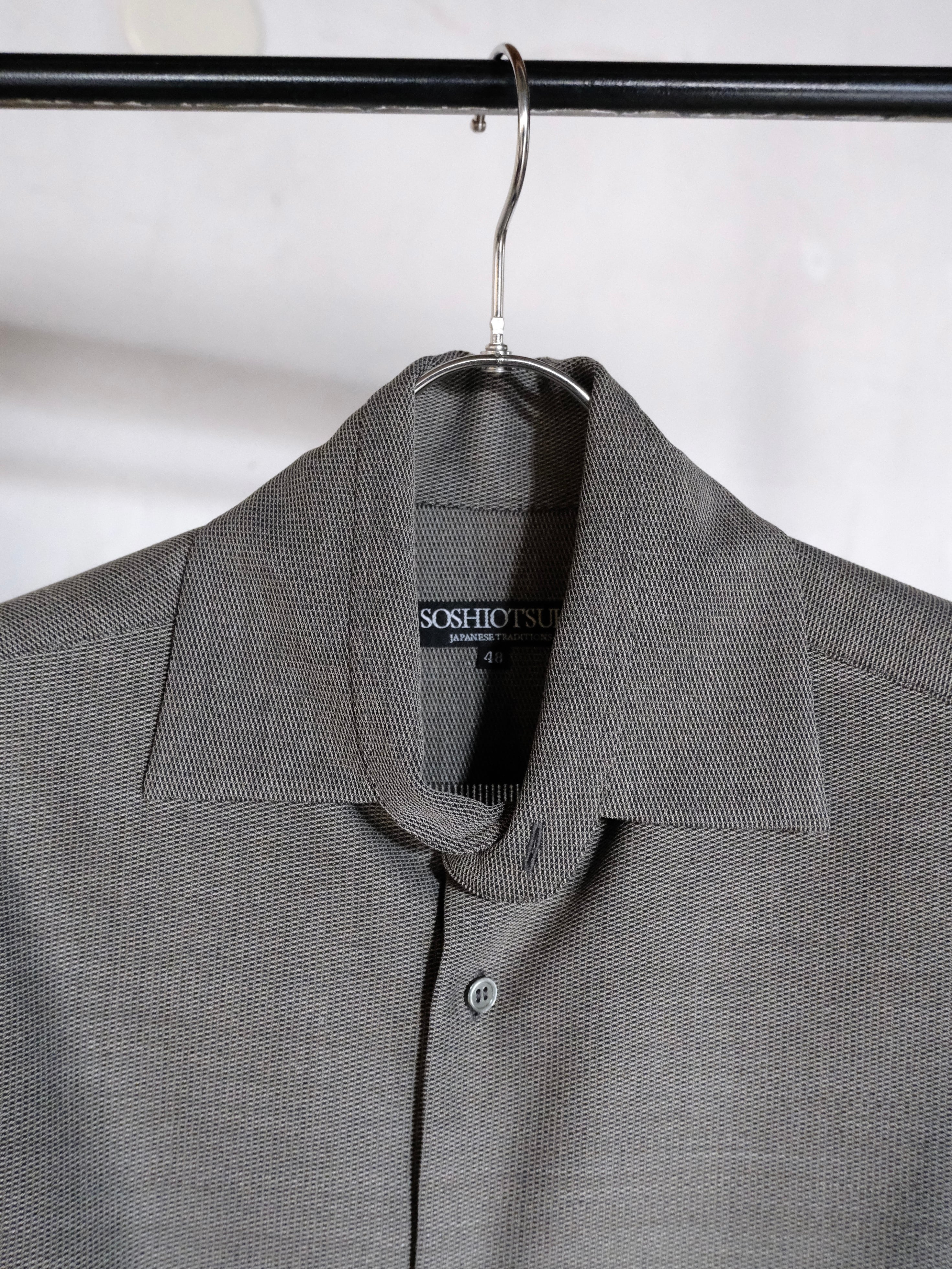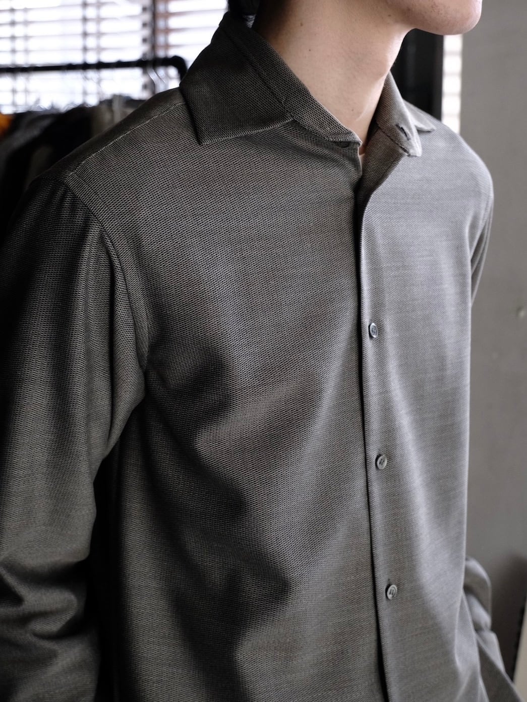 第一ボタンから自然に折れ曲がるように襟が落ち、台襟の内側が見える設計。