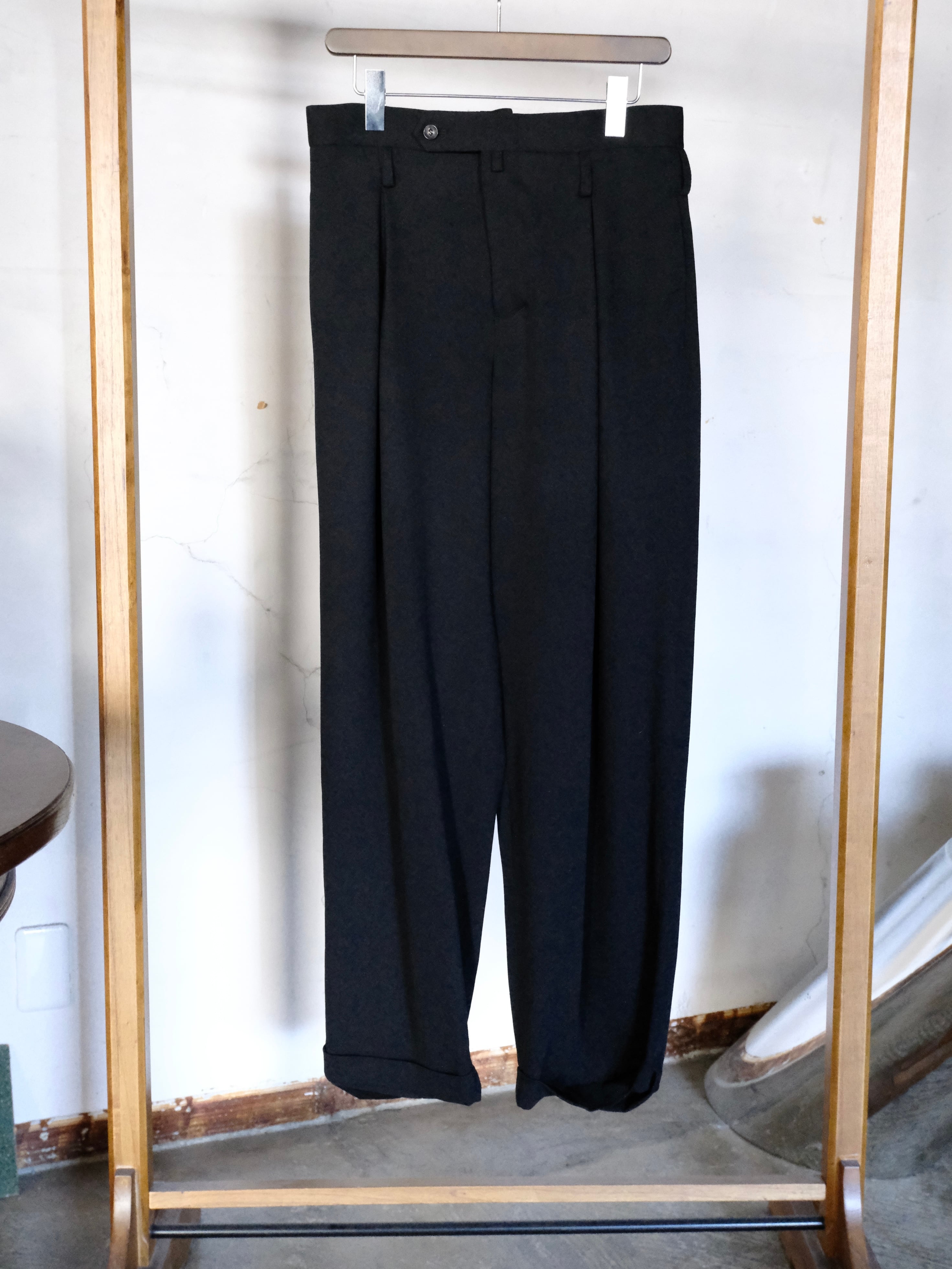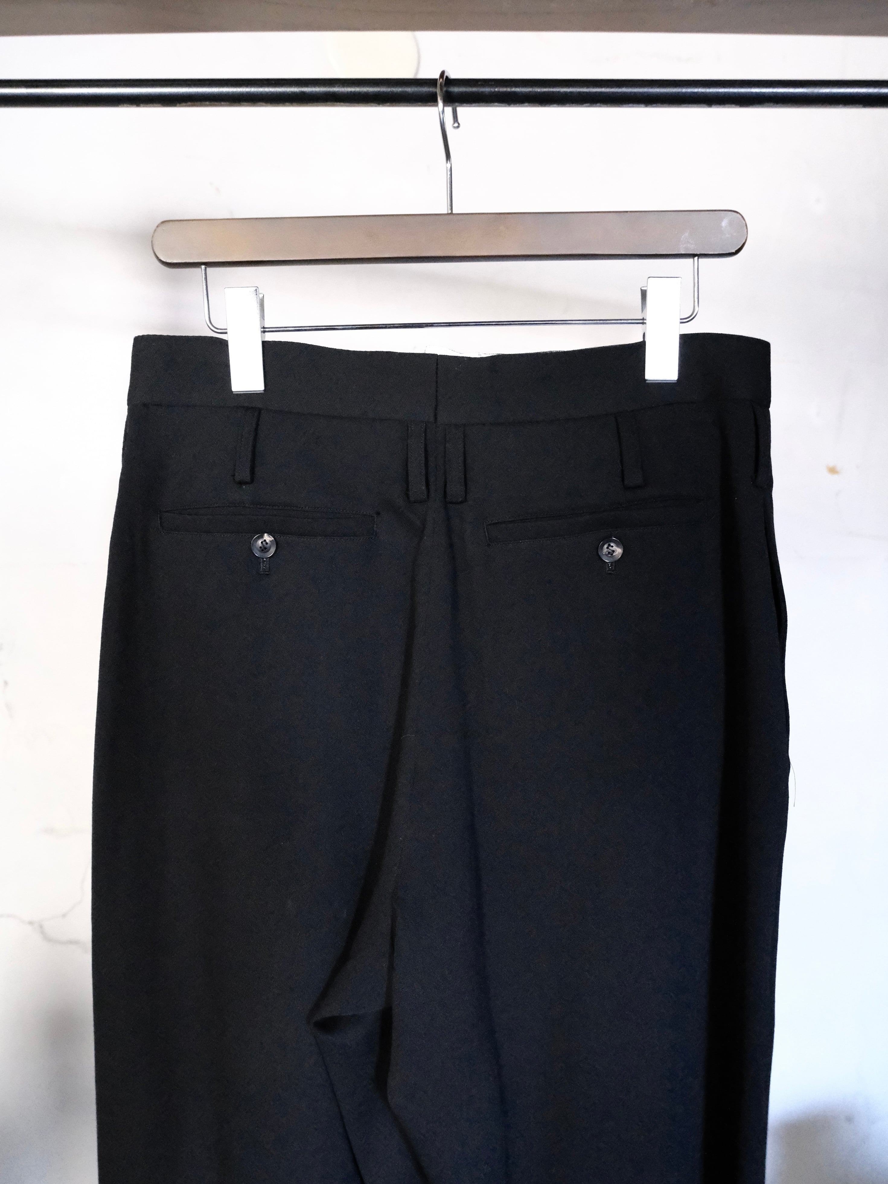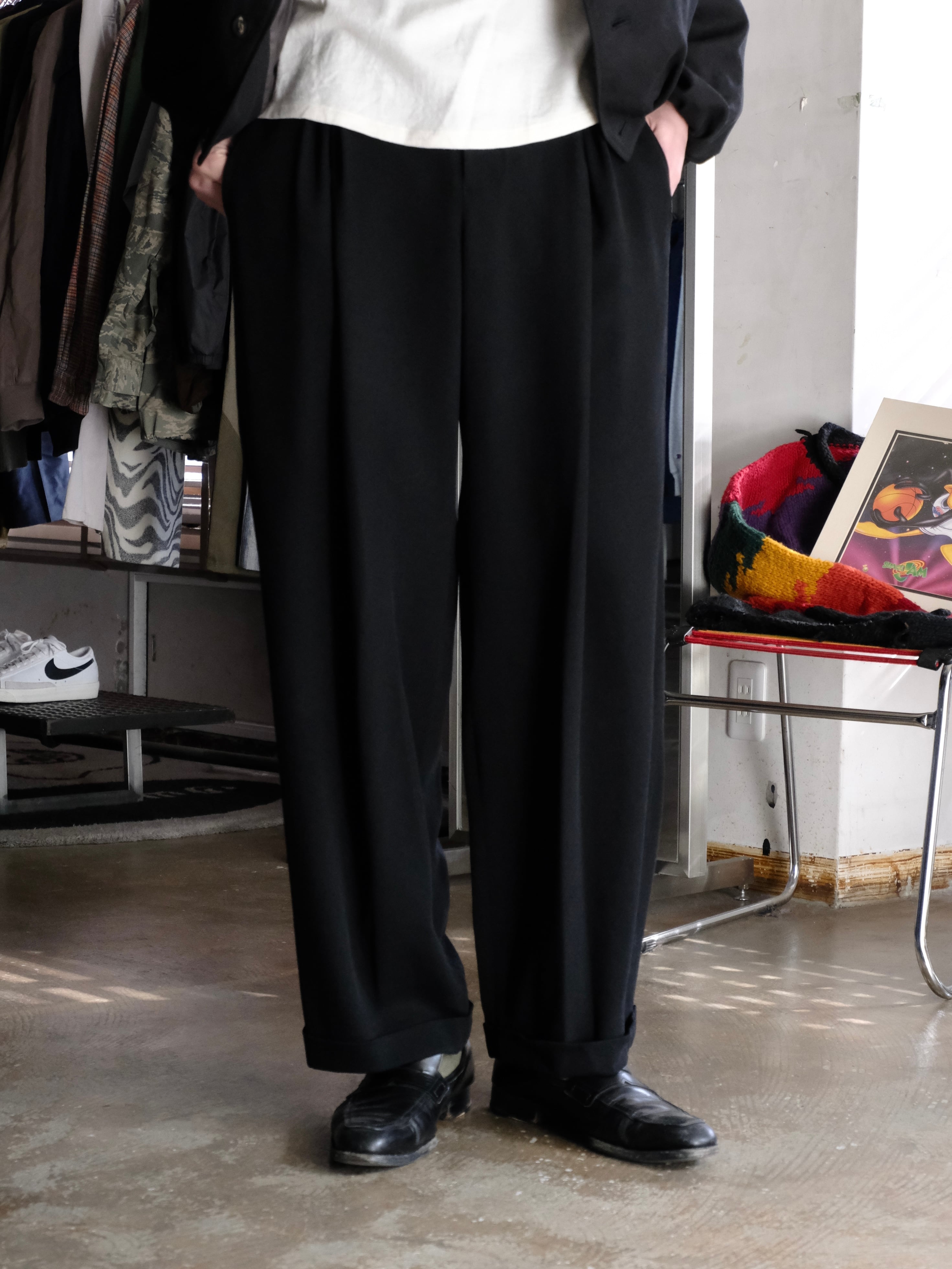 左右2本ずつ、計4本のインバーテッドタックを前見頃に配したワイドパンツ。