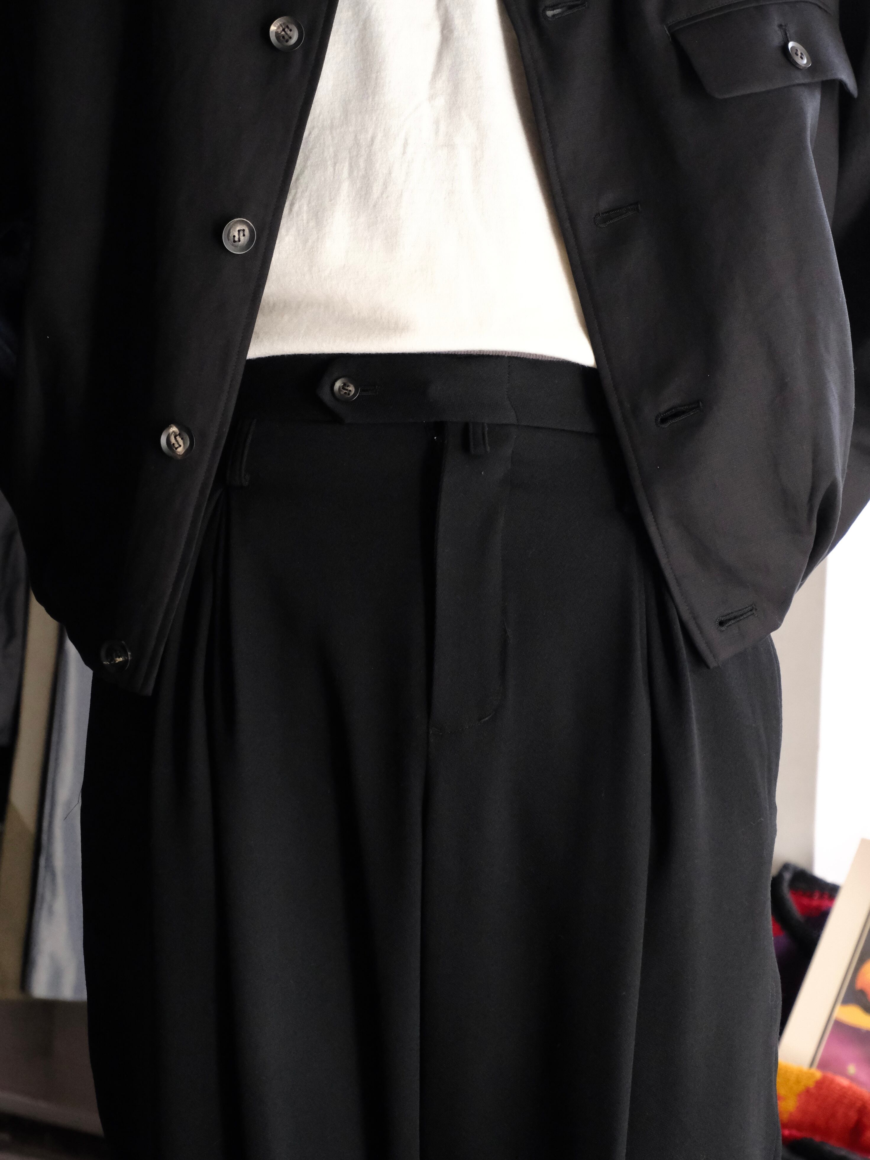 この多層的なタックが深い陰影と豊かなドレープを生み出し、クラシックなテーラリングを拡張するような存在感を与えている。