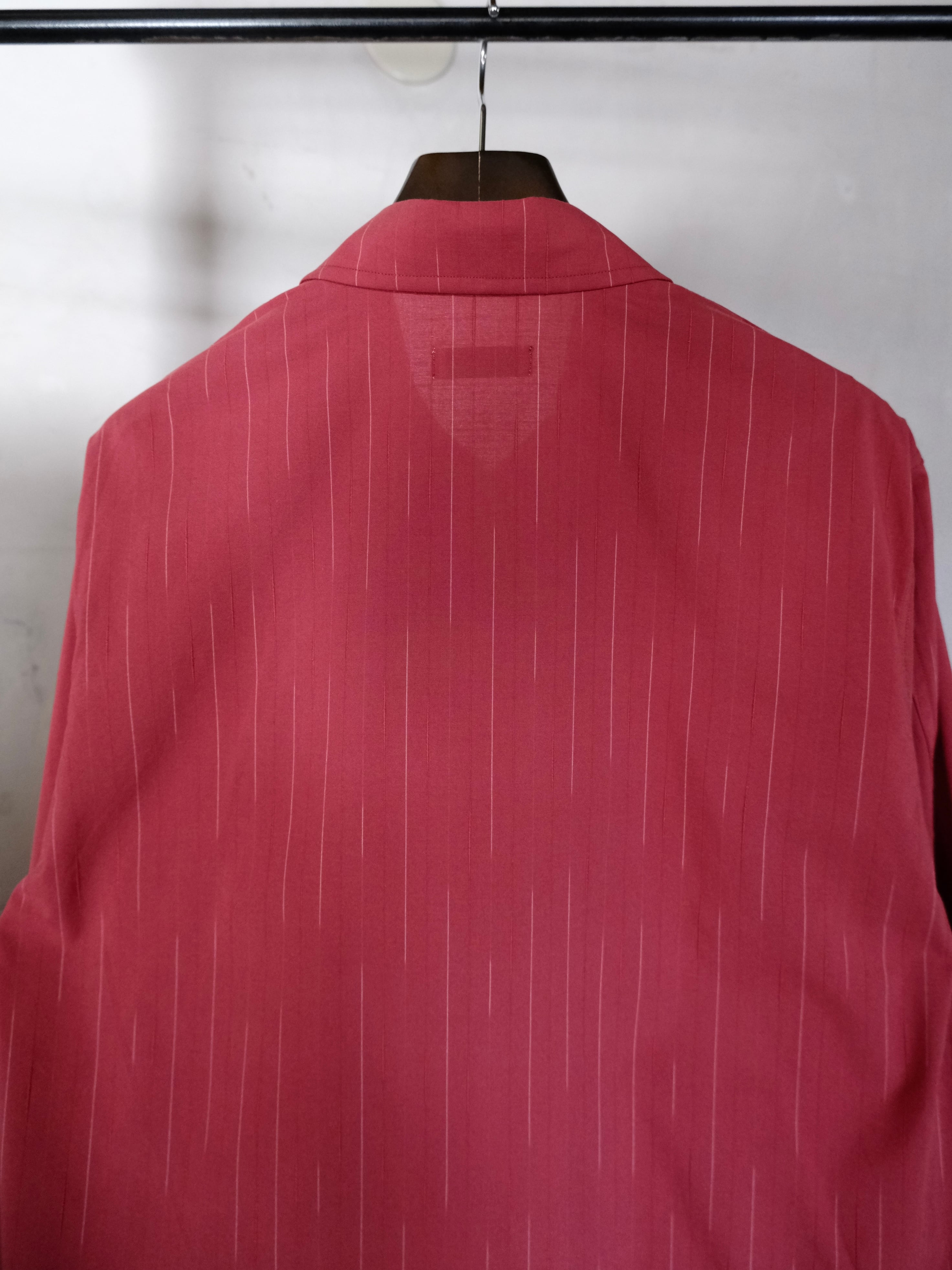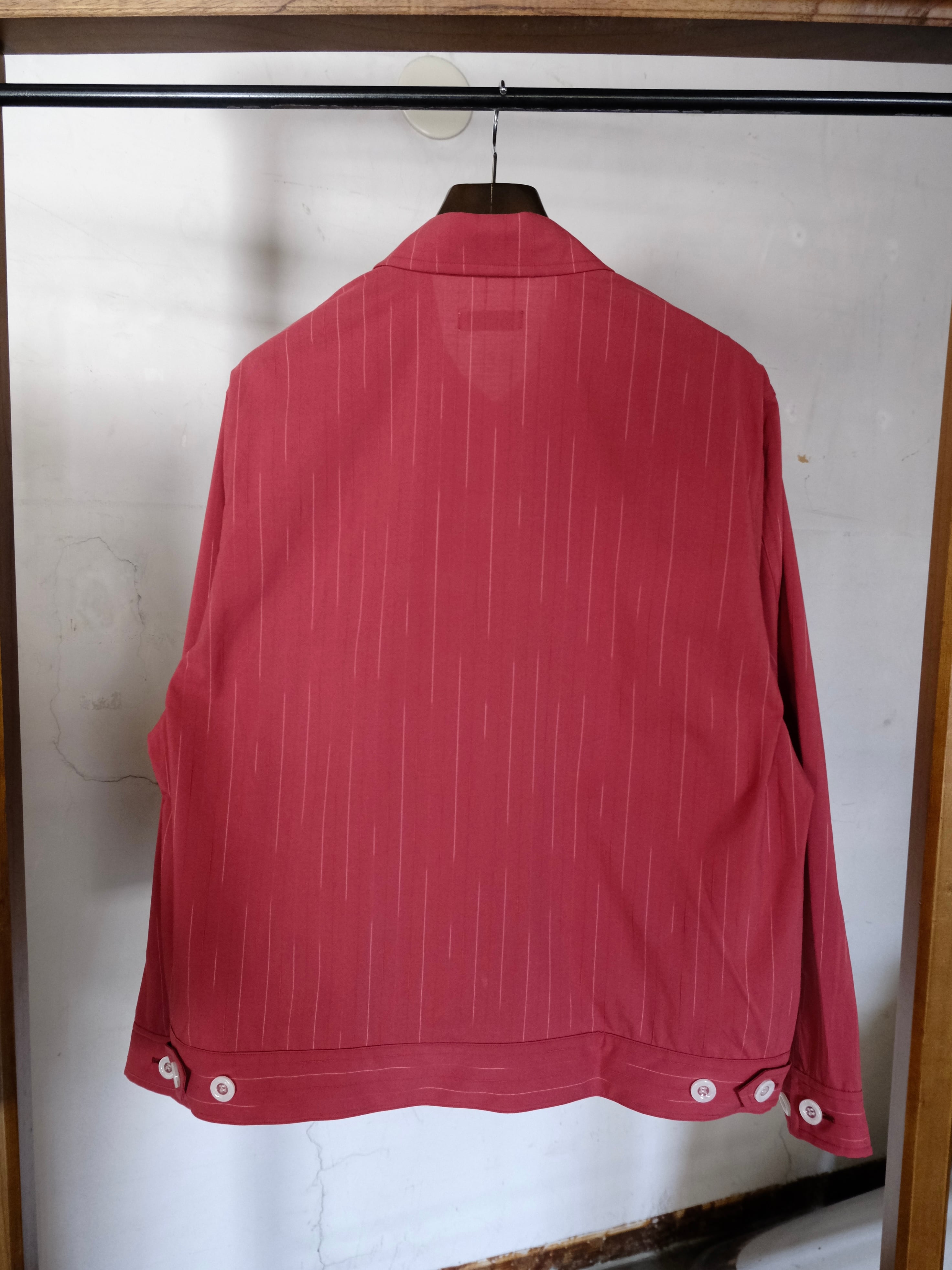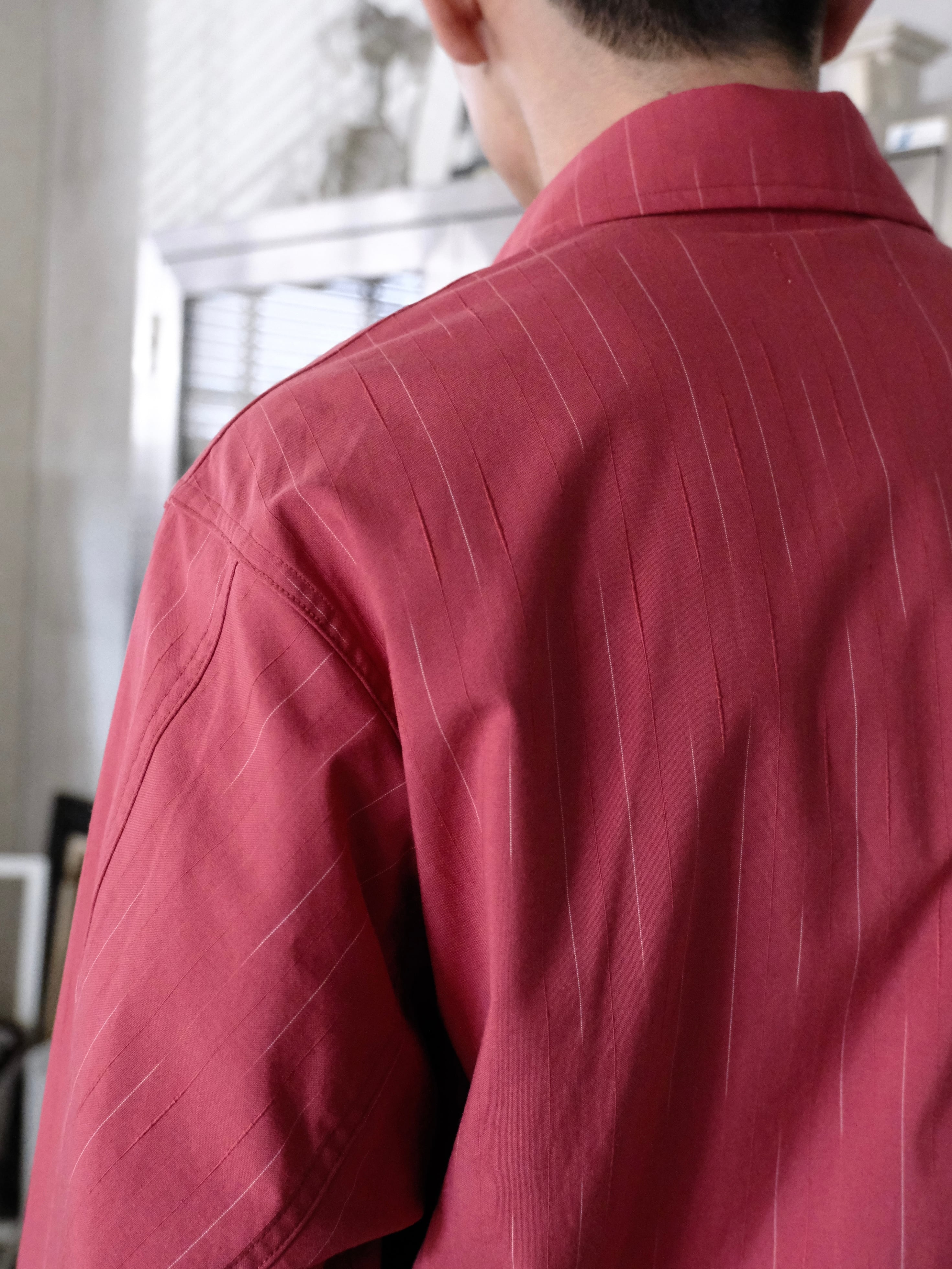 糸の染め分けと形状の異なる糸を組み合わせることでストライプが見え隠れする遊び心を持ったオリジナルのカスリのムラ糸をストライプ生地で仕立てた、シャツ感覚でライトに羽織れるシャツアウターです。