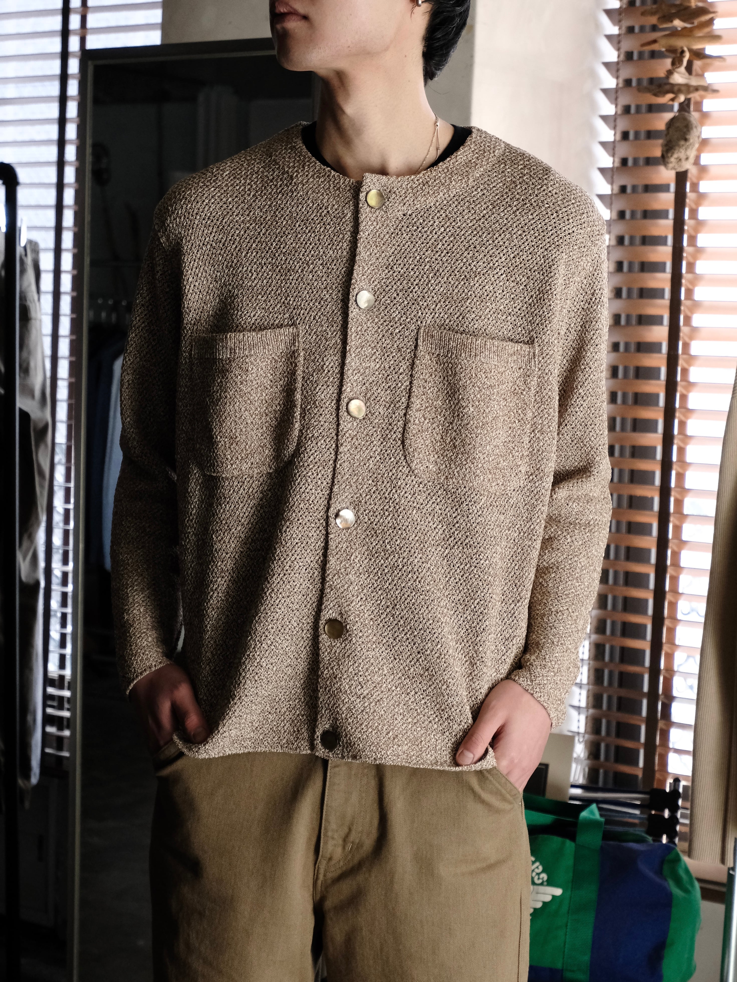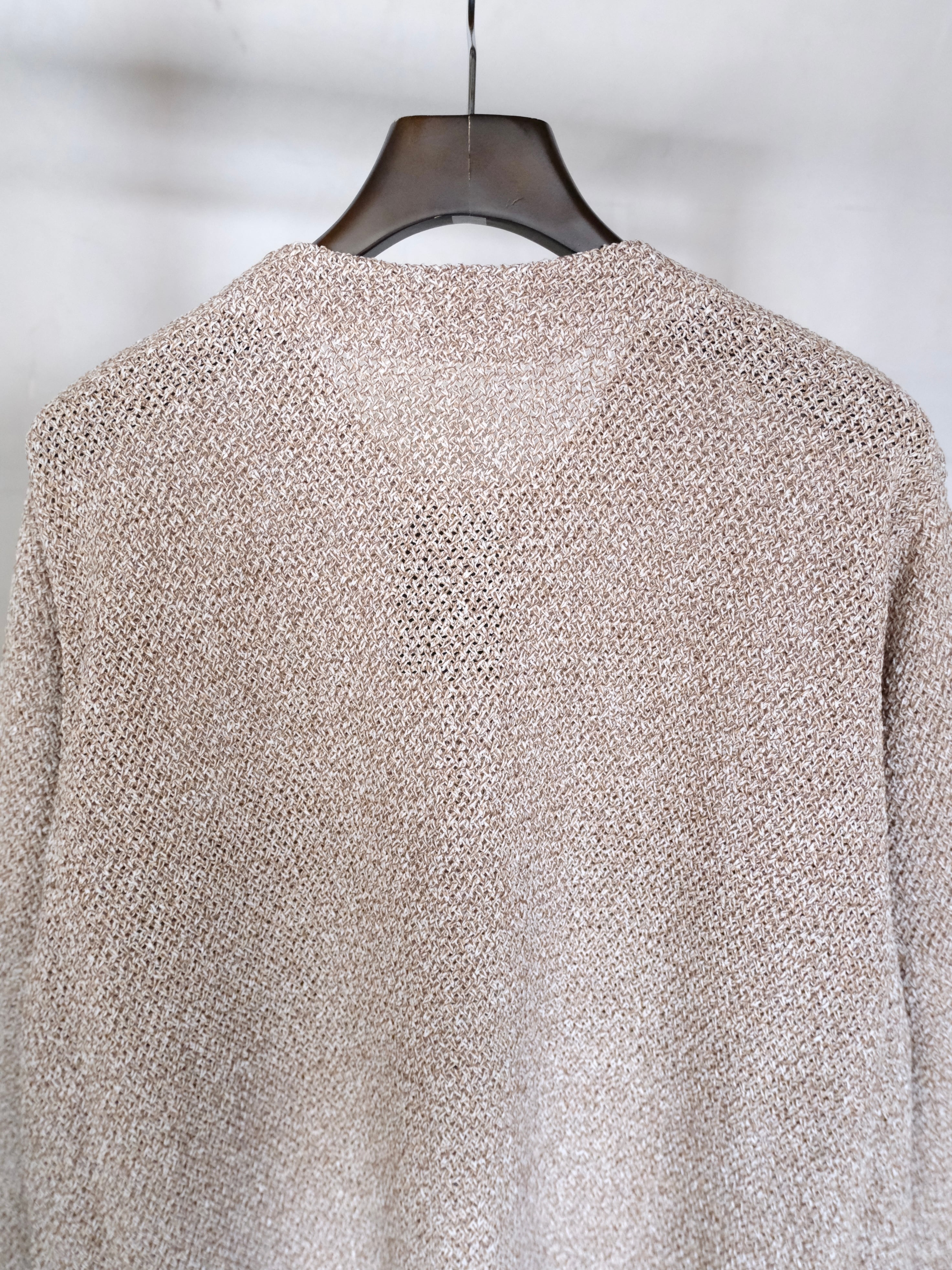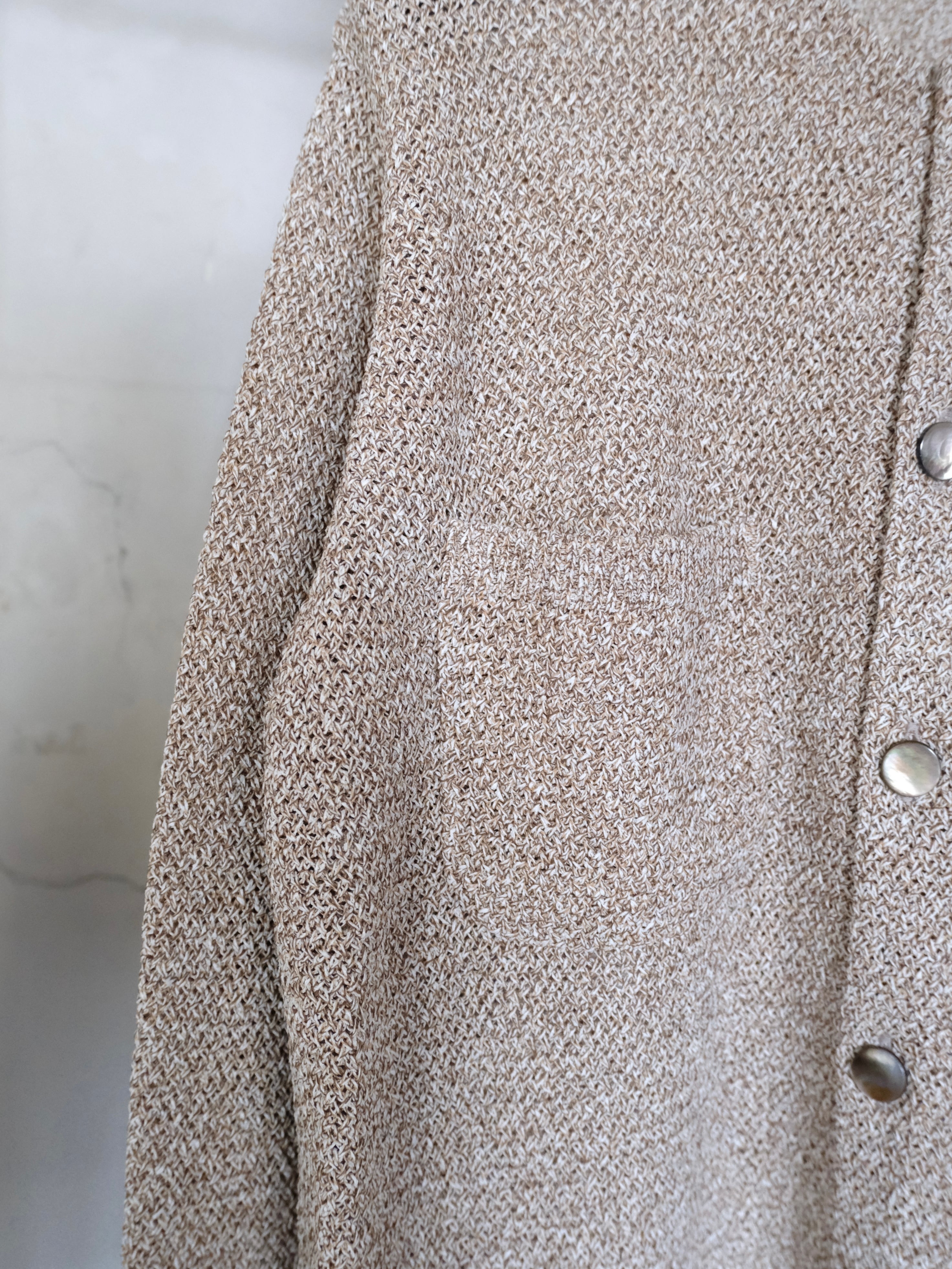和紙とポリエステルの糸をWカバーした3色杢素材をバスケット編みで編み立てた7Gのカーディガン。
