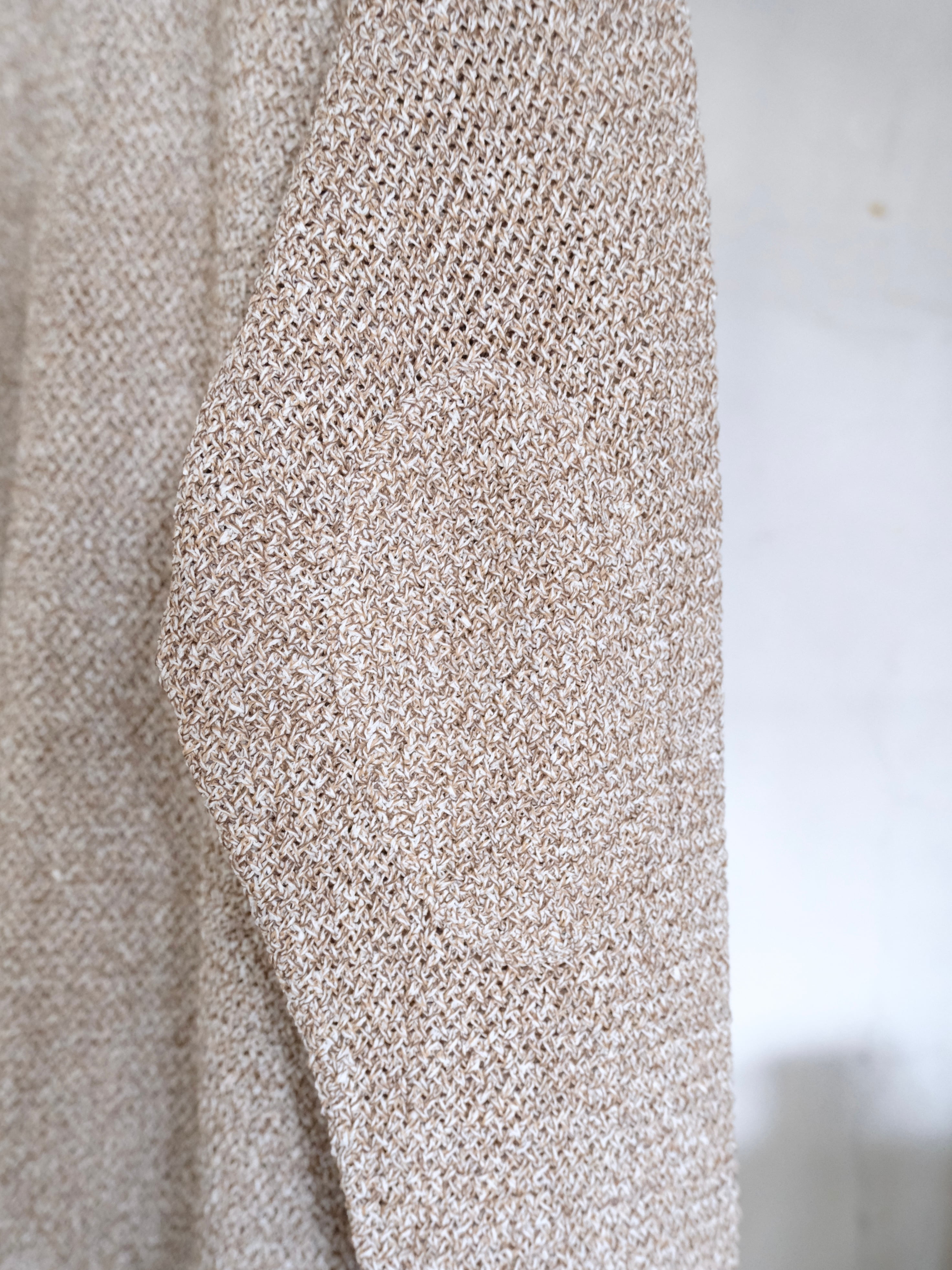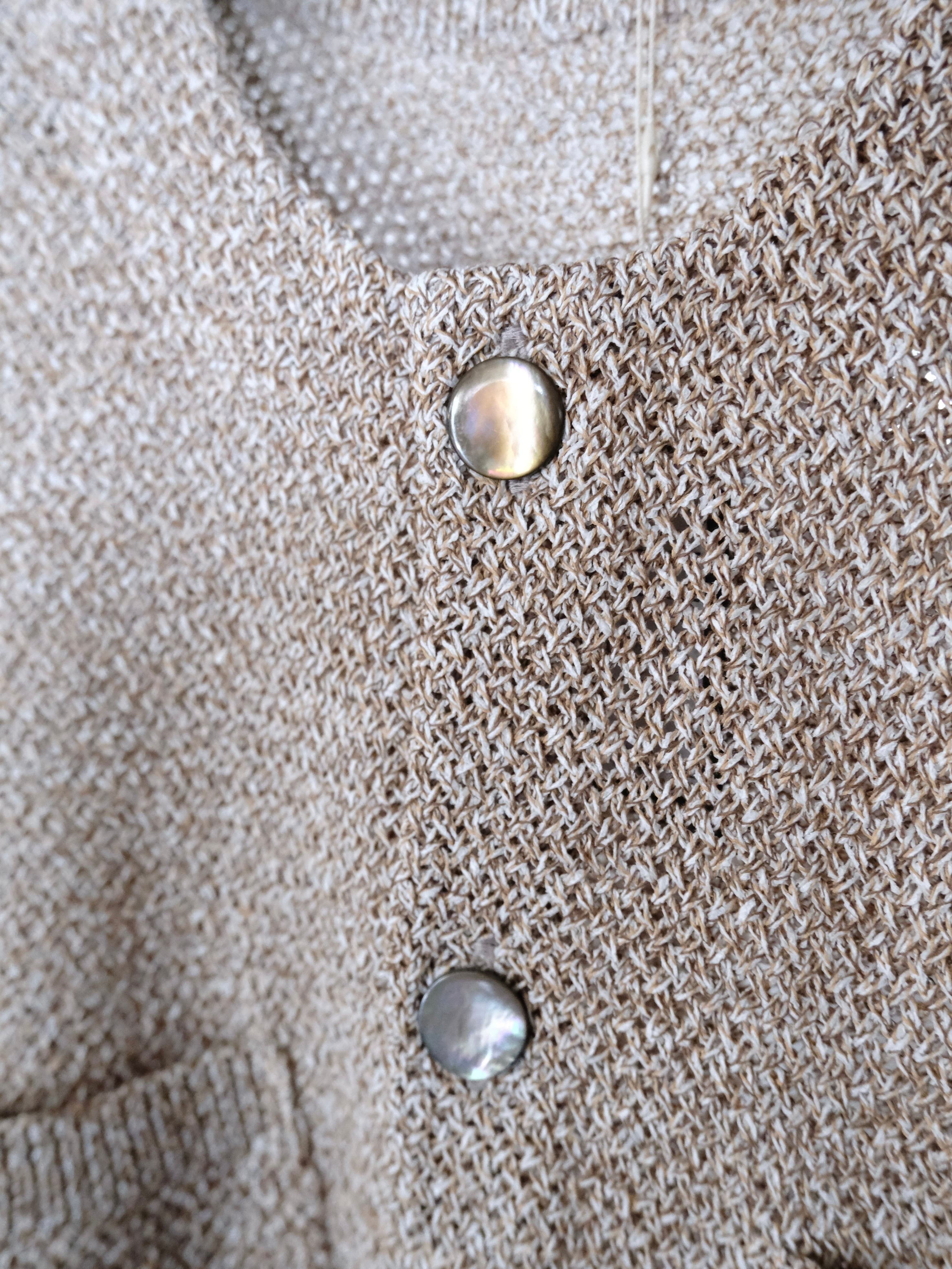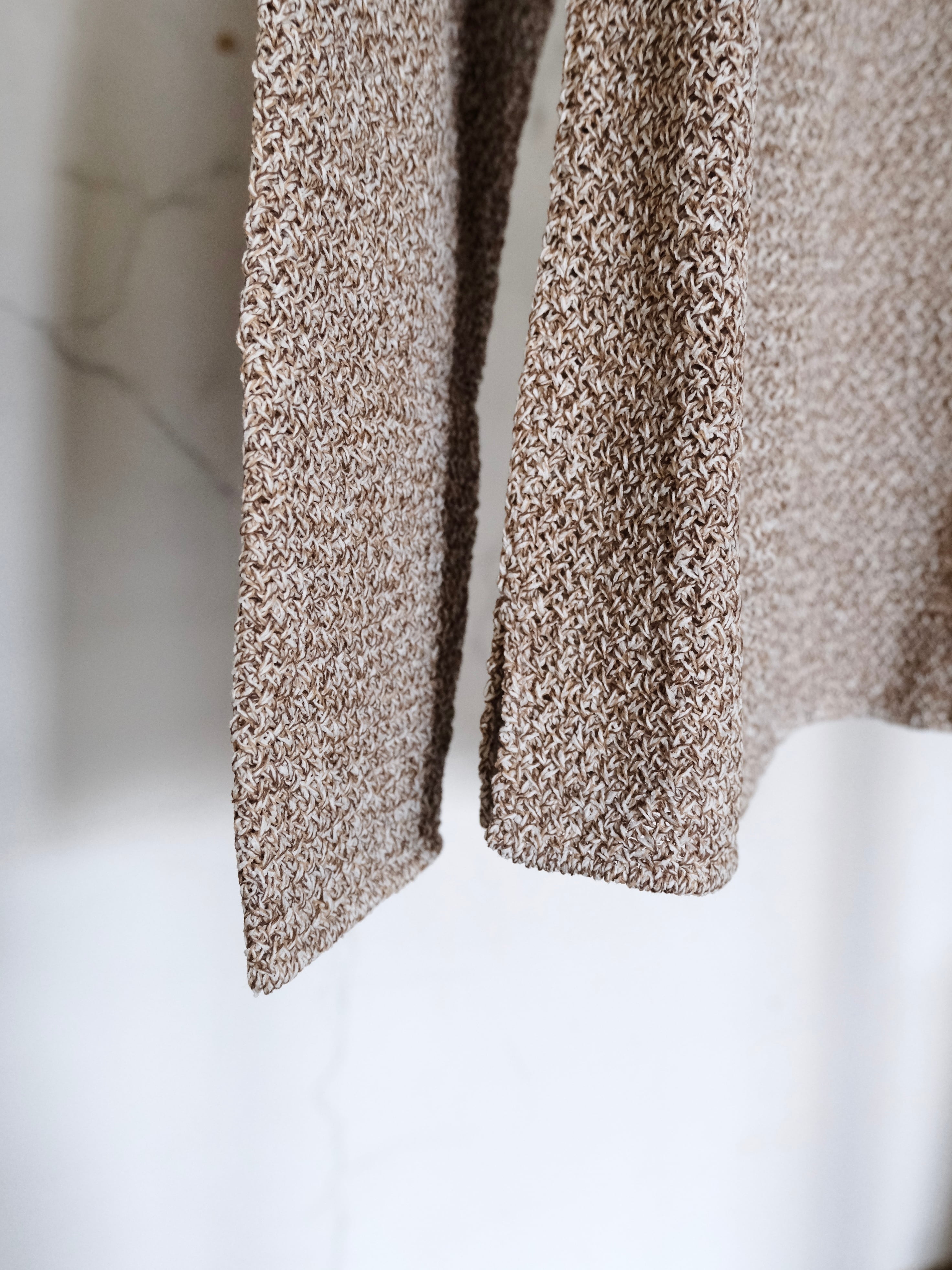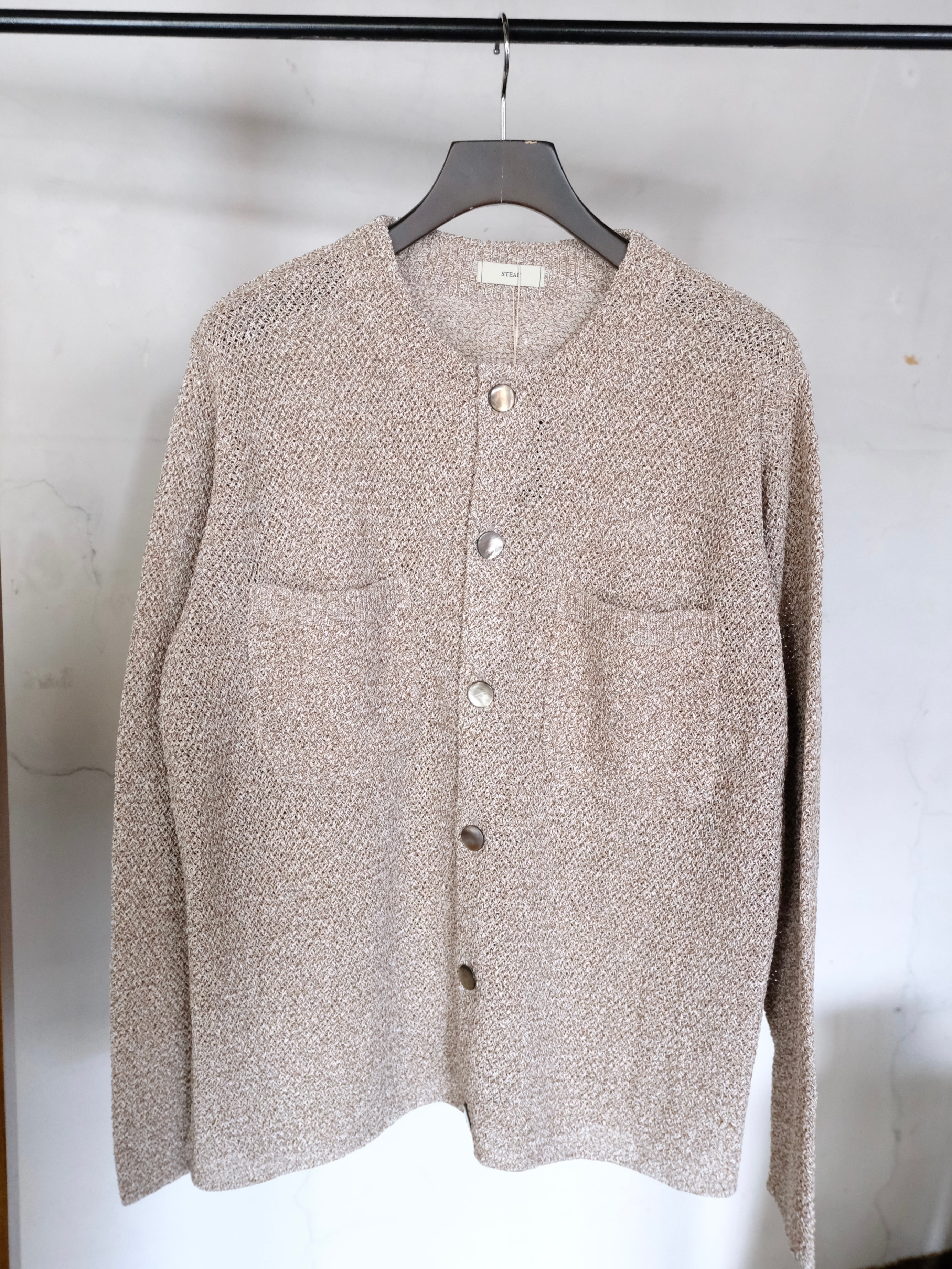 和紙とポリエステルの糸をWカバーした3色杢素材をバスケット編みで編み立てた7Gのカーディガン。