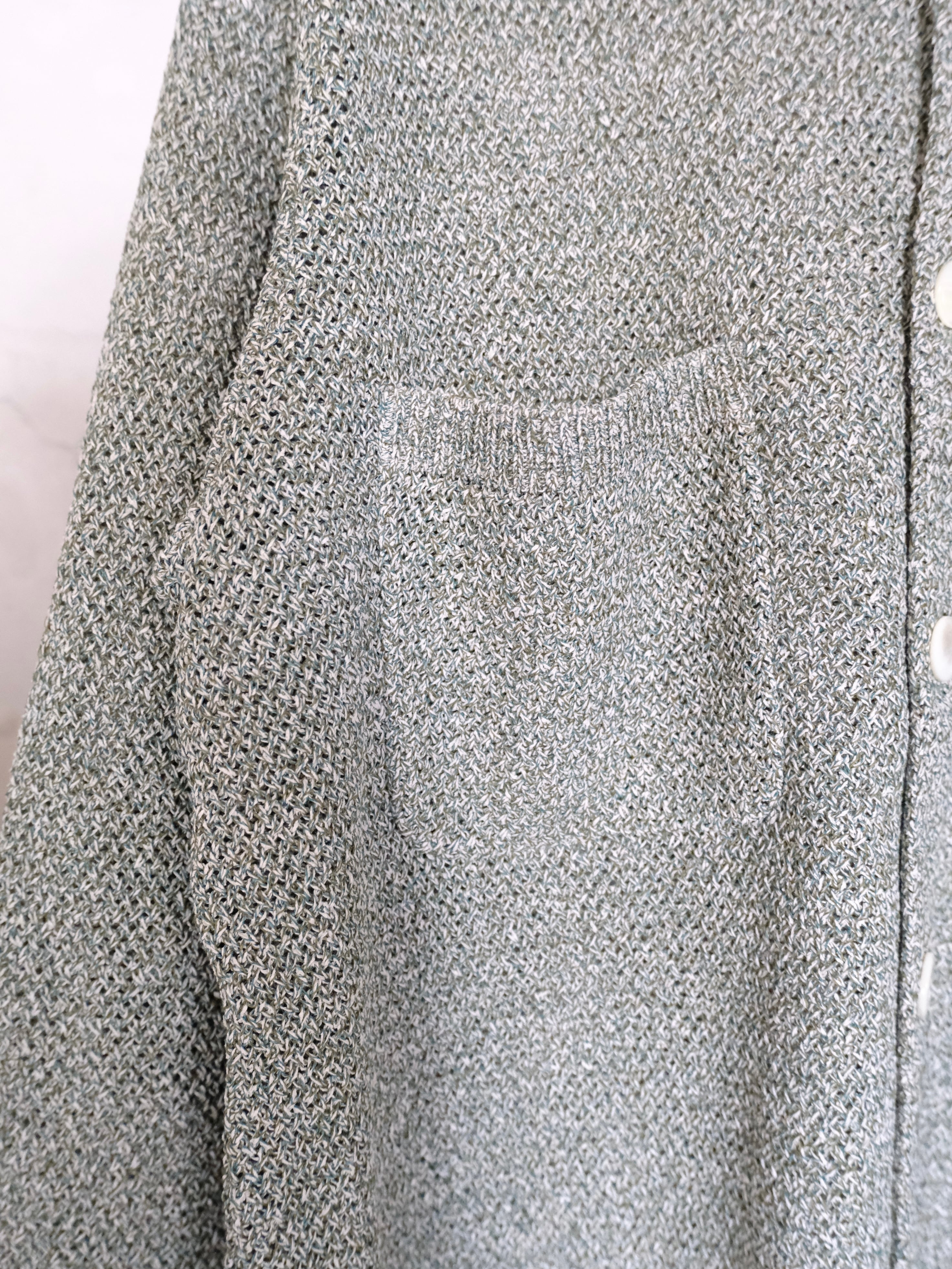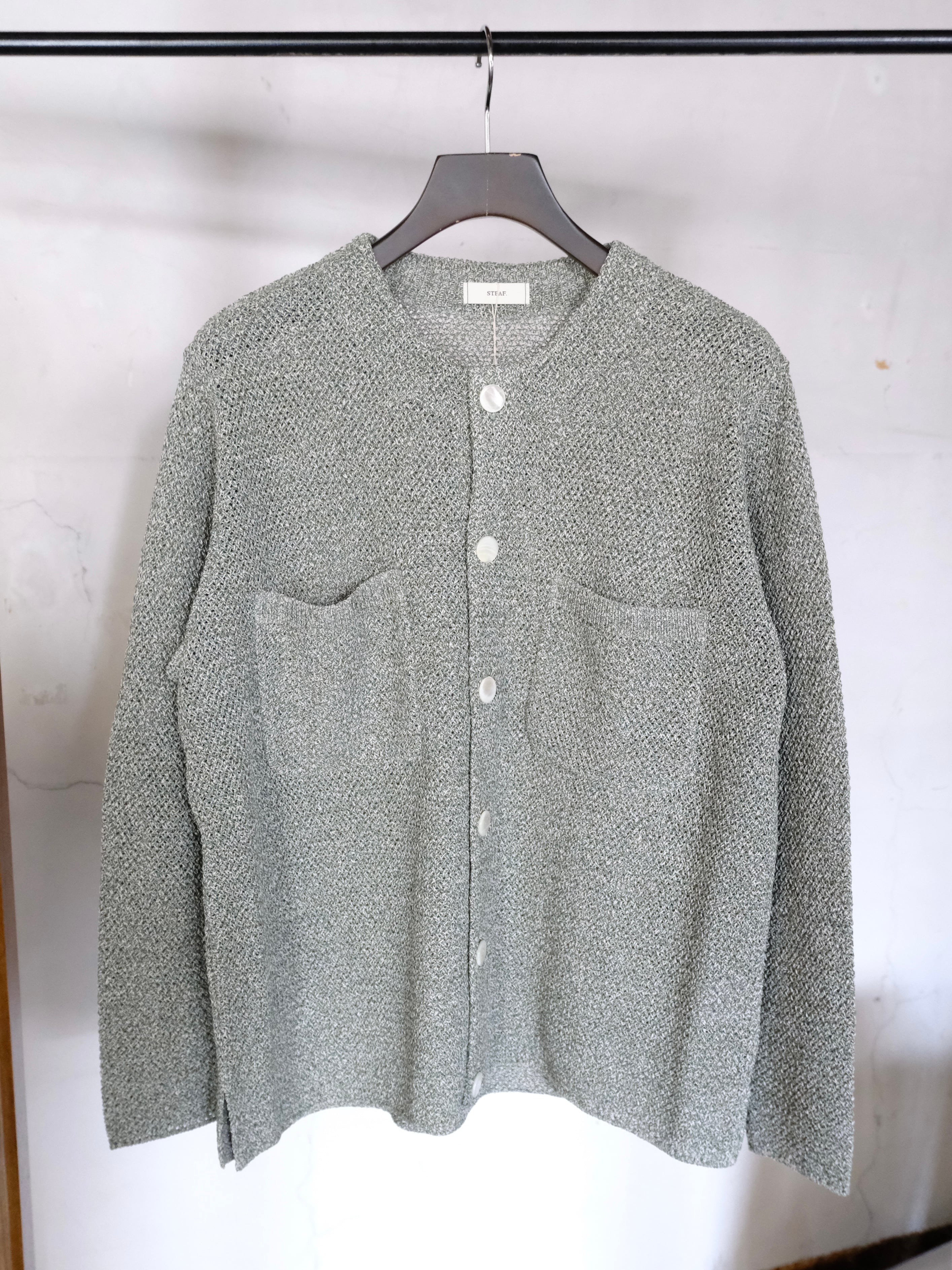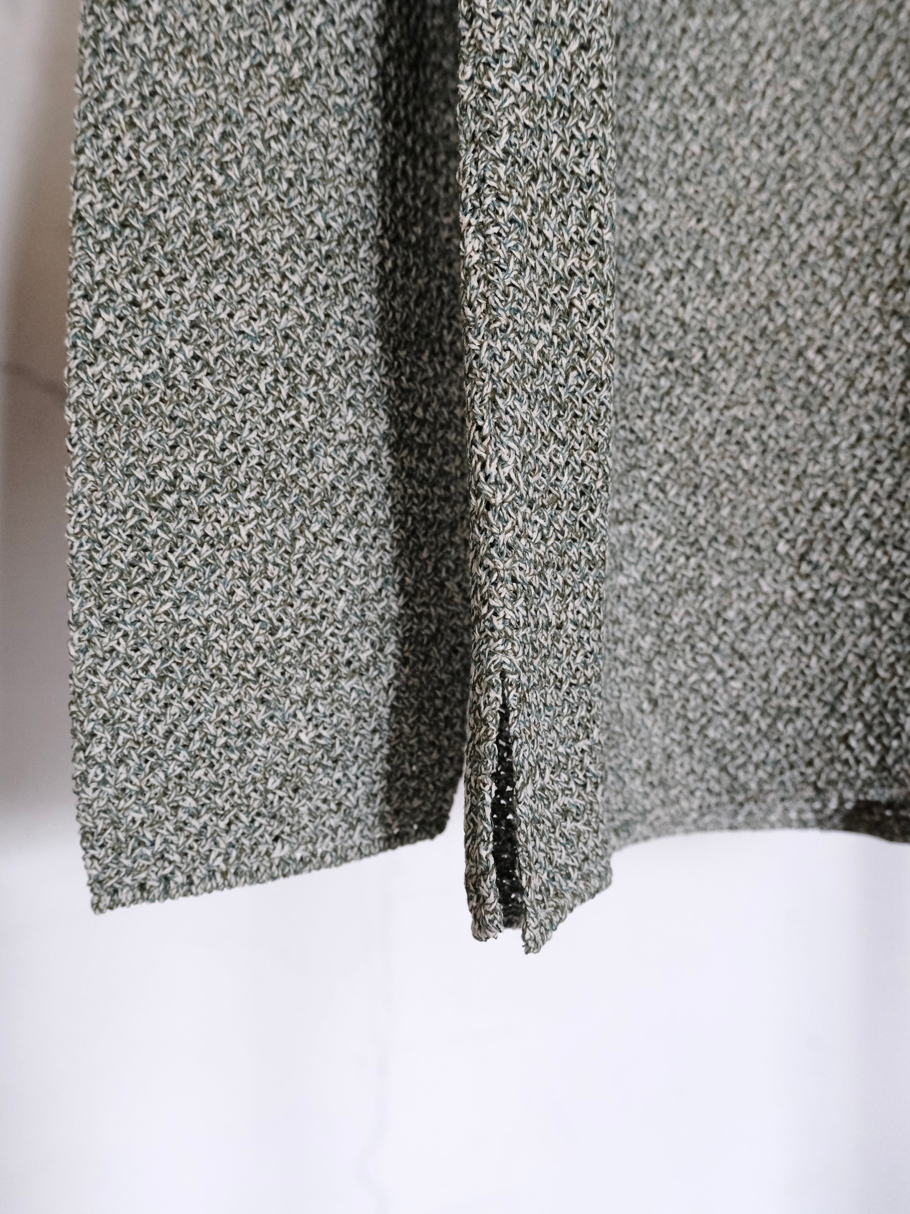 和紙とポリエステルの糸をWカバーした3色杢素材をバスケット編みで編み立てた7Gのカーディガン。