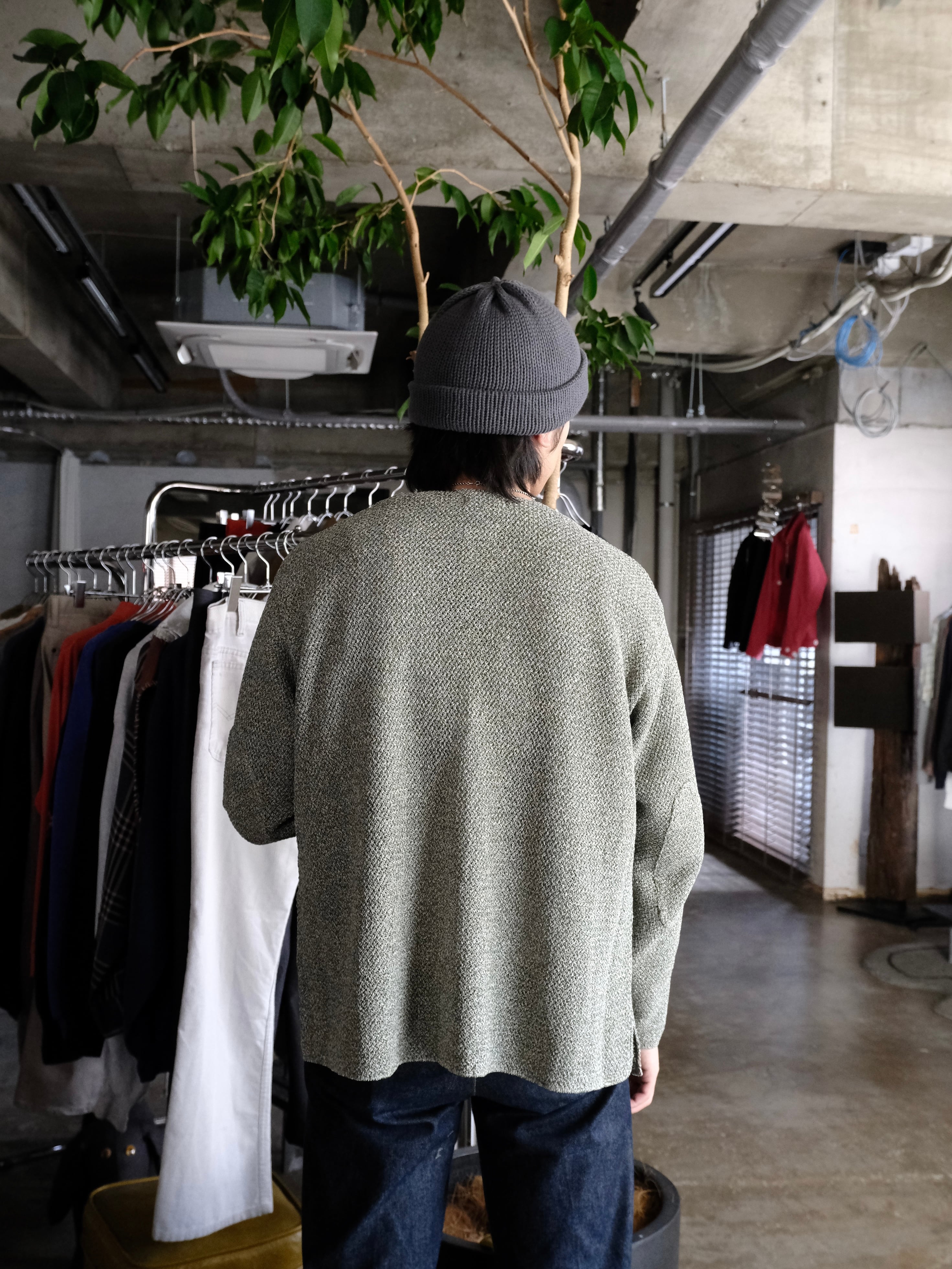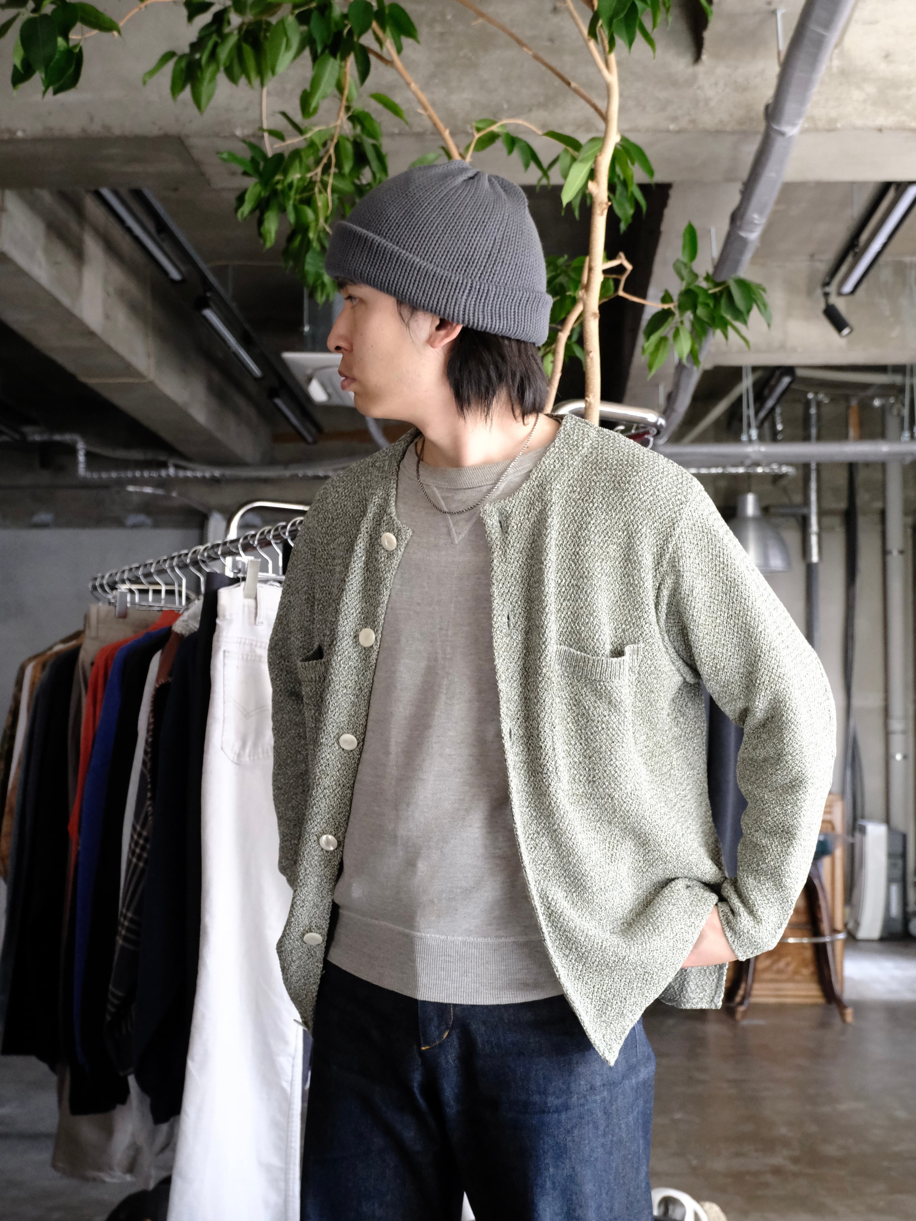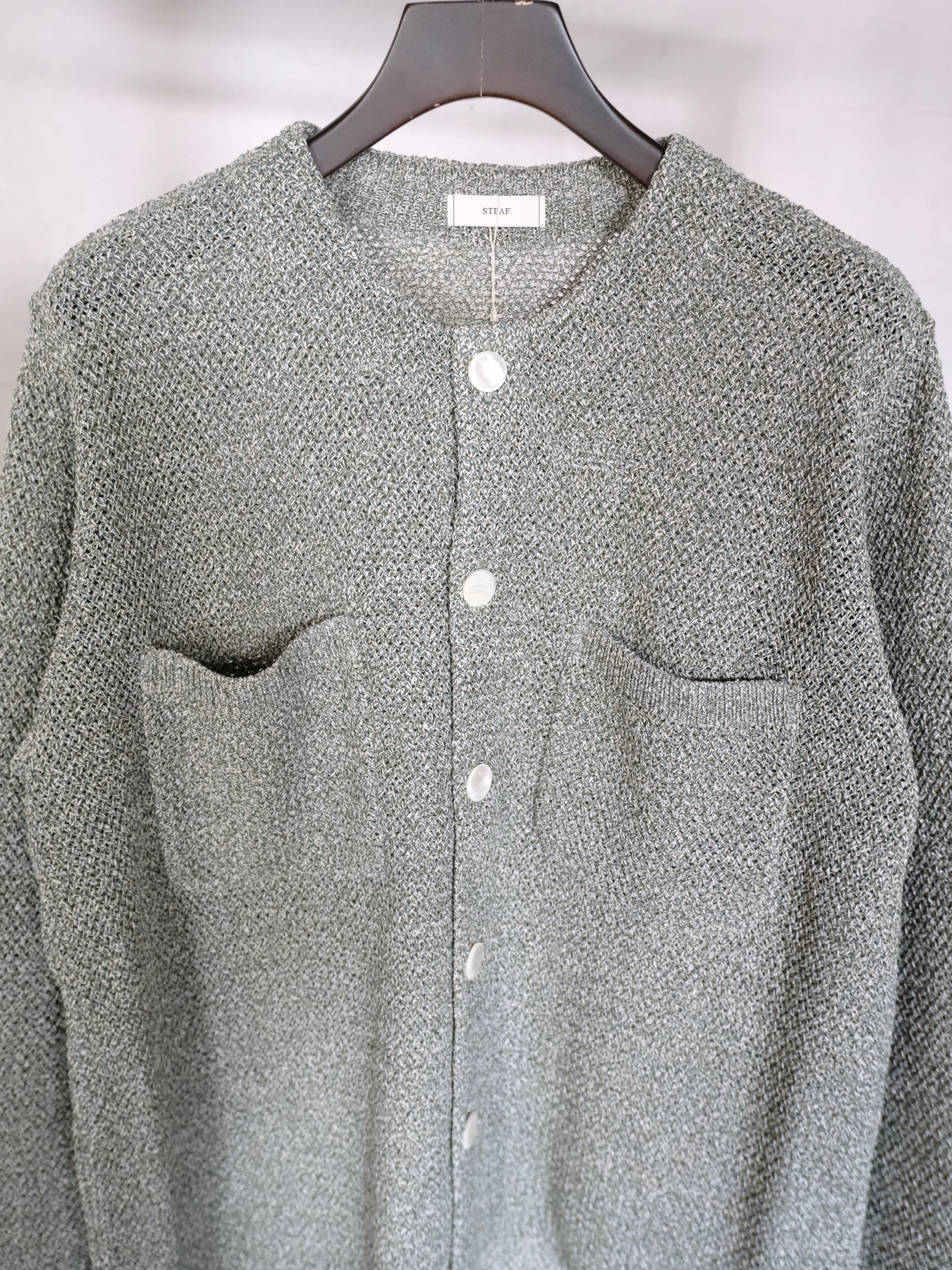 和紙とポリエステルの糸をWカバーした3色杢素材をバスケット編みで編み立てた7Gのカーディガン。