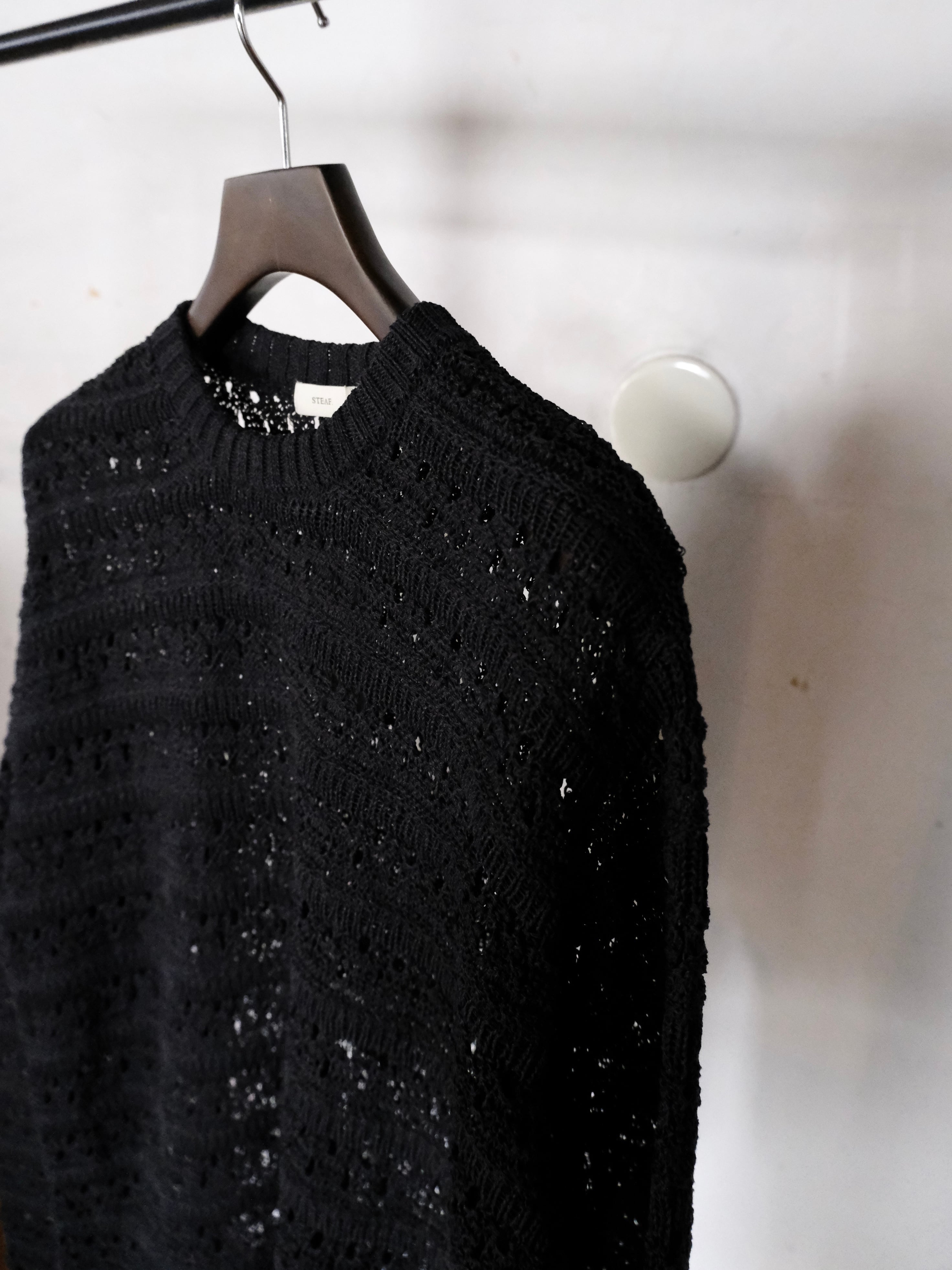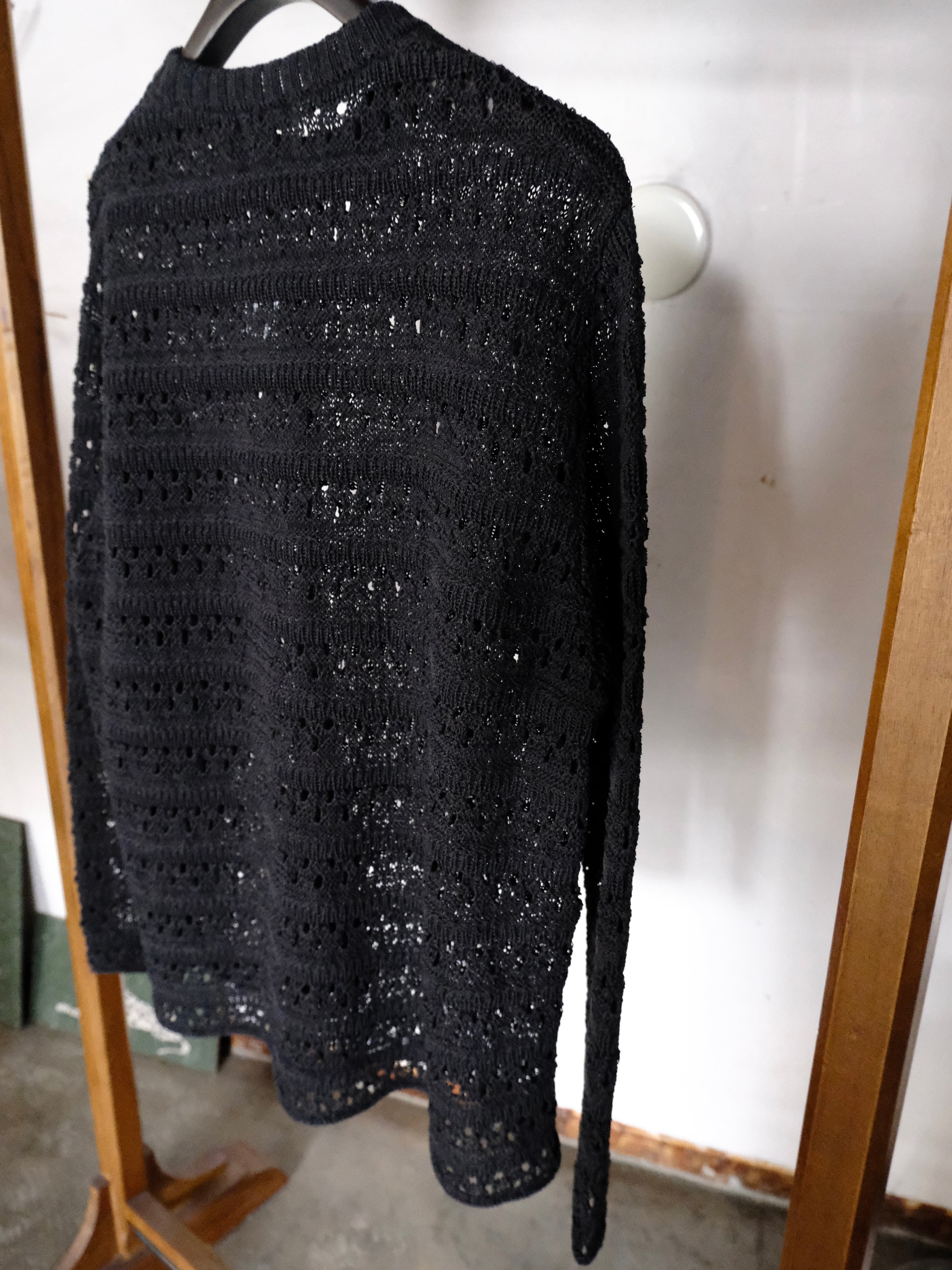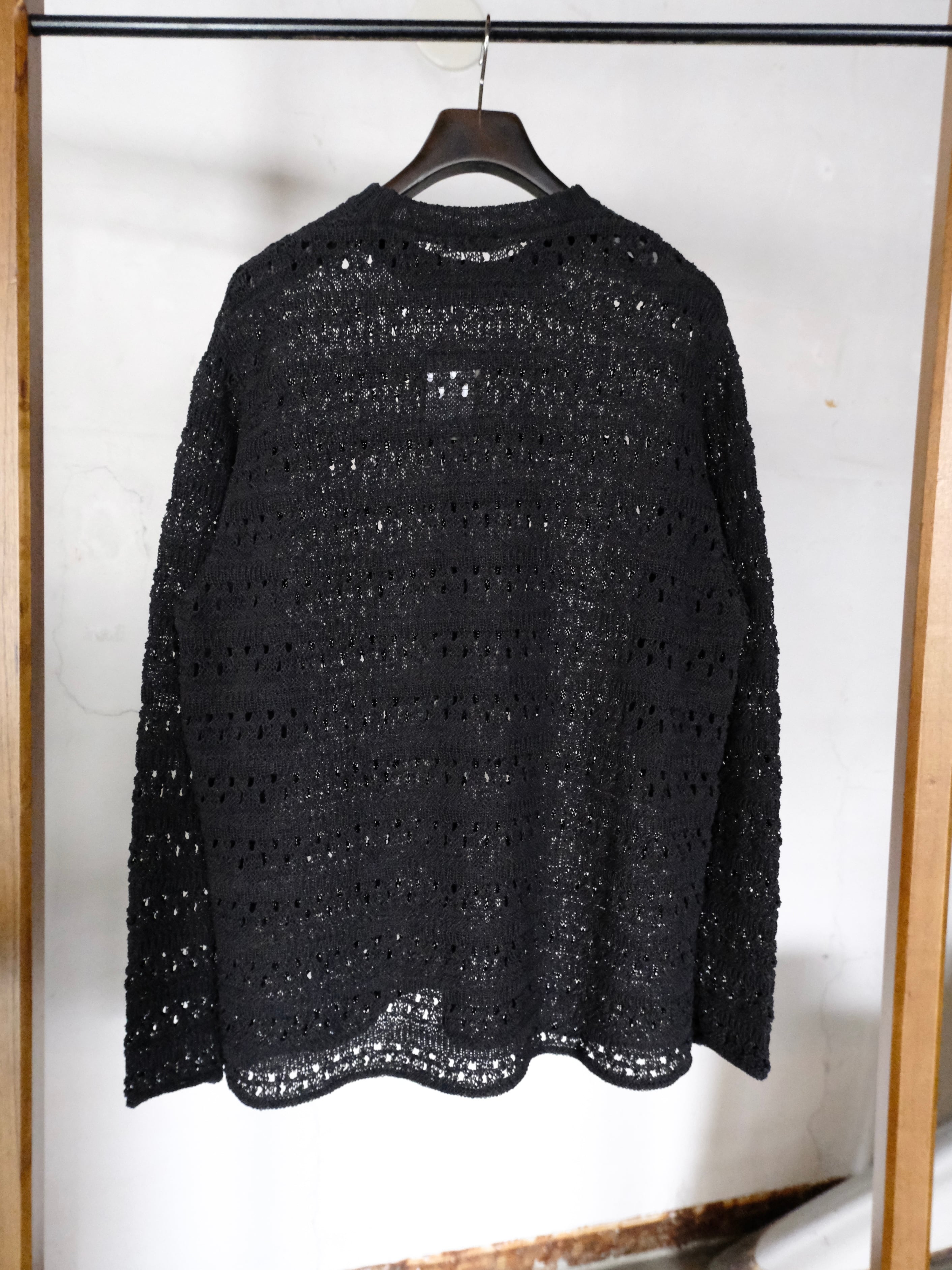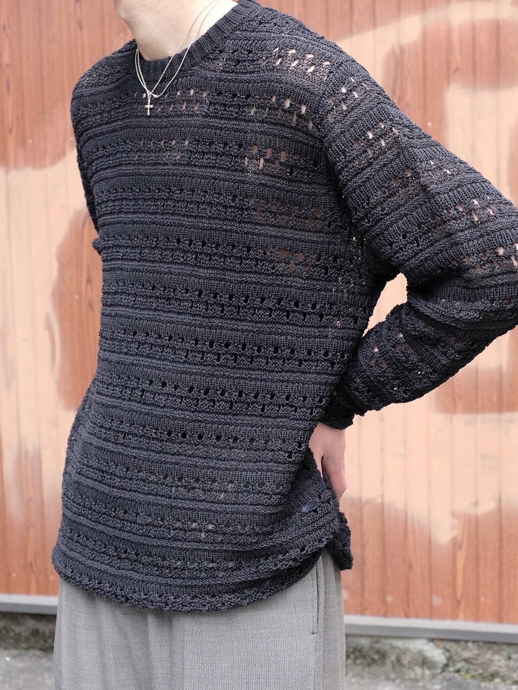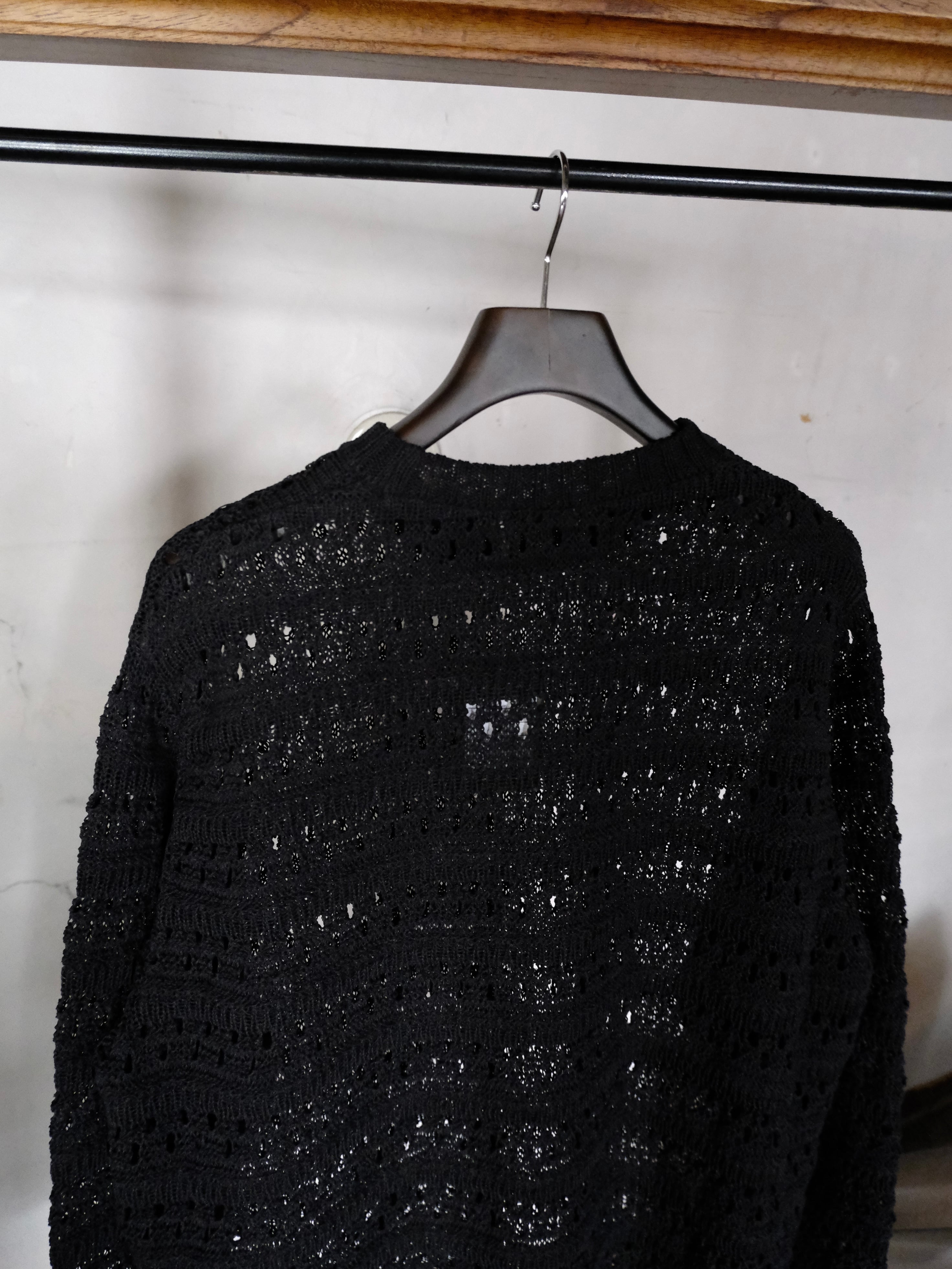麻の様なドライタッチを再現したポリエステルと和紙のオリジナルの柄のメッシュクルーネックニット。