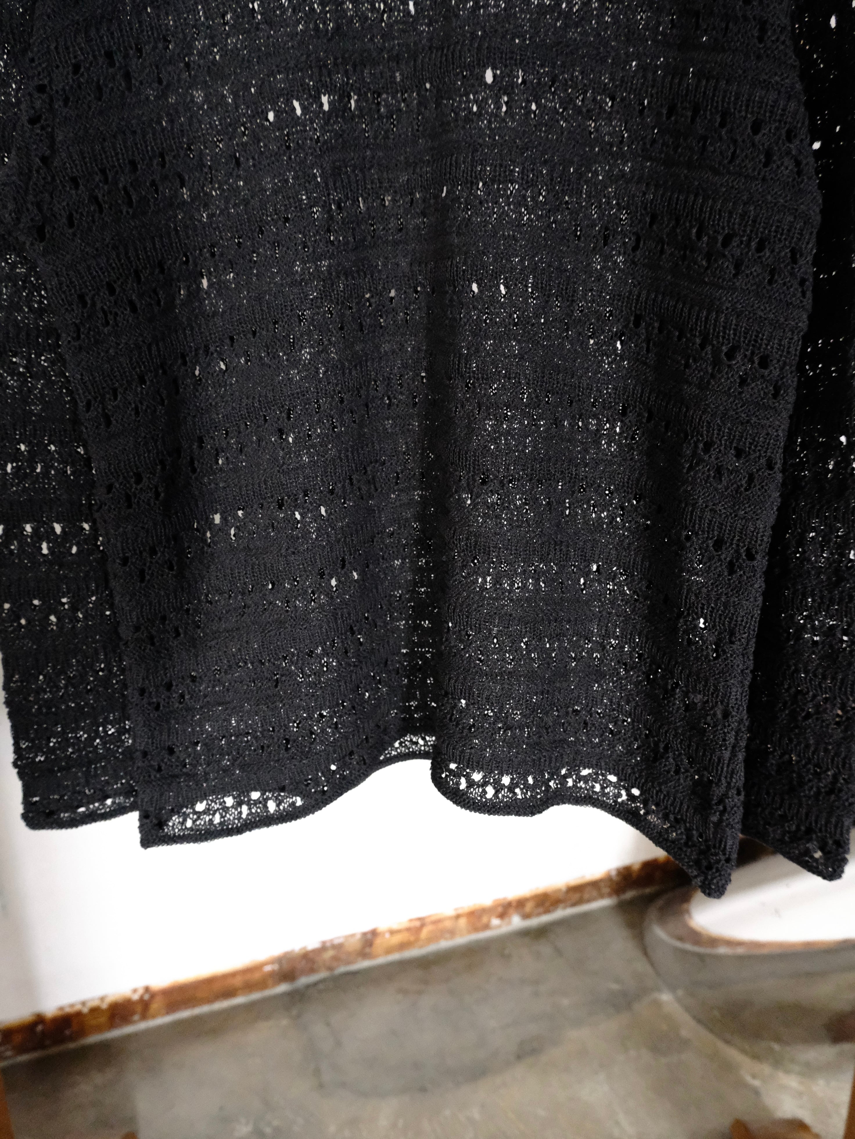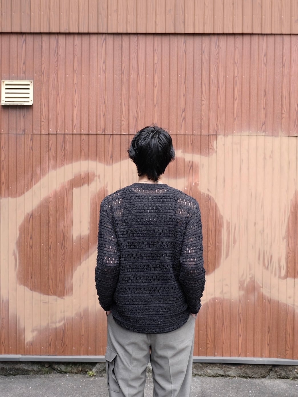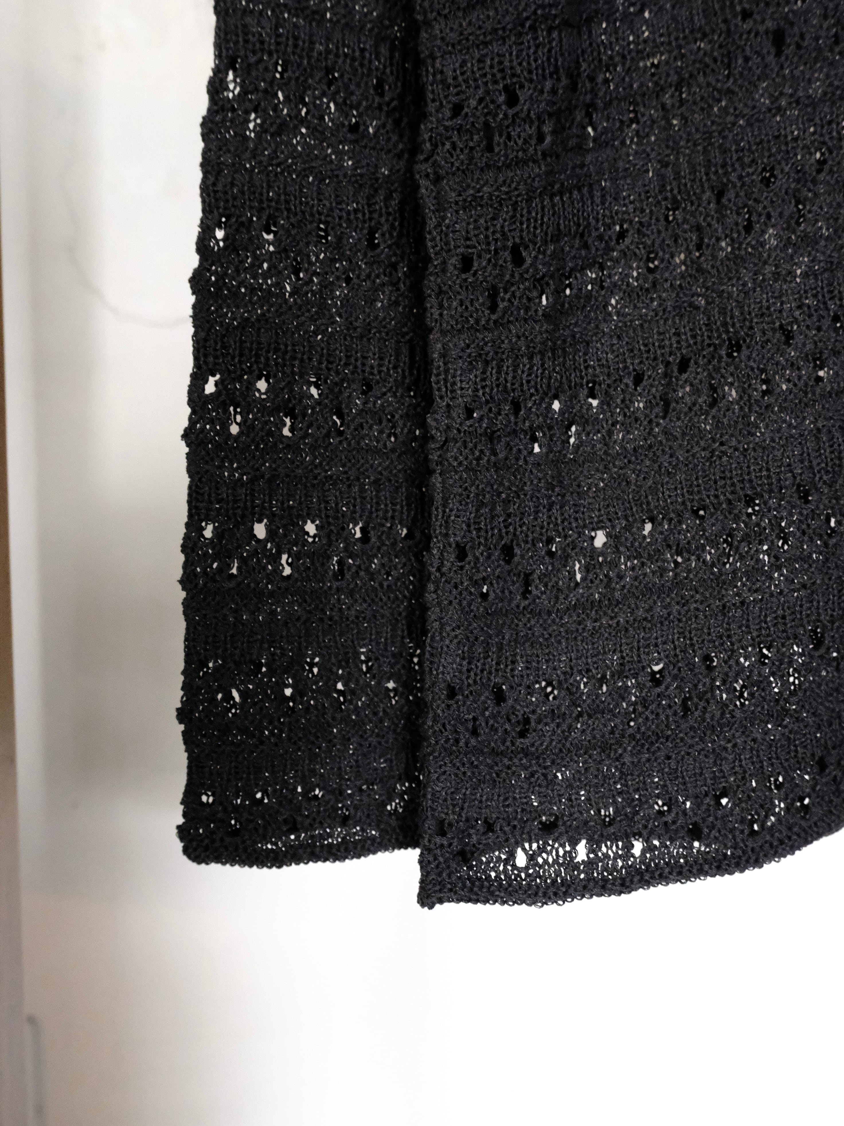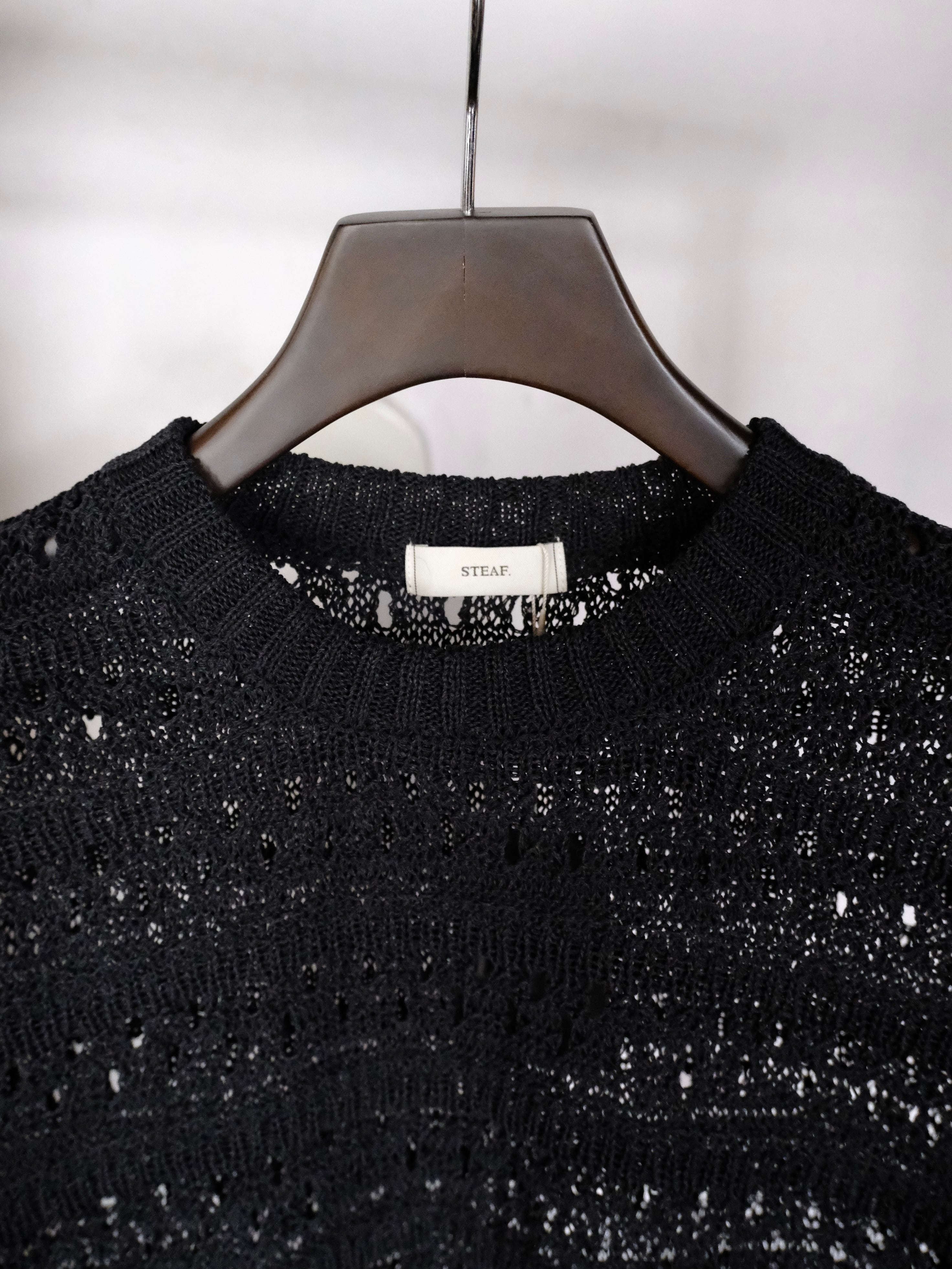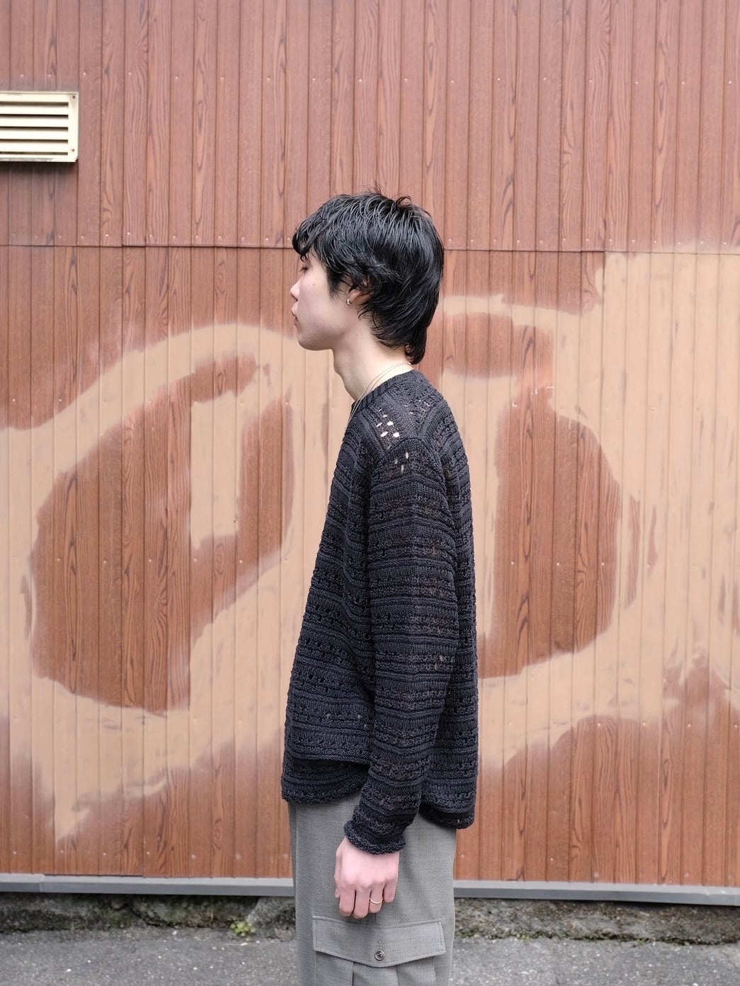 麻の様なドライタッチを再現したポリエステルと和紙のオリジナルの柄のメッシュクルーネックニット。
