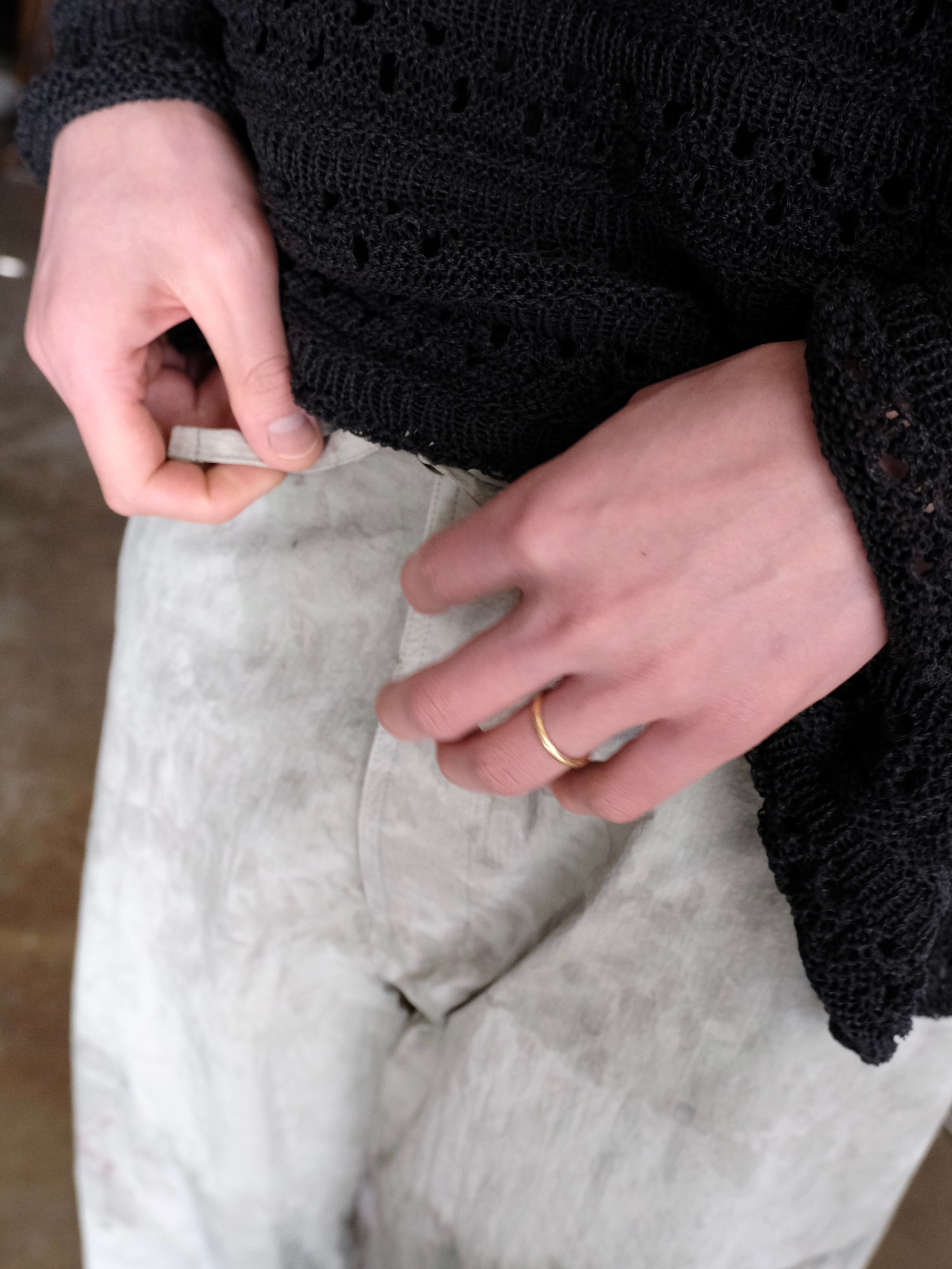 ヒップまわりにはゆとりを持たせつつ、ウエストを絞ることで、構築的なシルエットを形成しています。