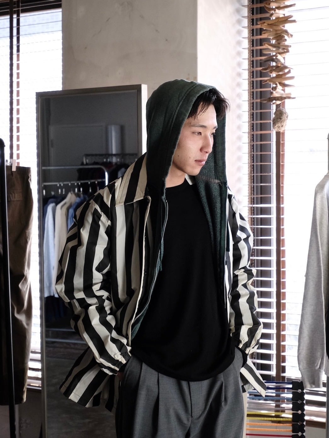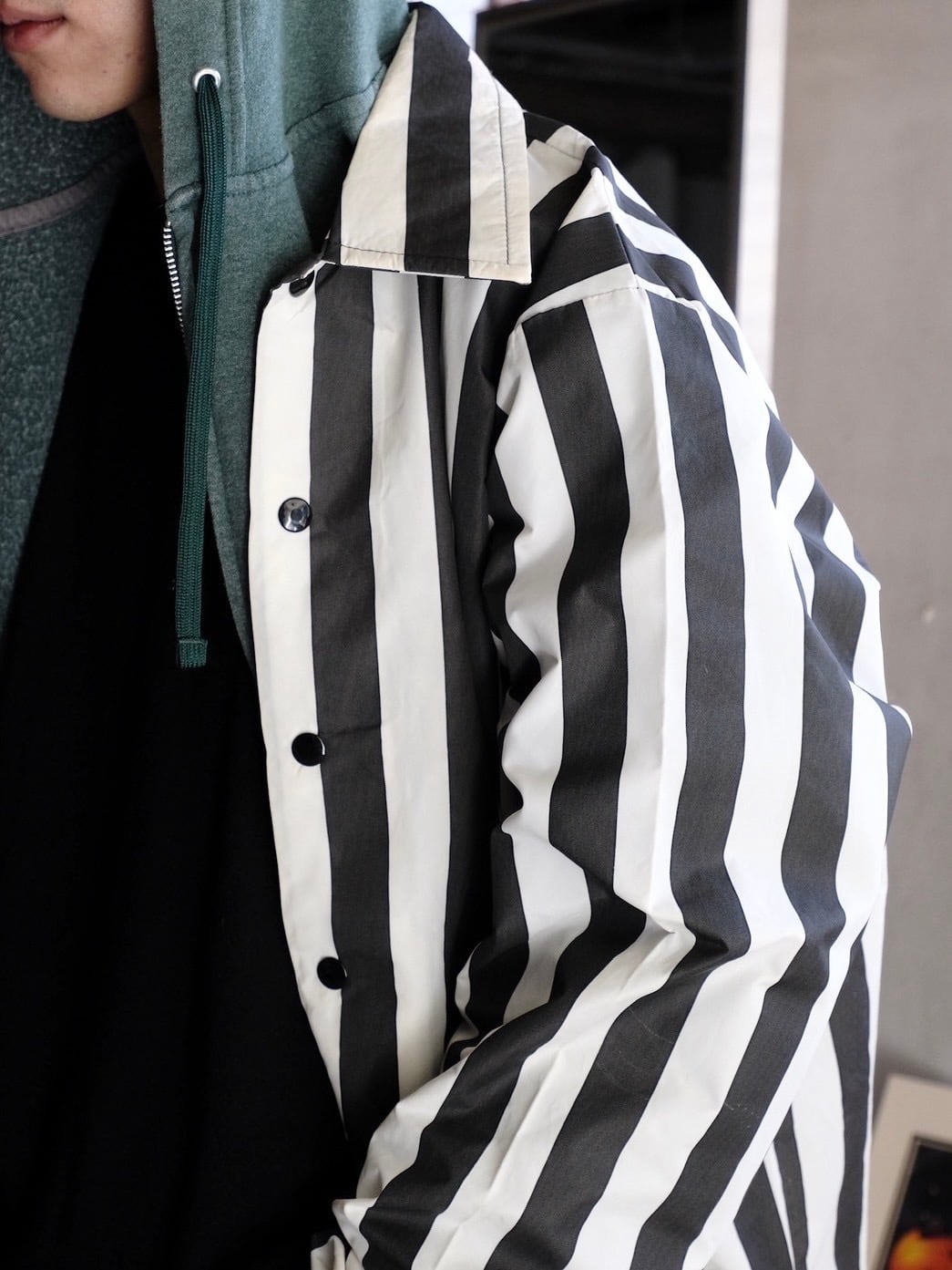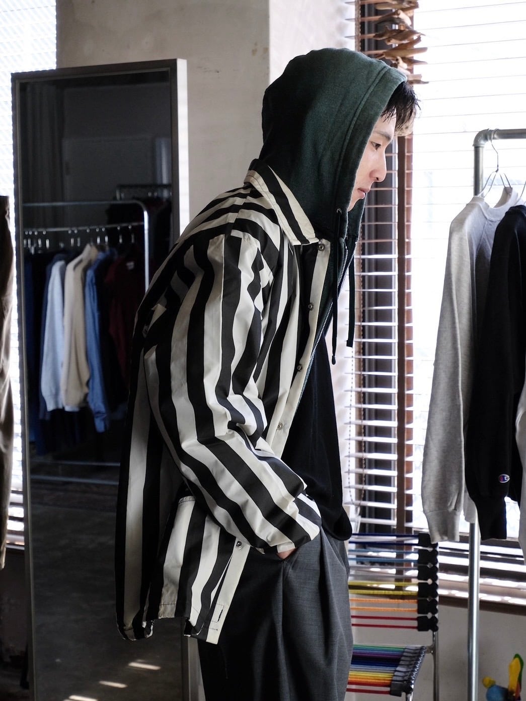 パリッとした化学繊維が使用されており、コーチジャケットのようなサイズ感で着用いただけます。