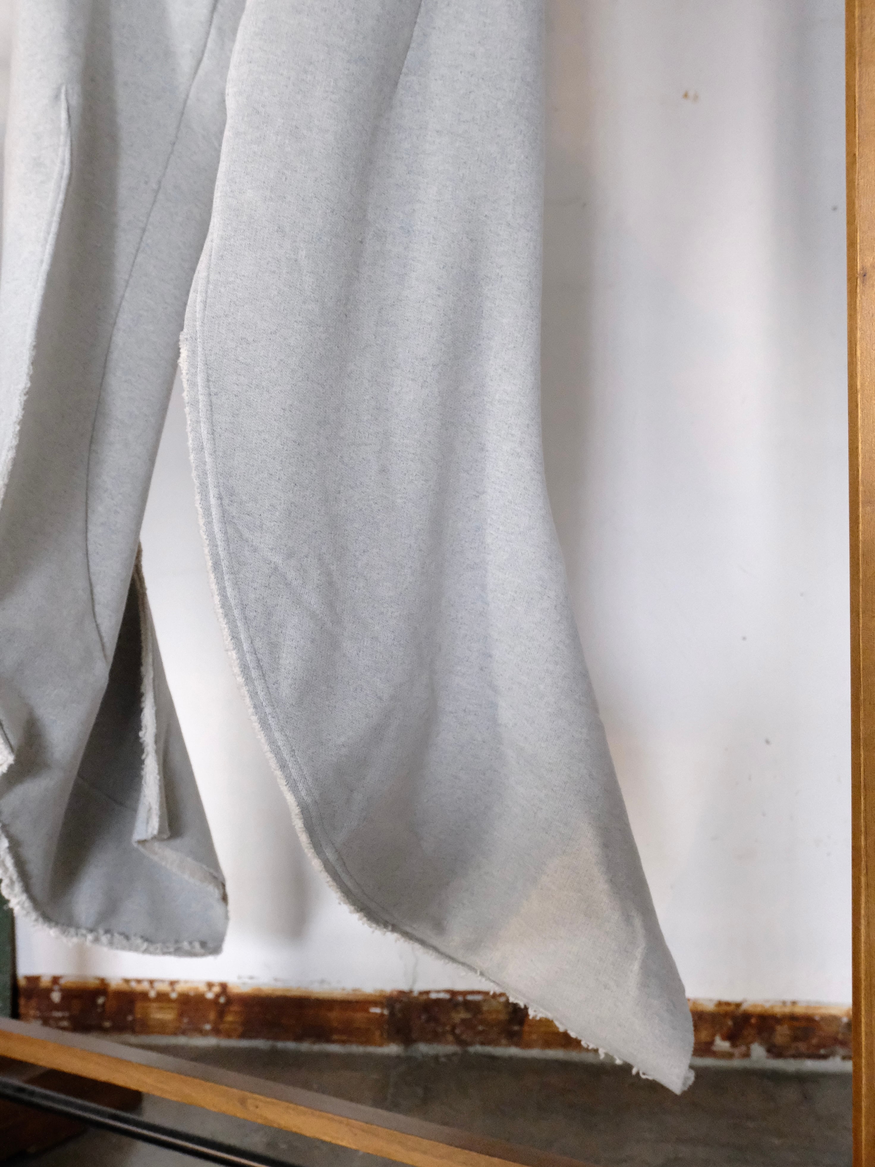 前に生地が溜まって、後ろの見え方は引っ張られているので吊って綺麗な直線になります。