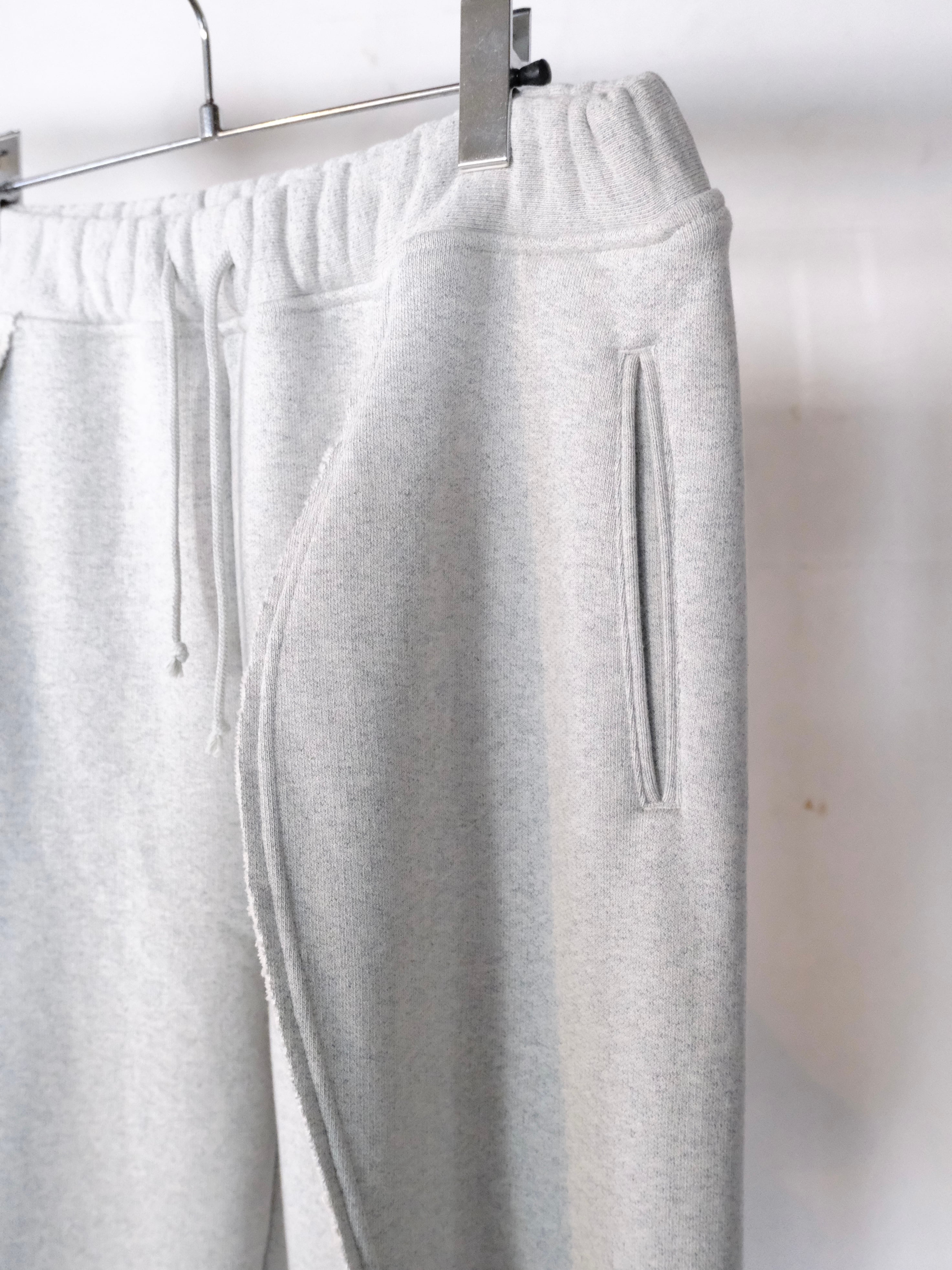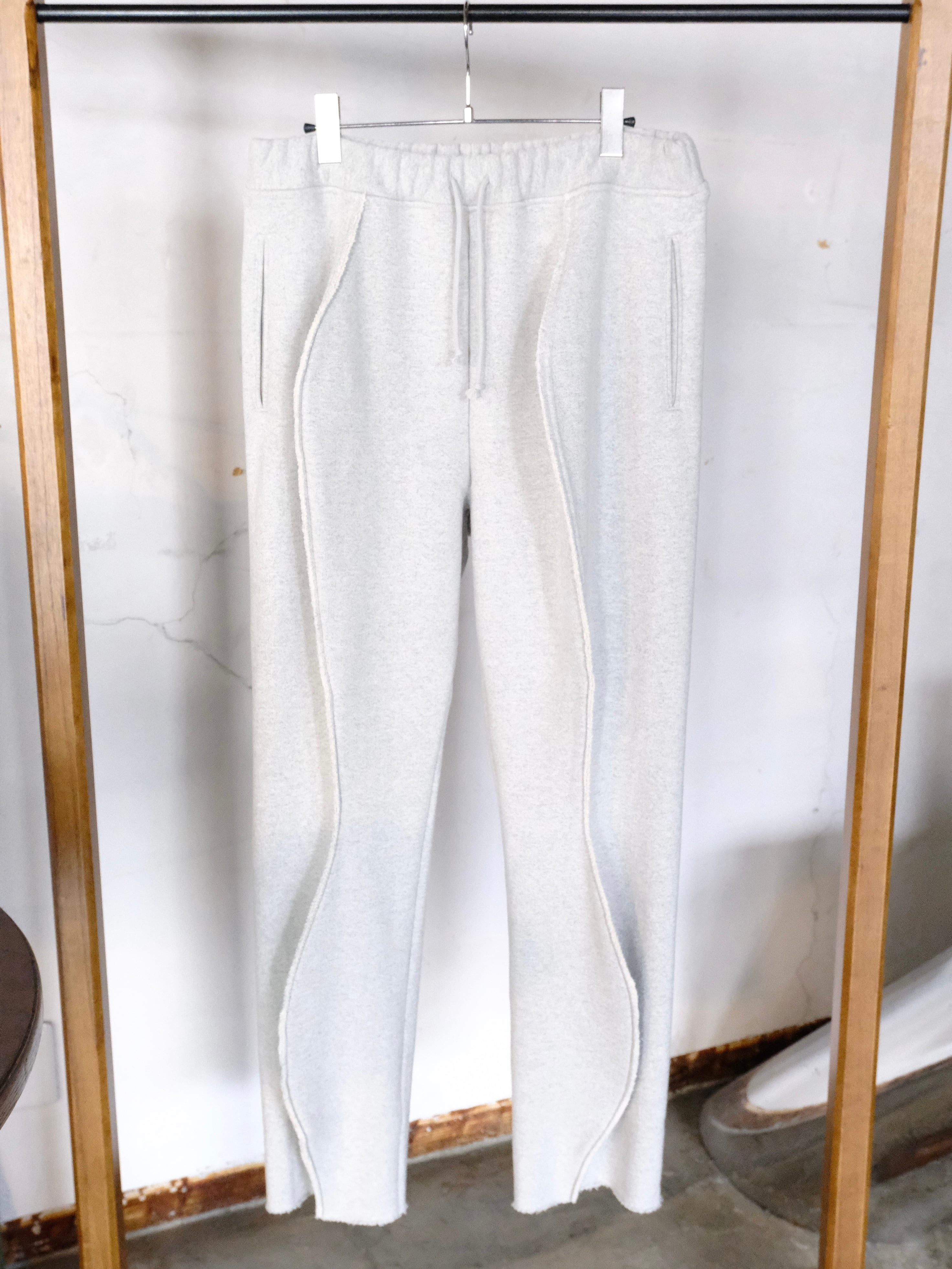 正面から見るとテーパードパンツですが、センタープレスをつまむことにより横から見ると、膝部分だけシェイプさせて太もも位置とひざ下位置が曲線になり、カーブが2段階あるパンツになります。