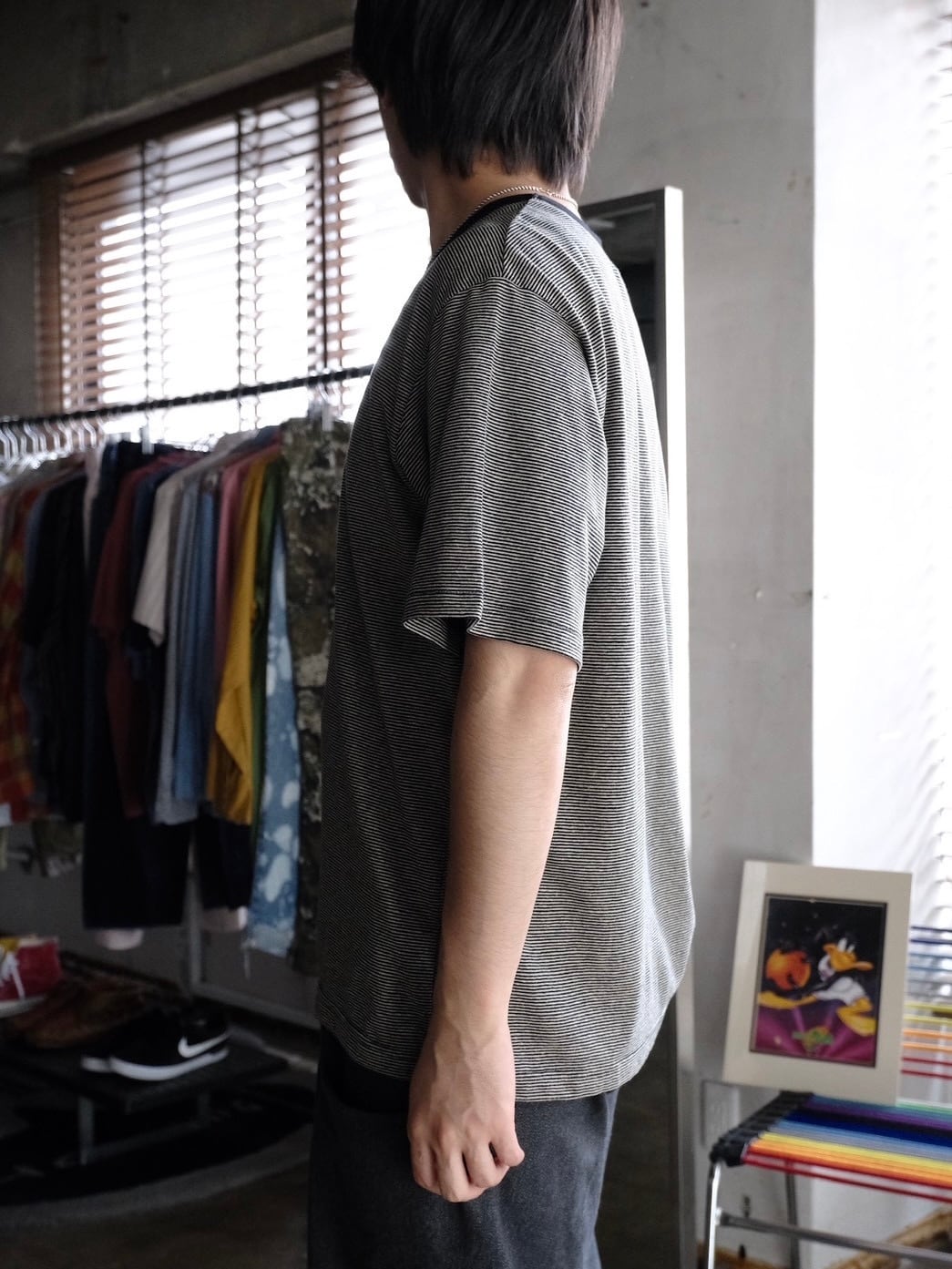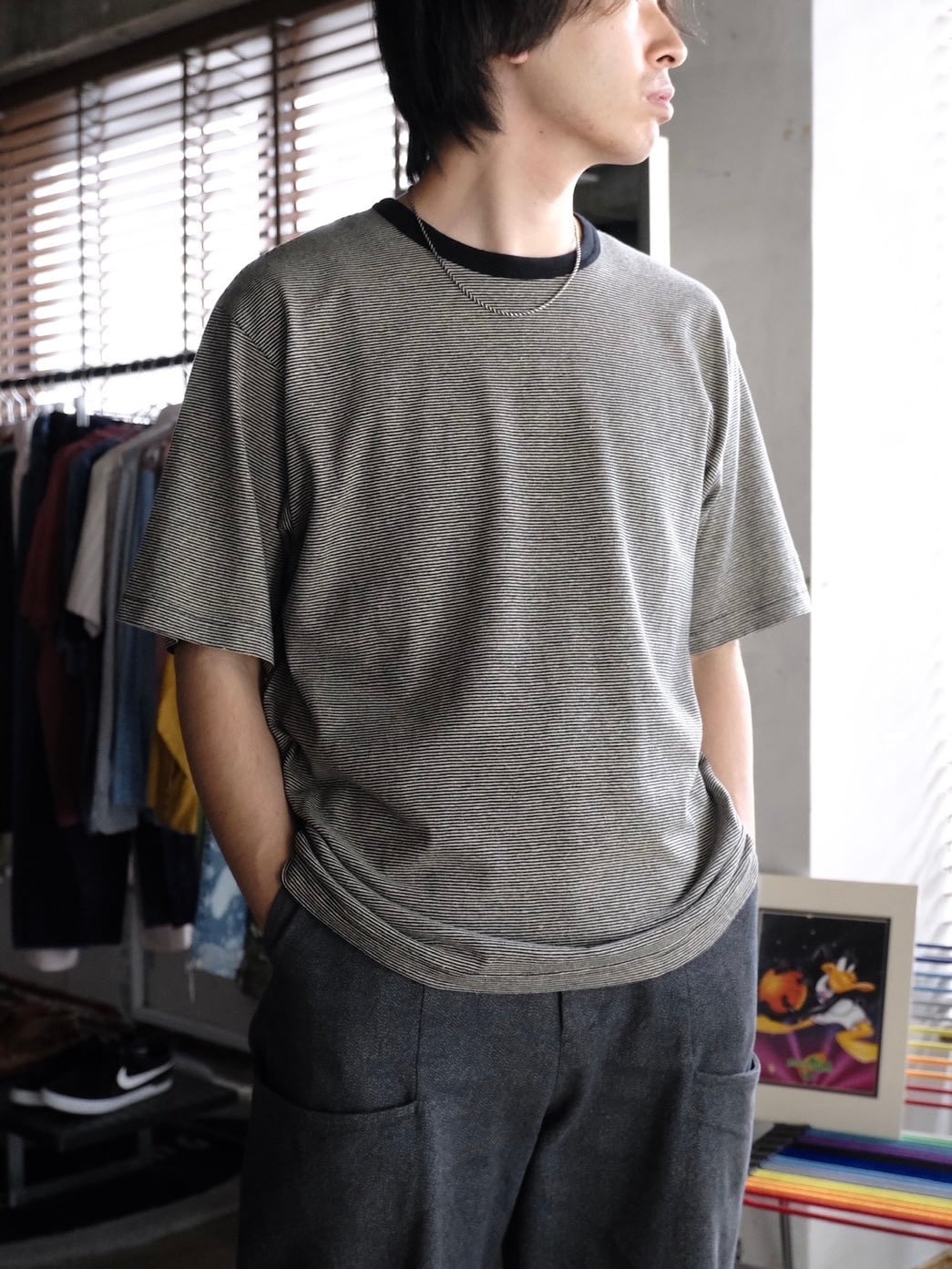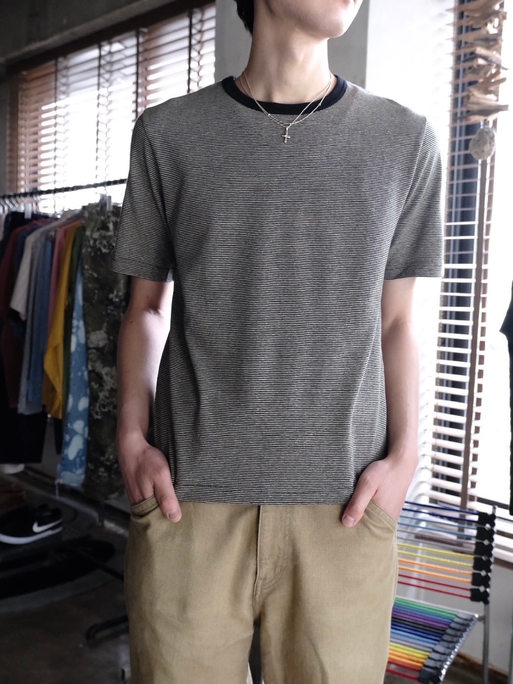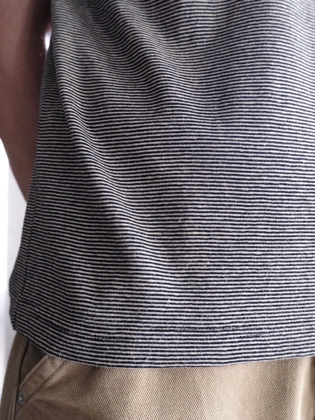 繊維で一番古いとされているヘンプをオーガニックコットンと交互に編み立てたミジンボーダーで仕立てられたTシャツ。