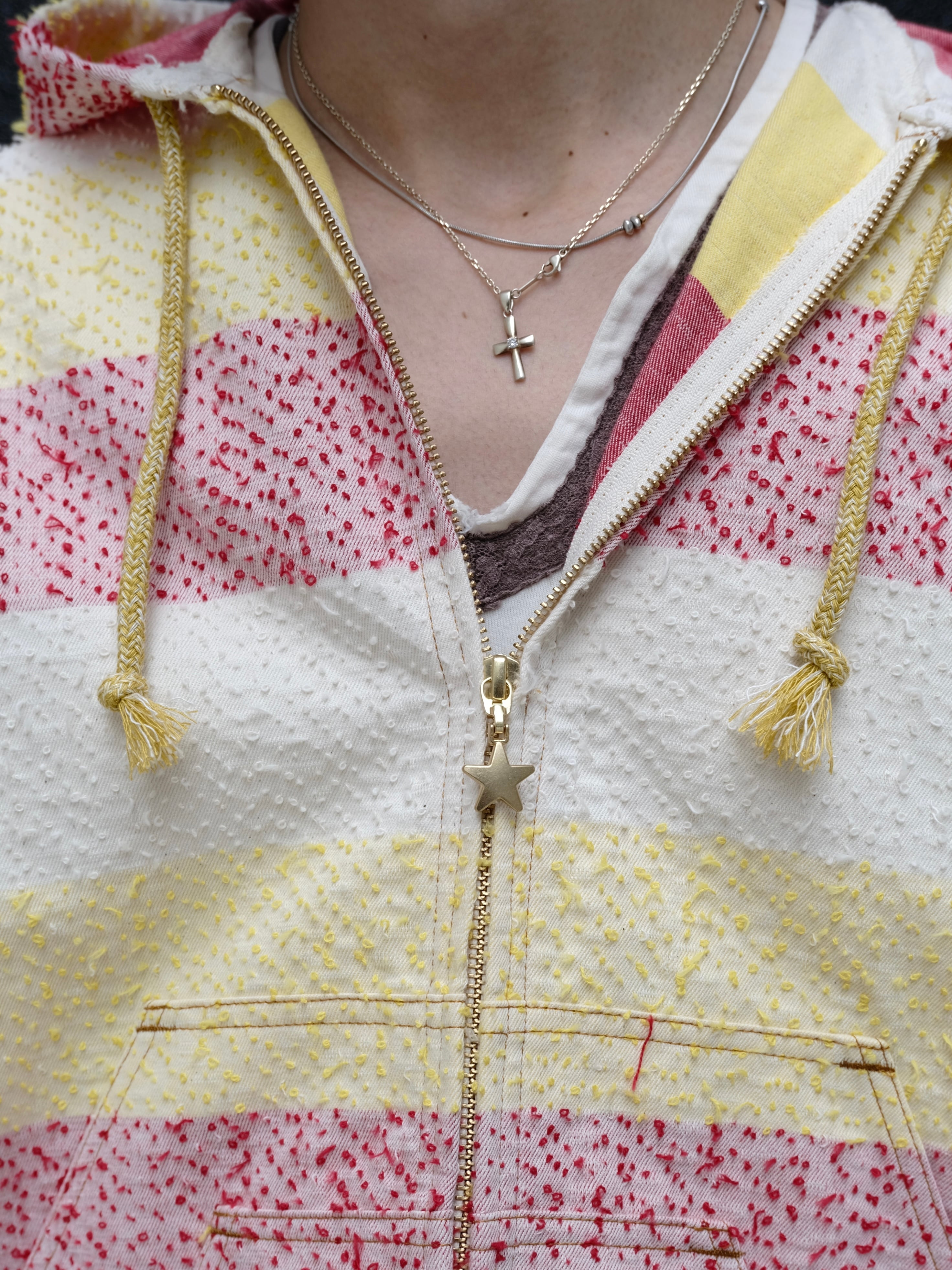 フロントはジップによる開閉が可能となっており、ジップチャームが星型なのも魅力的な1枚です。