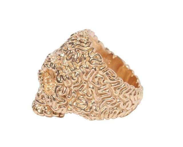 脳柄が象られたスカルリング、ゴールドコーティングVer.。