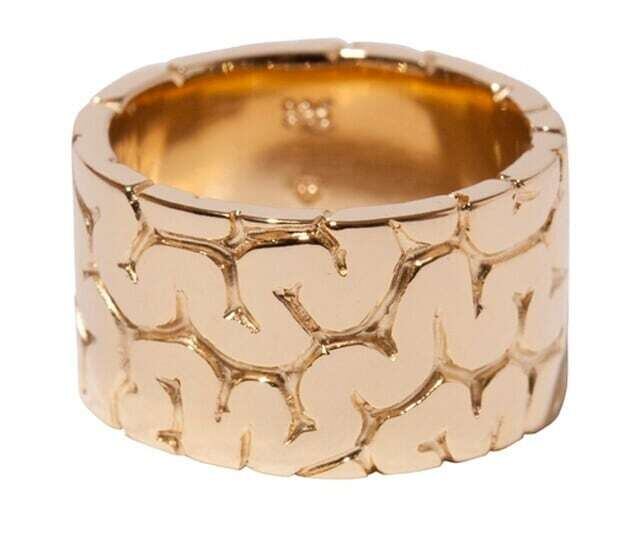脳面柄が彫られた太めの板状リング、ゴールドコーティングVer.。