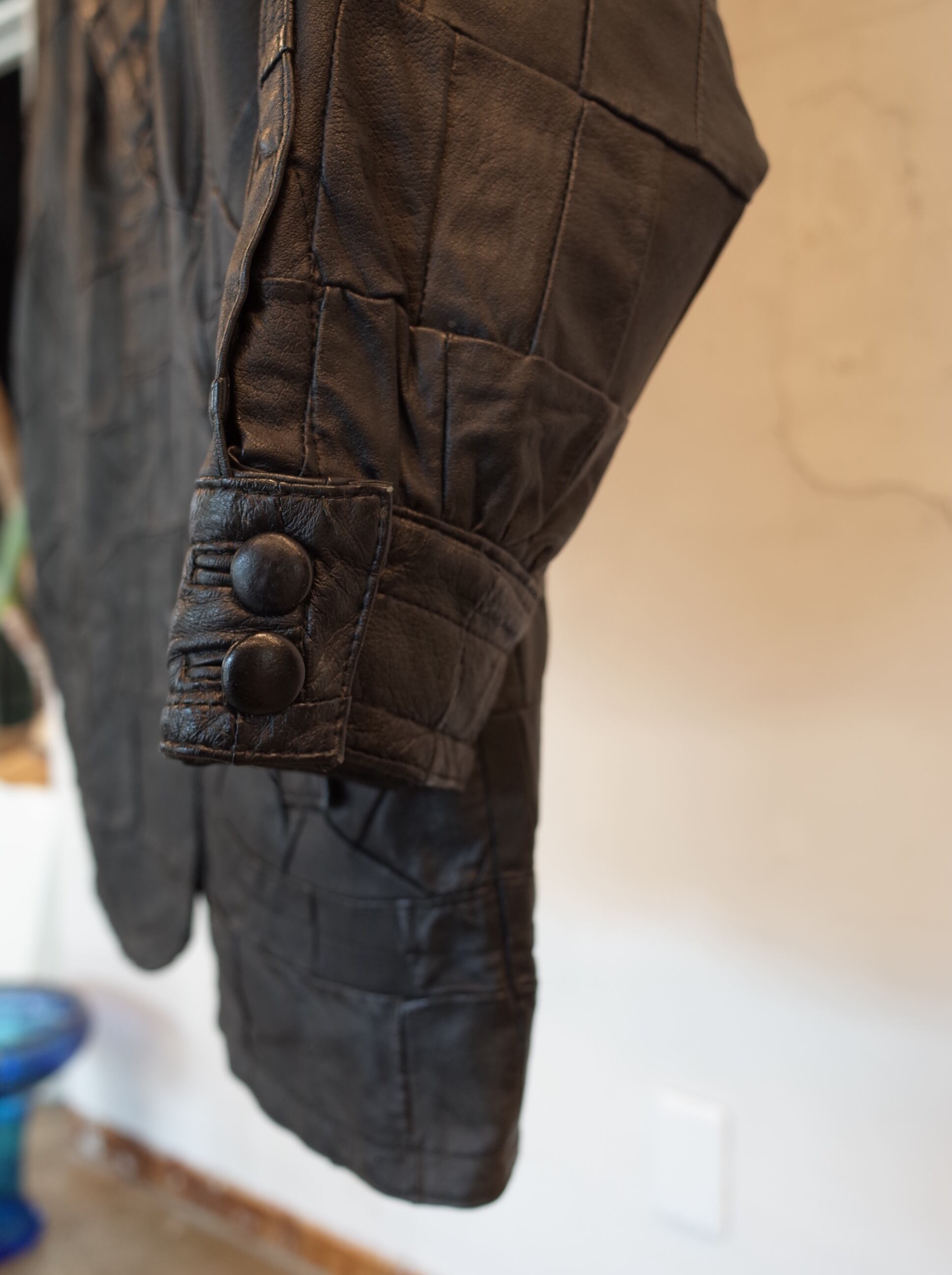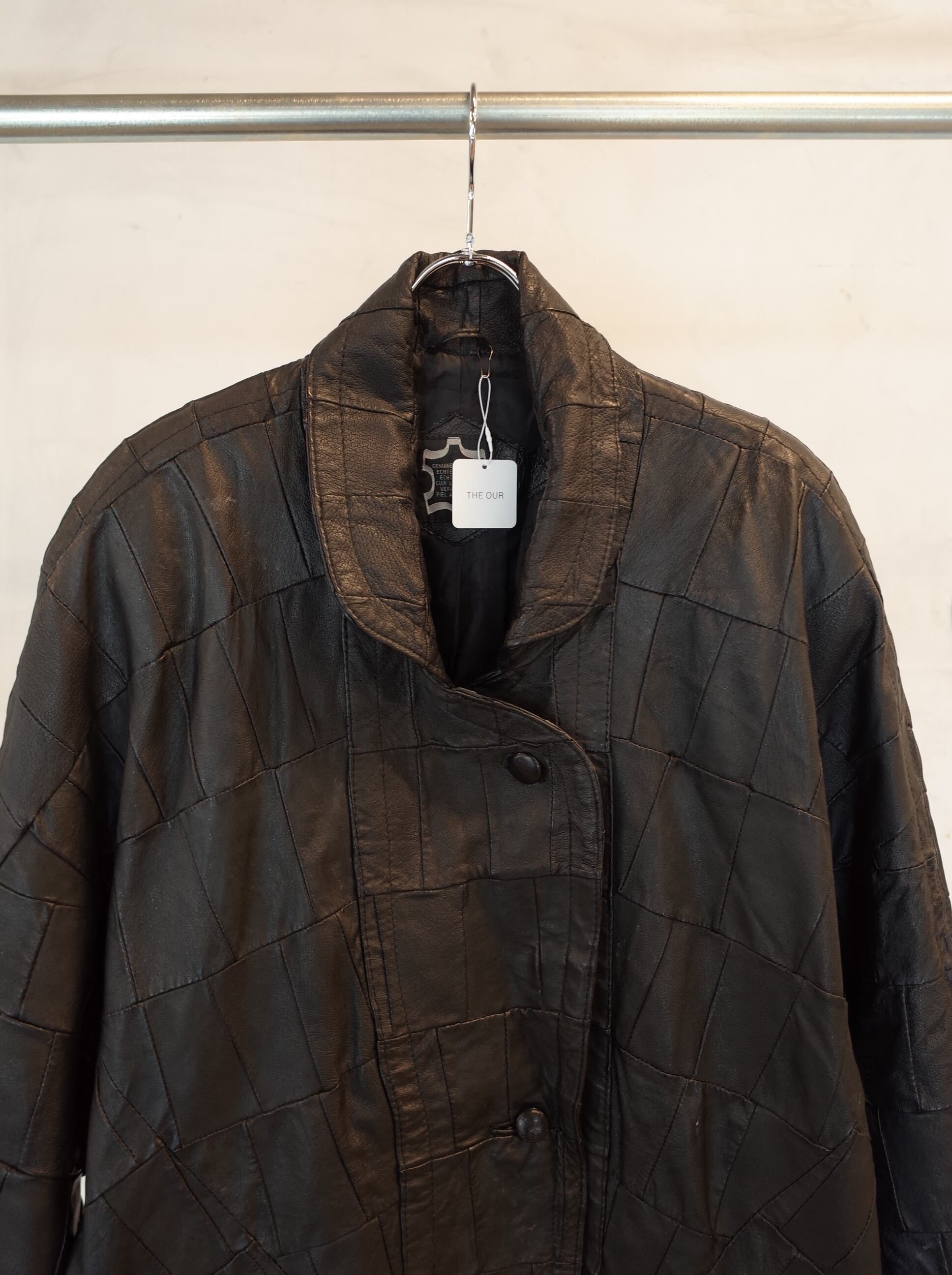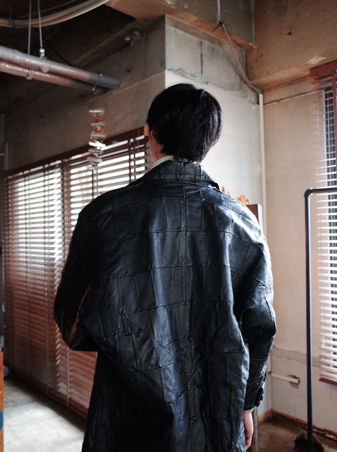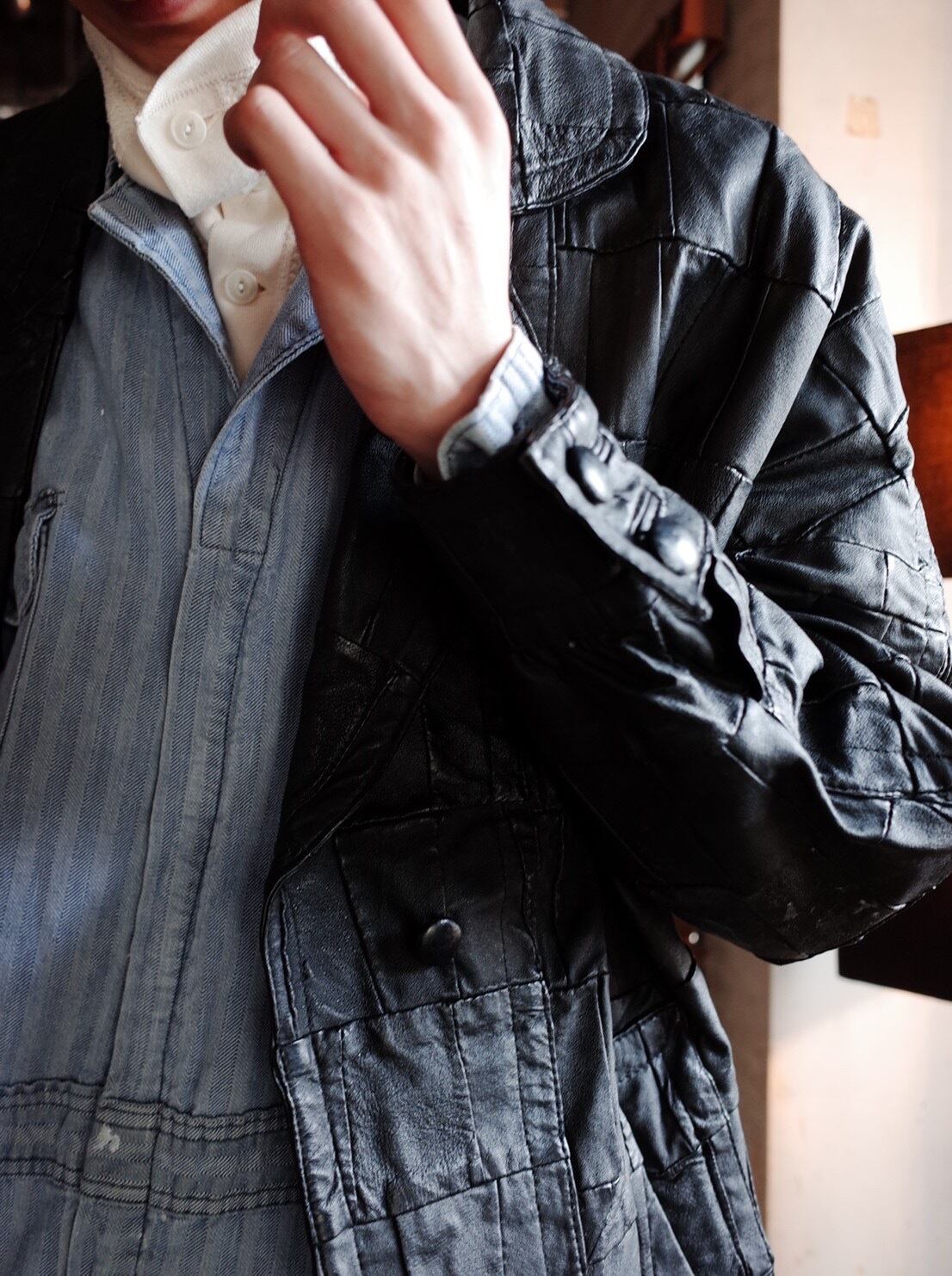 レザーのパッチワークで作られたコートです。