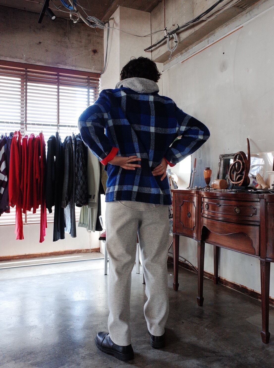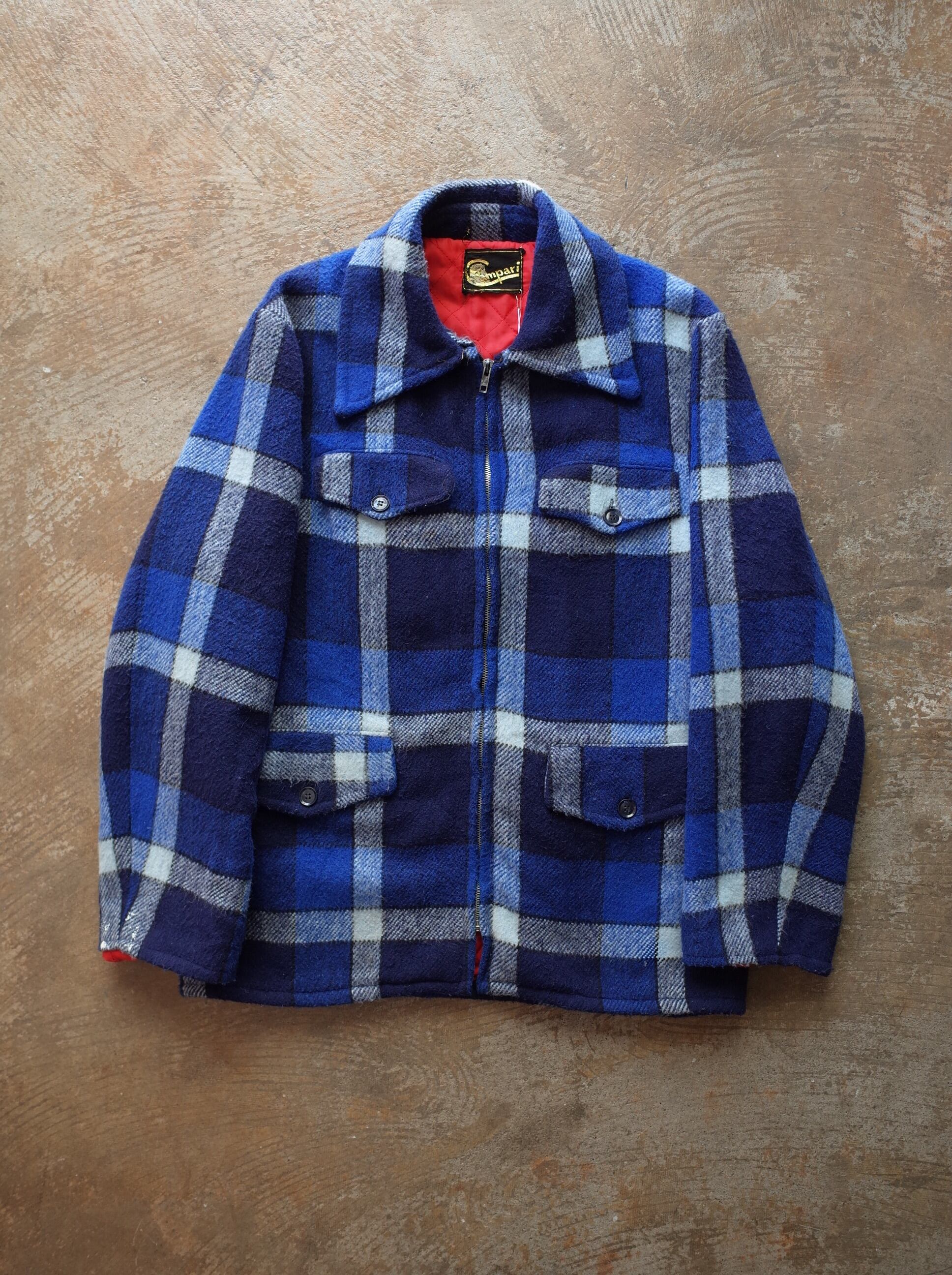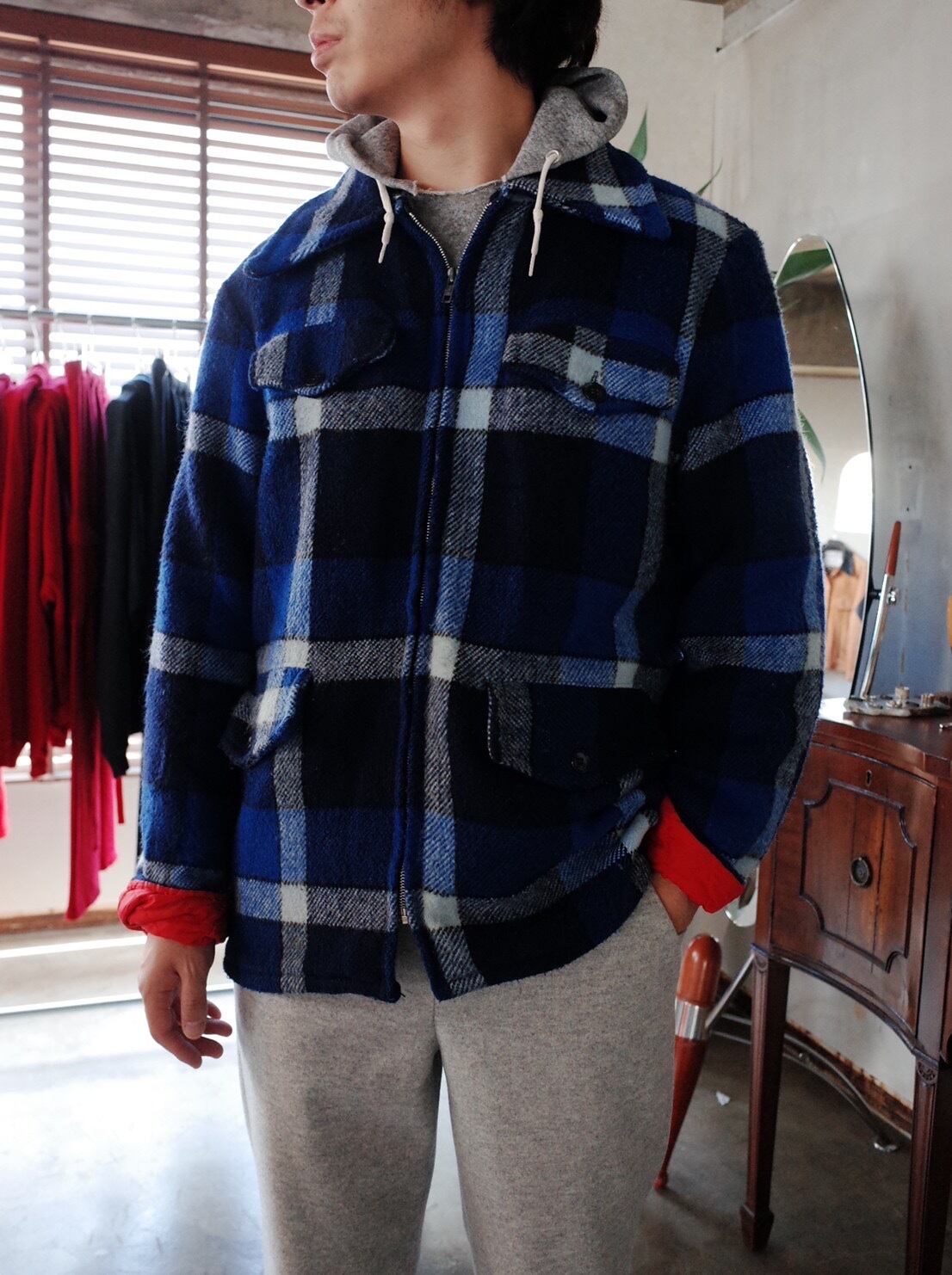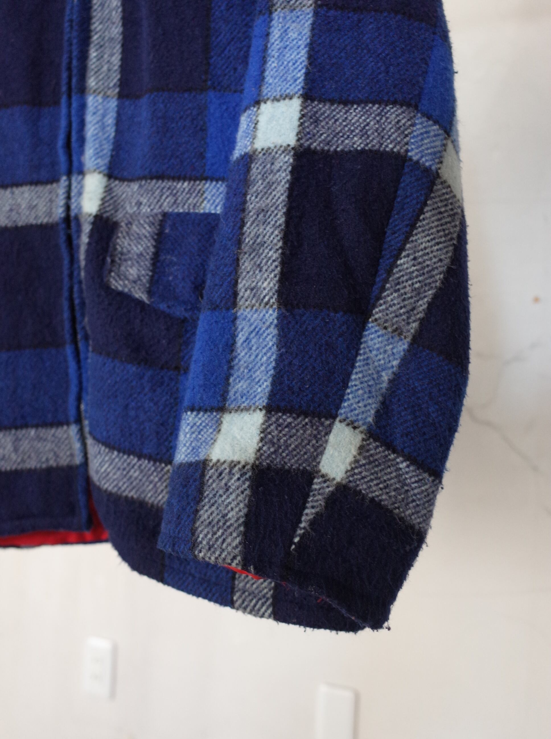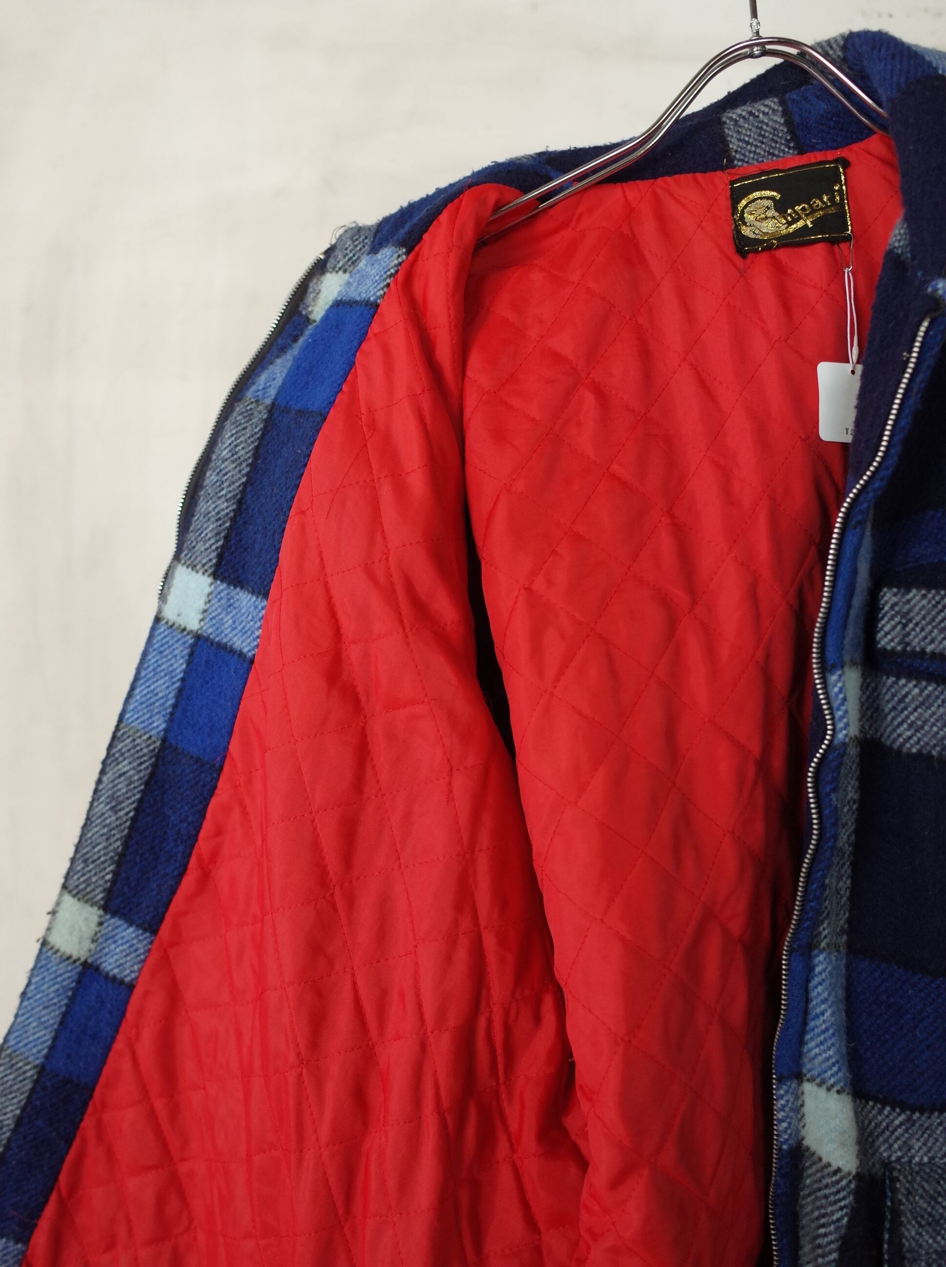 ブルーベースのカジュアルなカラーリングのチェックに裏地の赤が魅力的なジップアップアウターです。