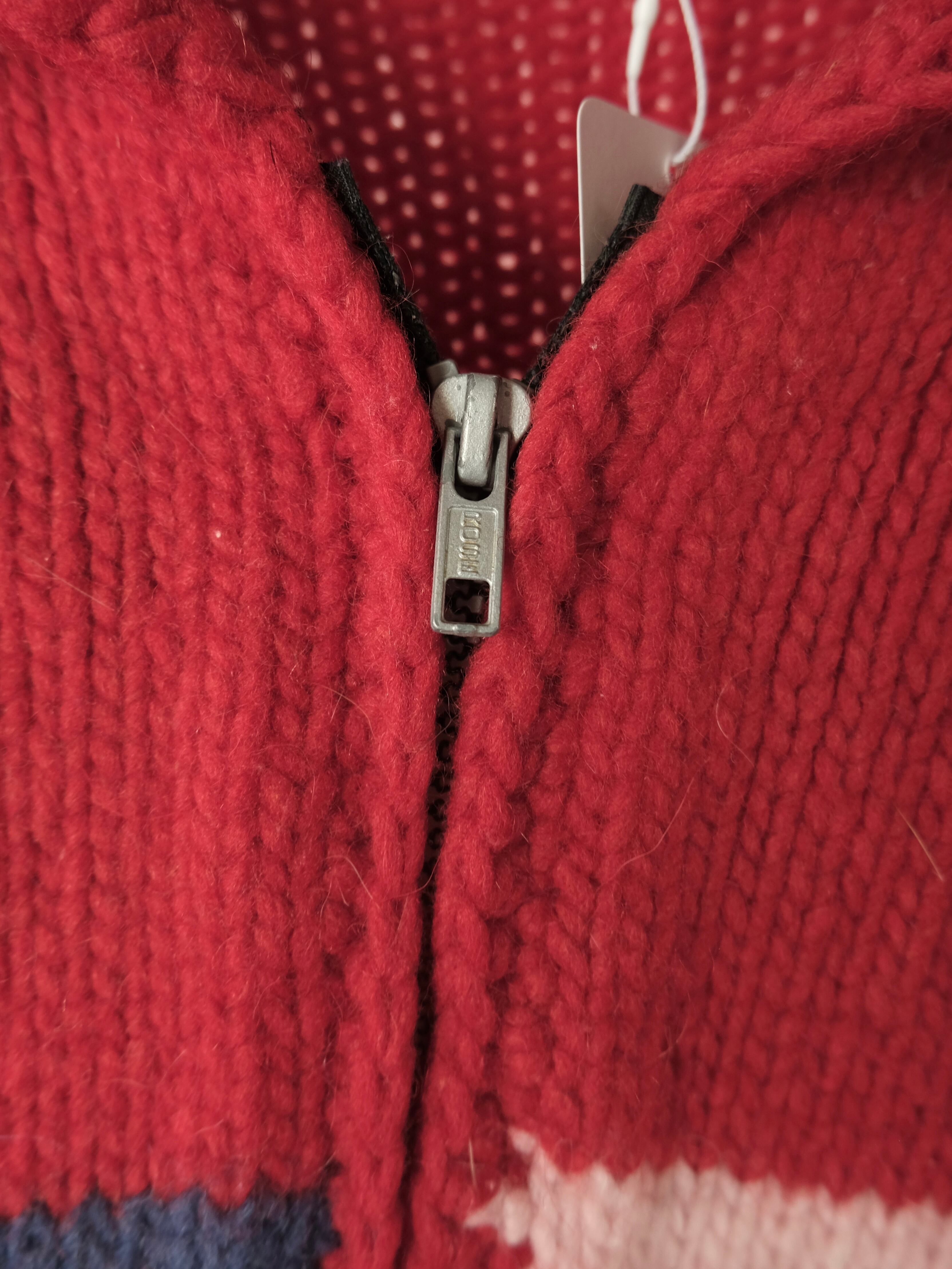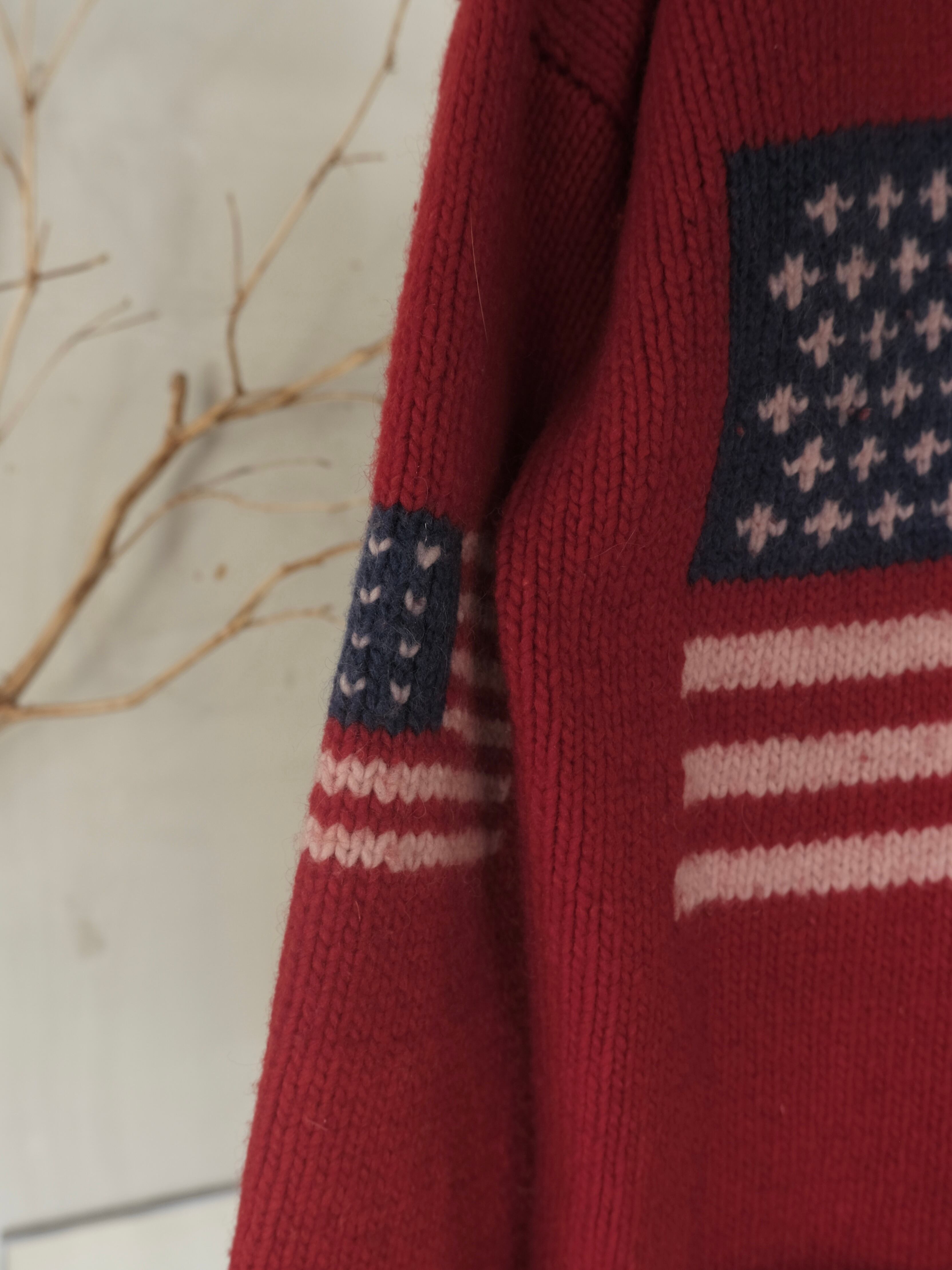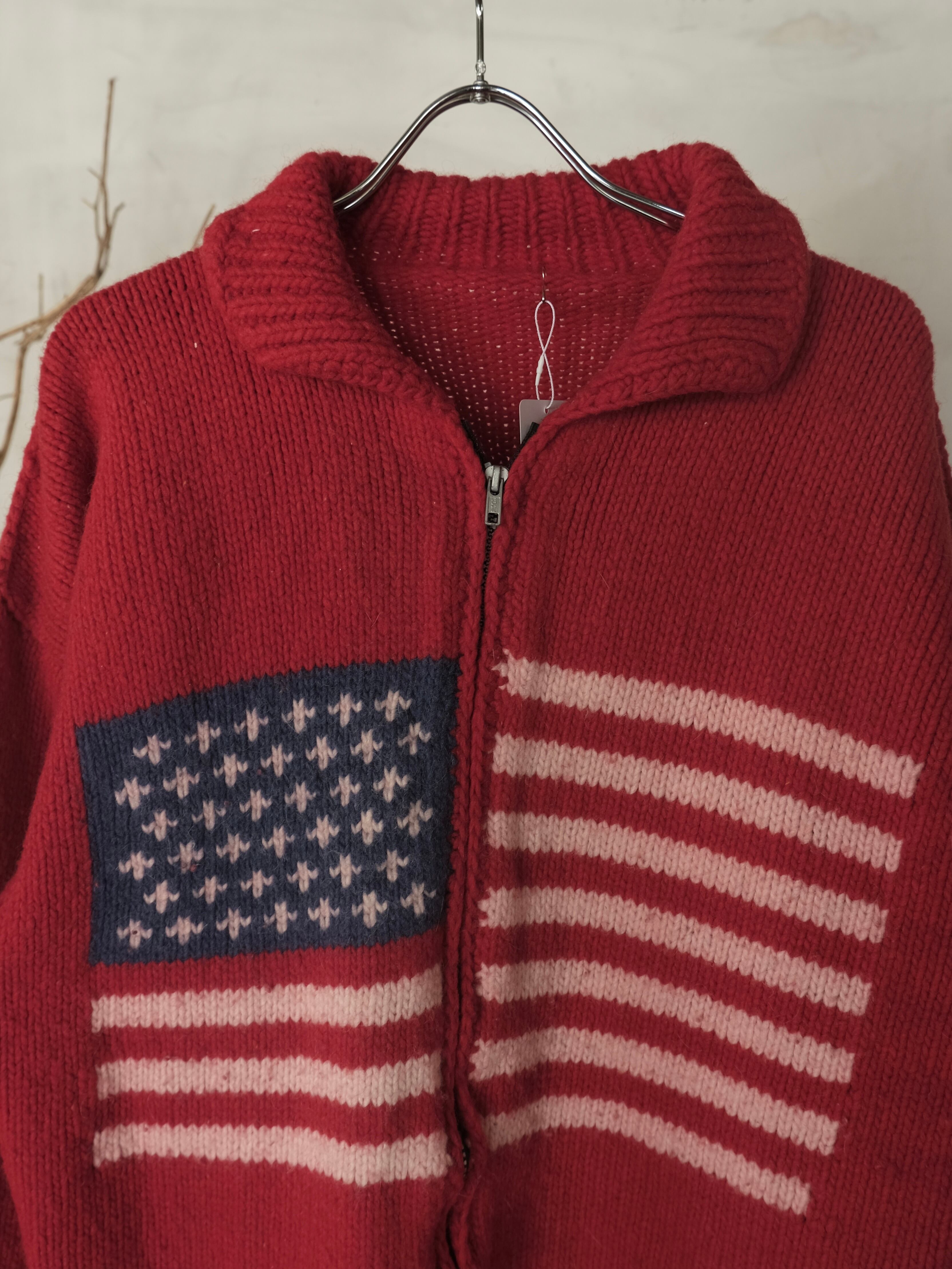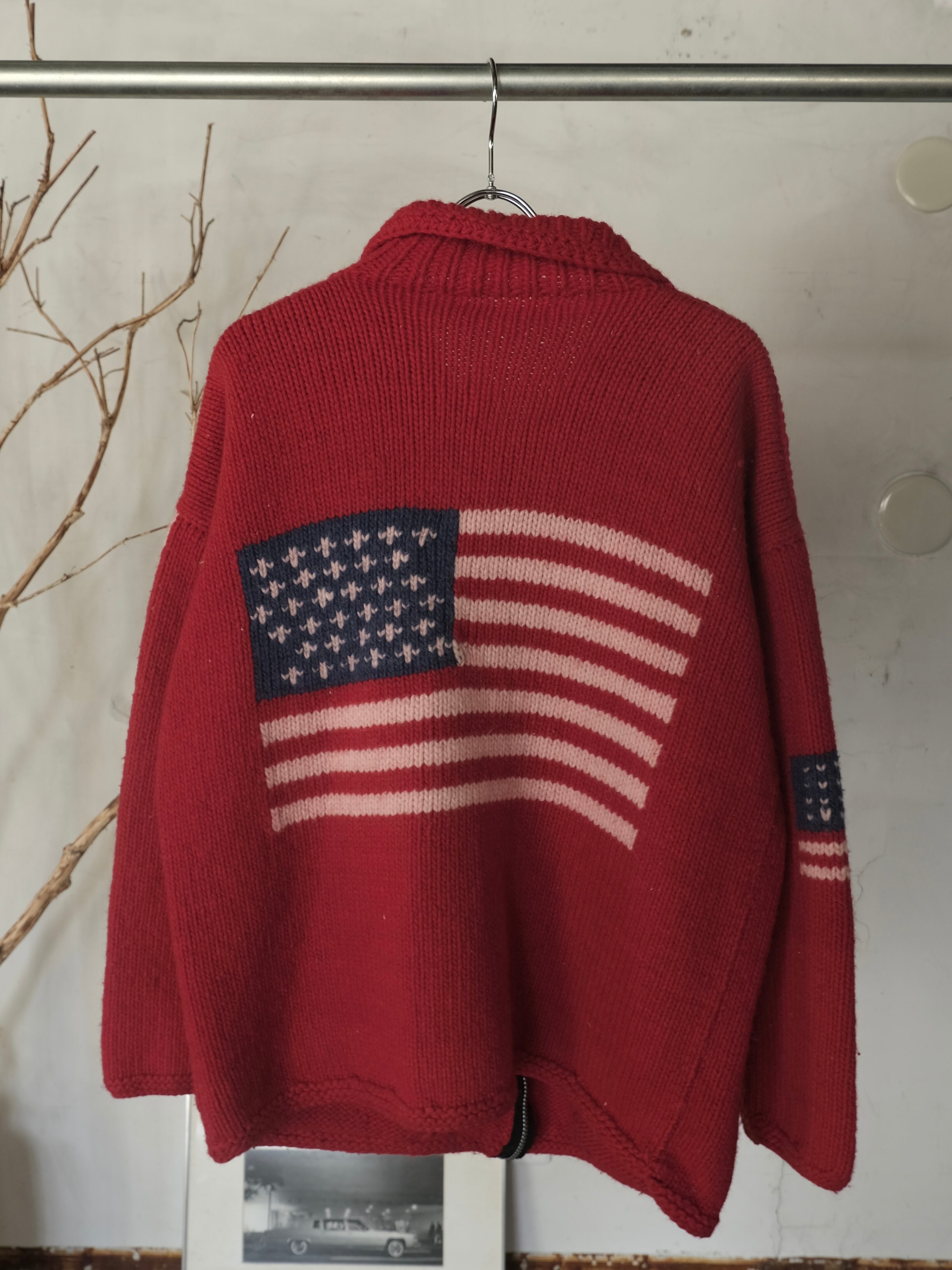 赤ベースのジップアップニットに大胆な星条旗柄が編み込まれた1枚です。