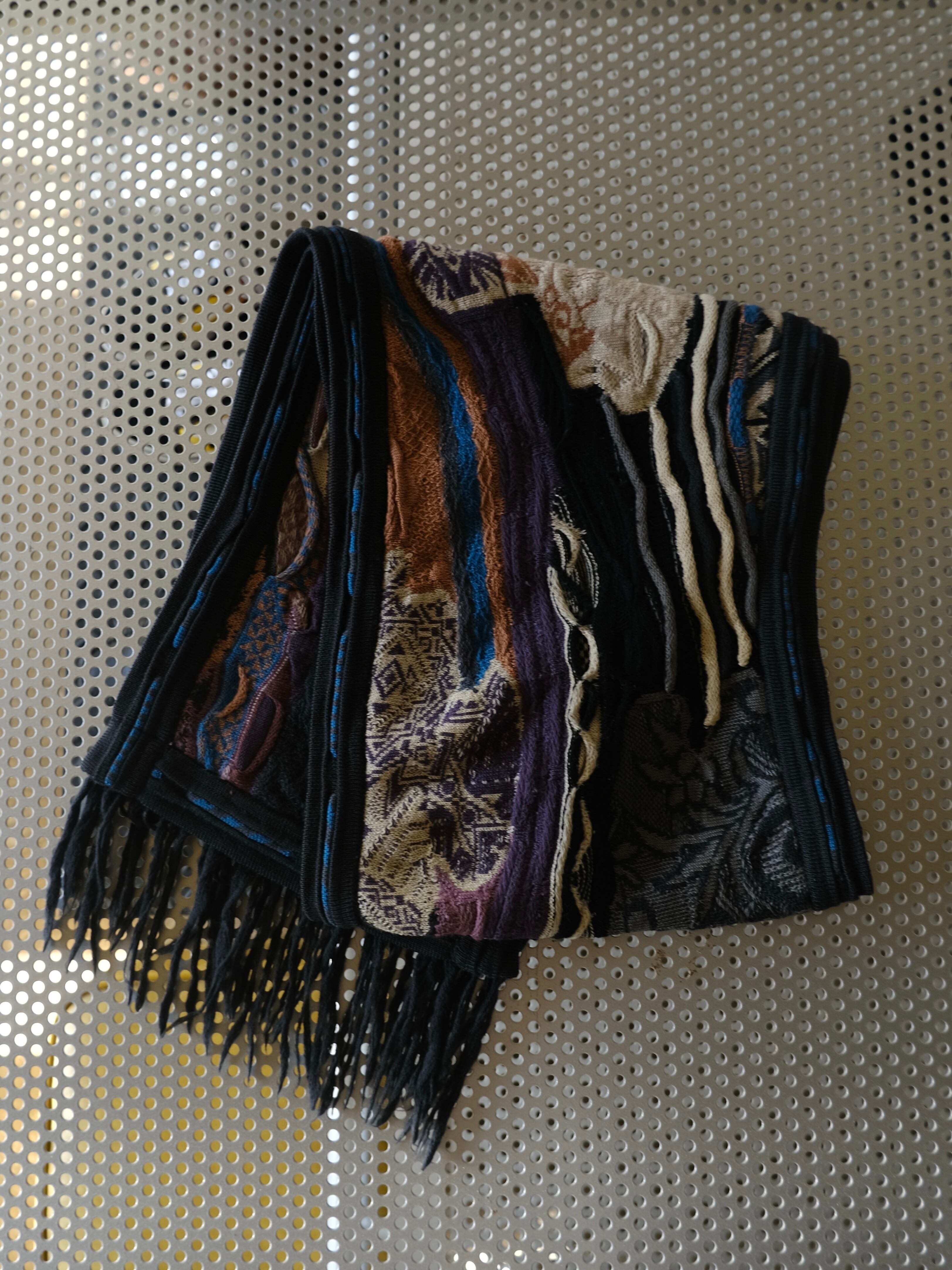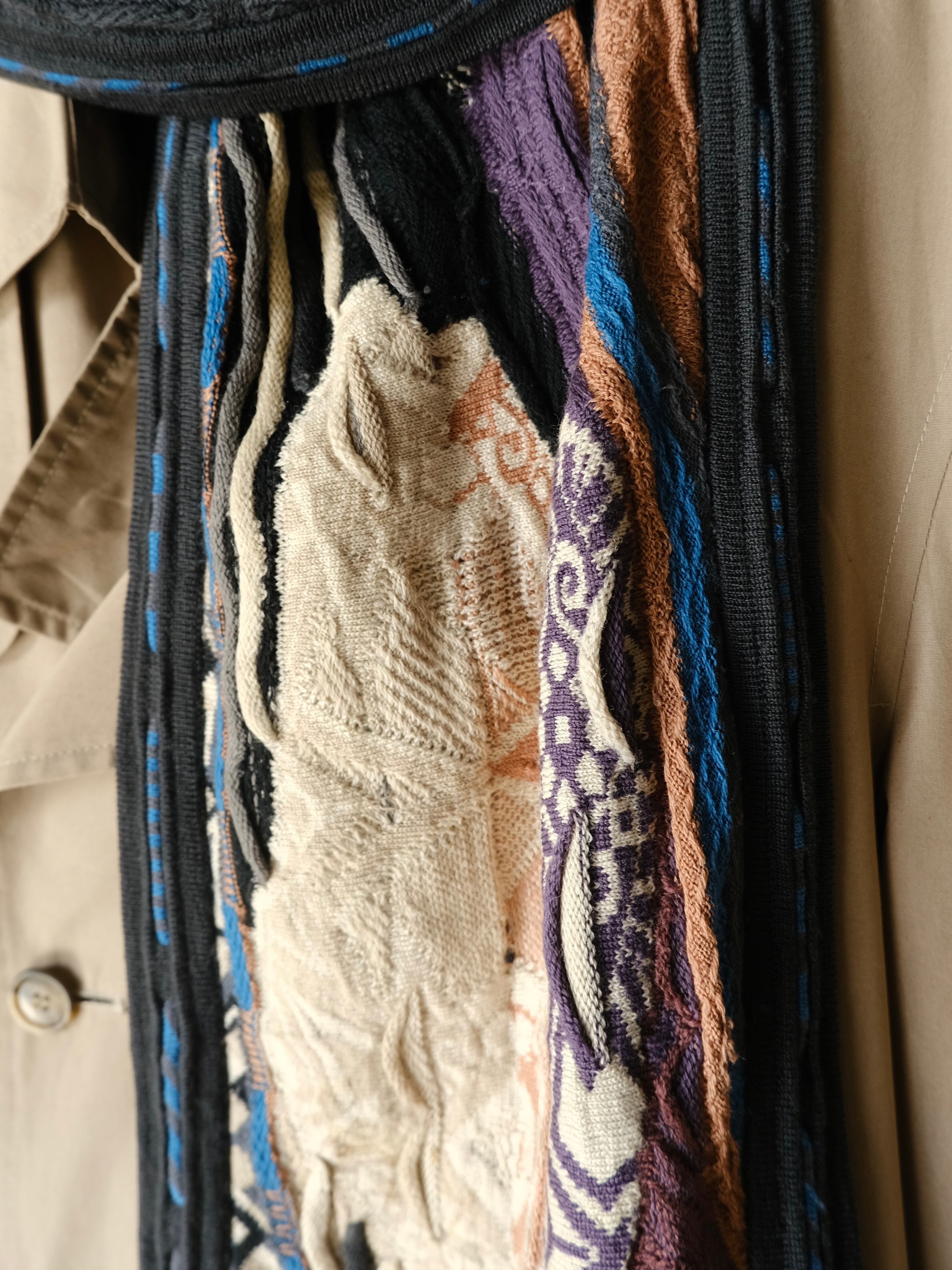 このブランドらしく独特な配色が特徴的なニットマフラー。