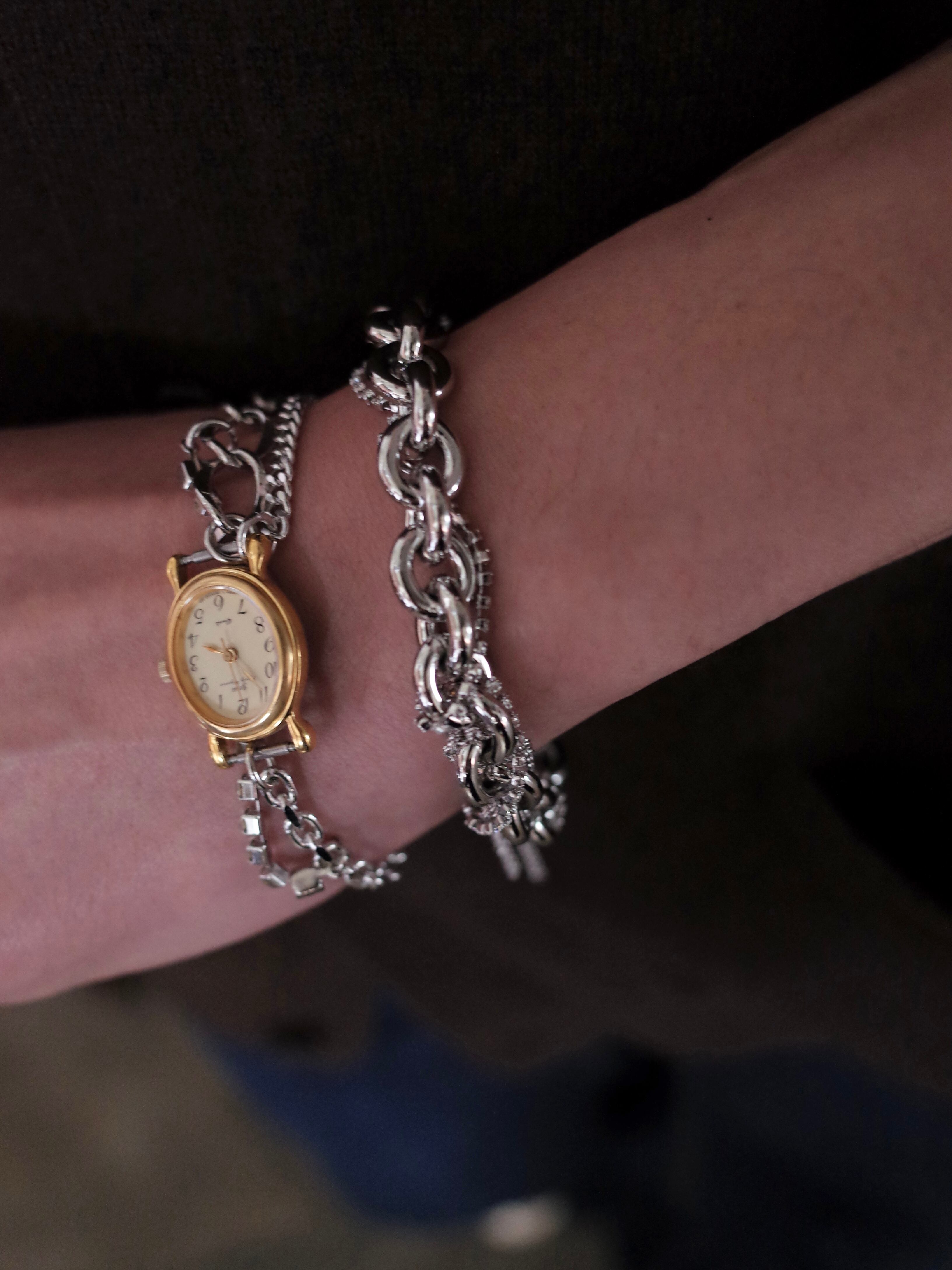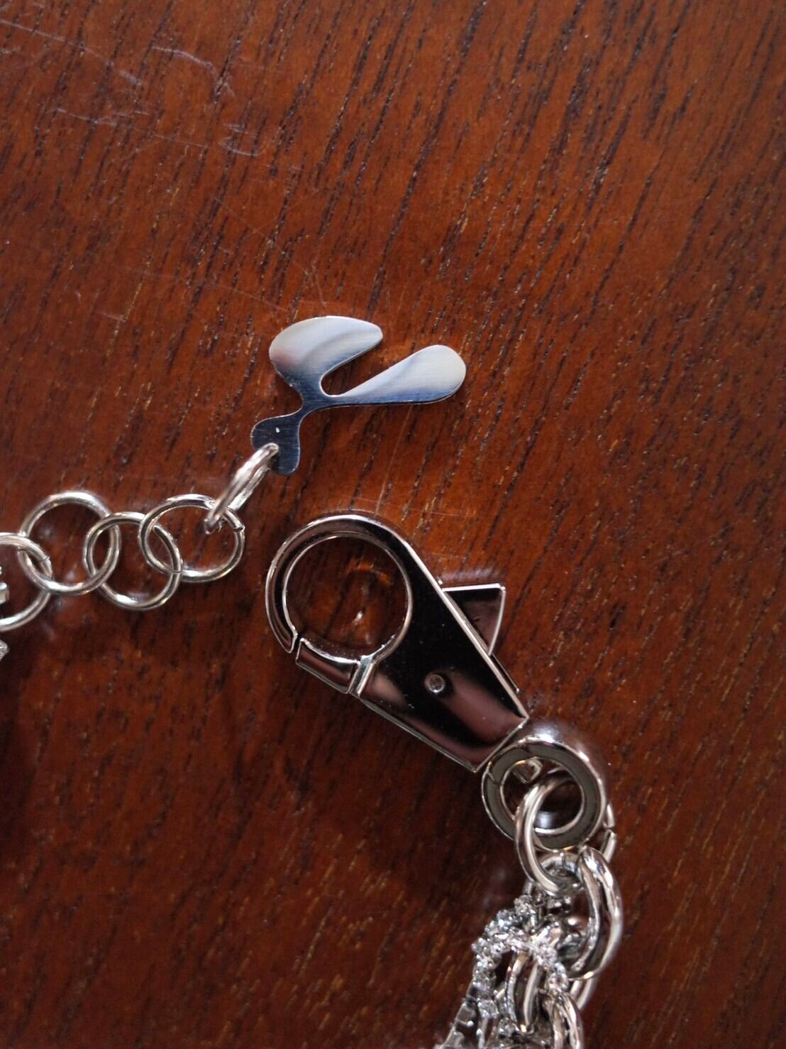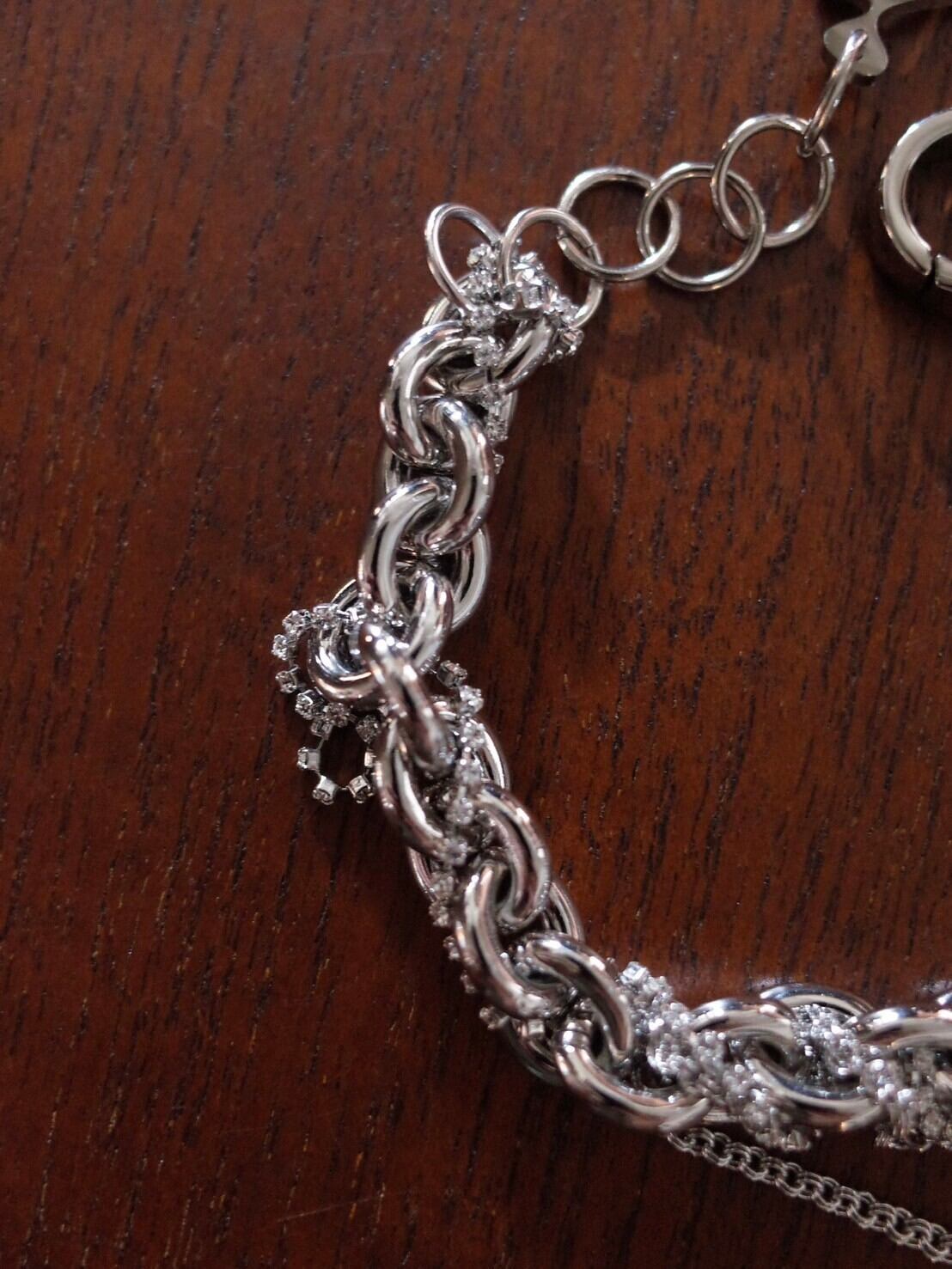 チェーンをランダムに編み込んだ後にカットする事で"切れたミサンガ"を彷彿とさせるデザイン。
