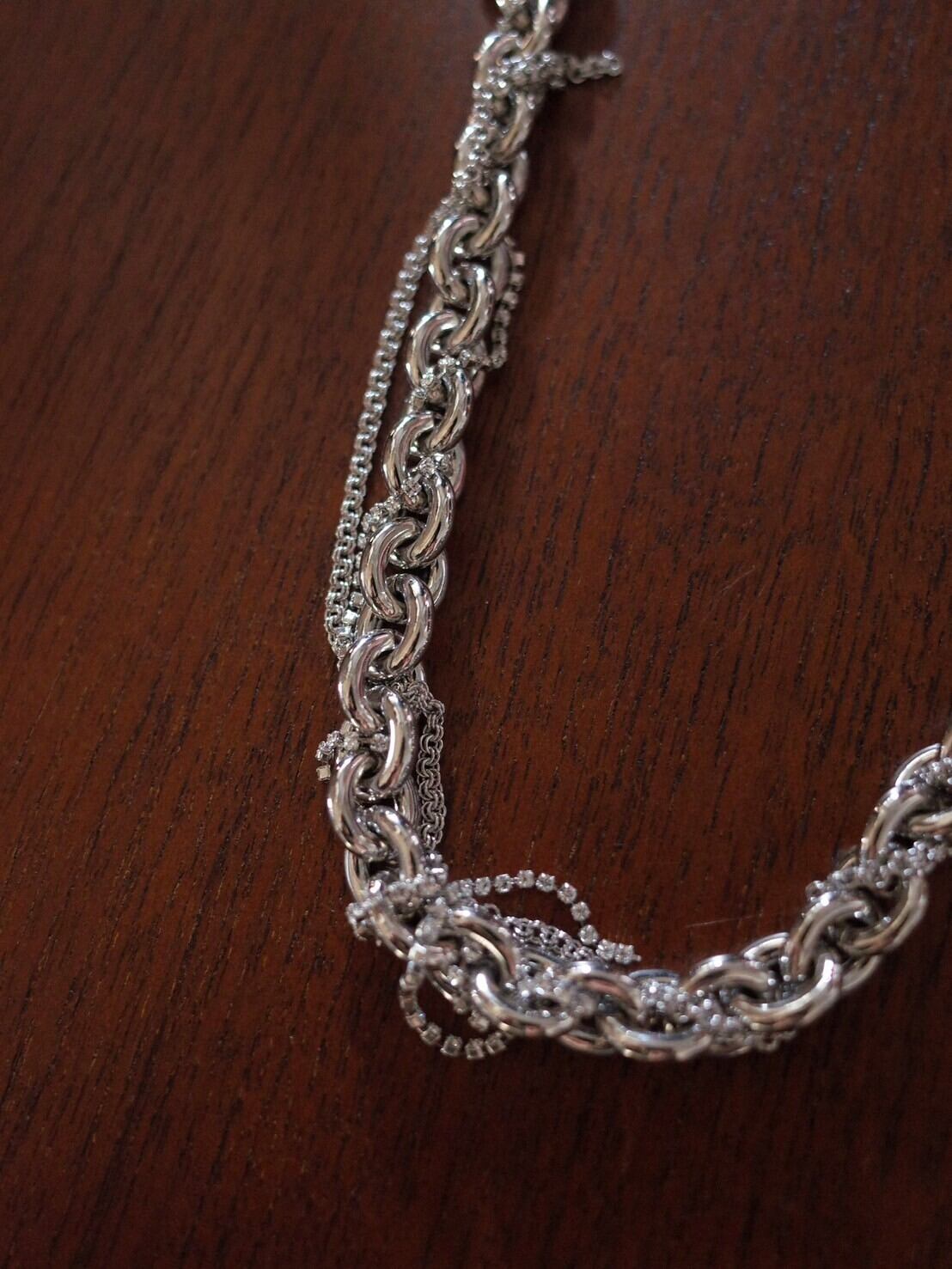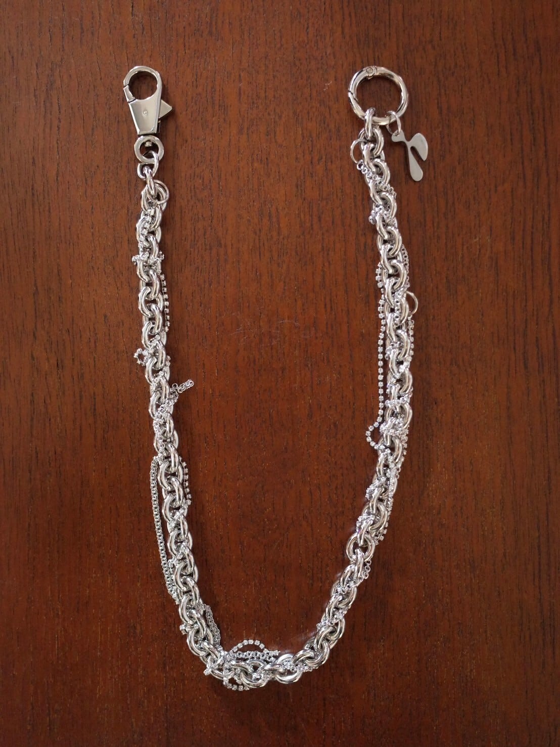 チェーンをランダムに編み込んだ後にカットする事で"切れたミサンガ"を彷彿とさせるデザイン。