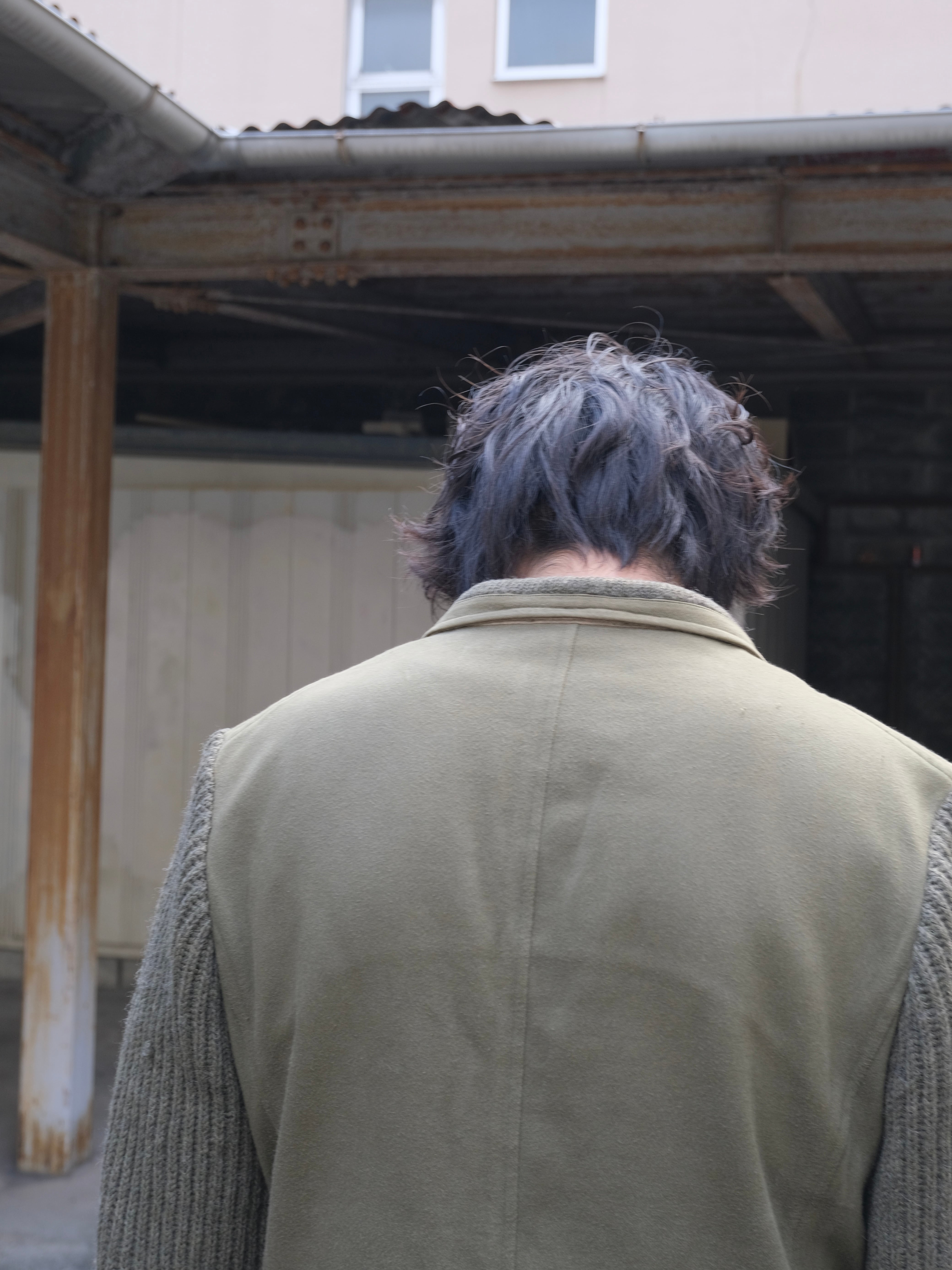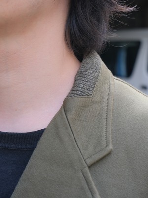 野暮ったくなりがちなグリーンカラーのテーラードの袖を切り替えることにより